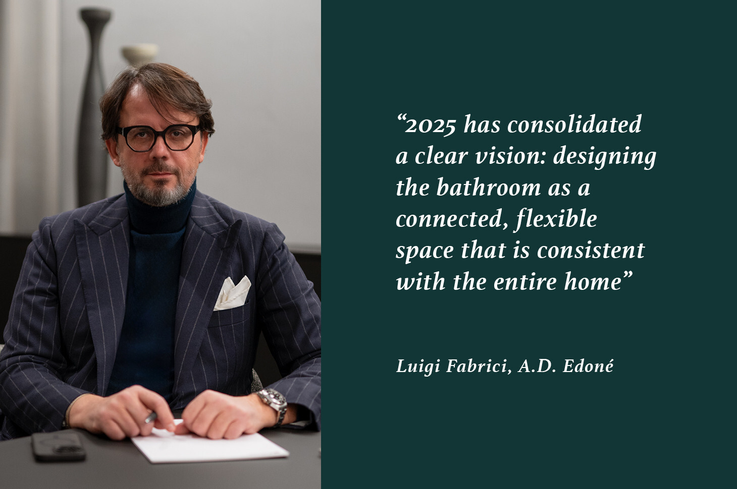 Together with Luigi Fabrici, CEO of Edoné, we look back at a 2025 shaped by product design, organization and people—another year in which the bathroom confirms its role as a connected, coordinated and increasingly central living space within the contemporary home.