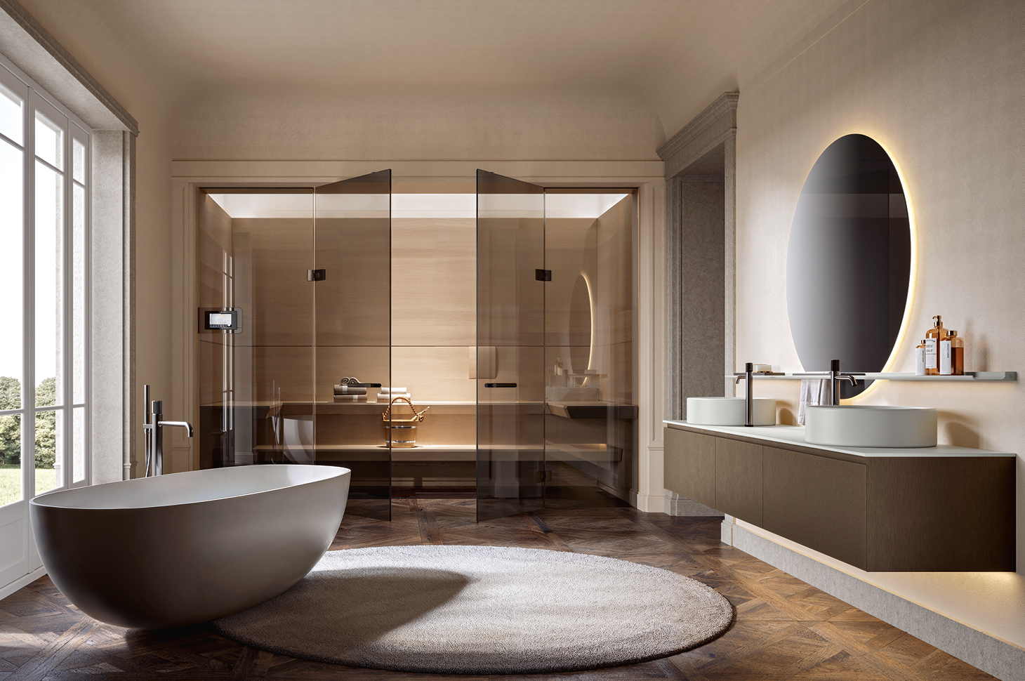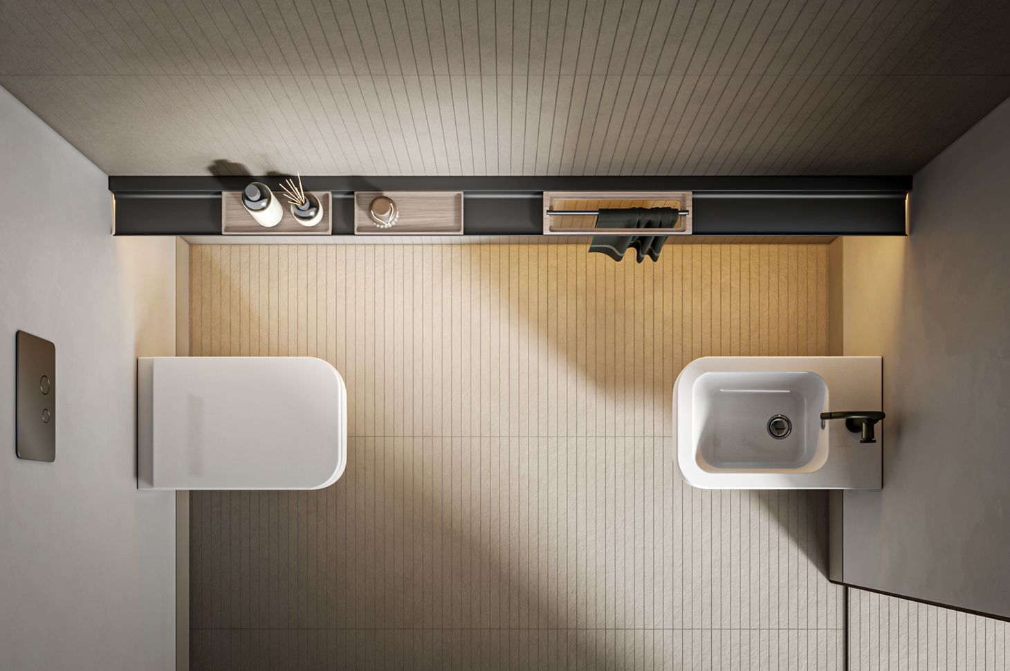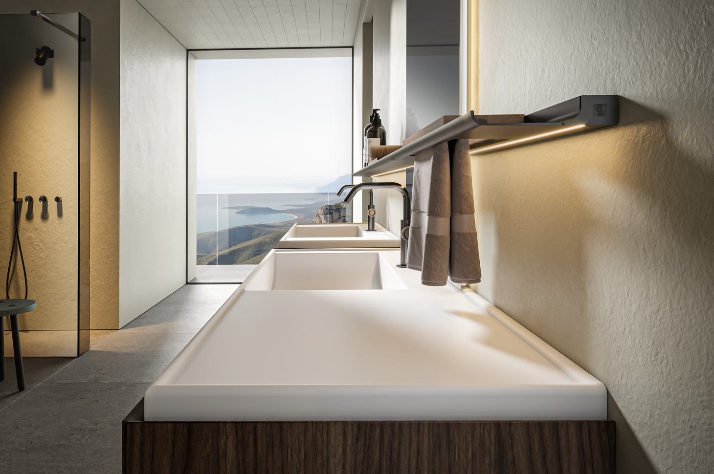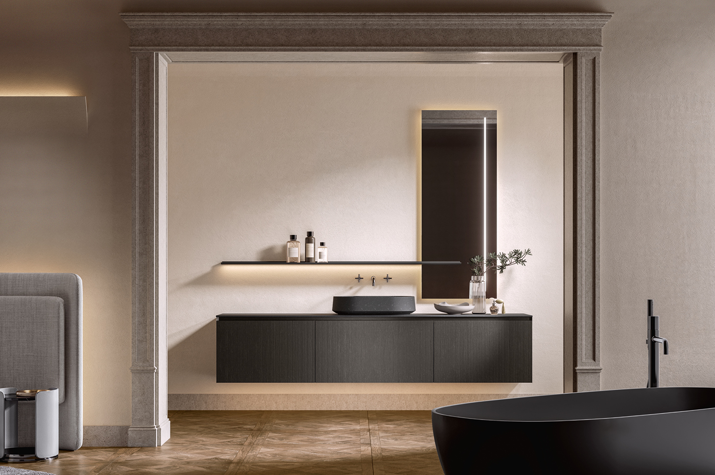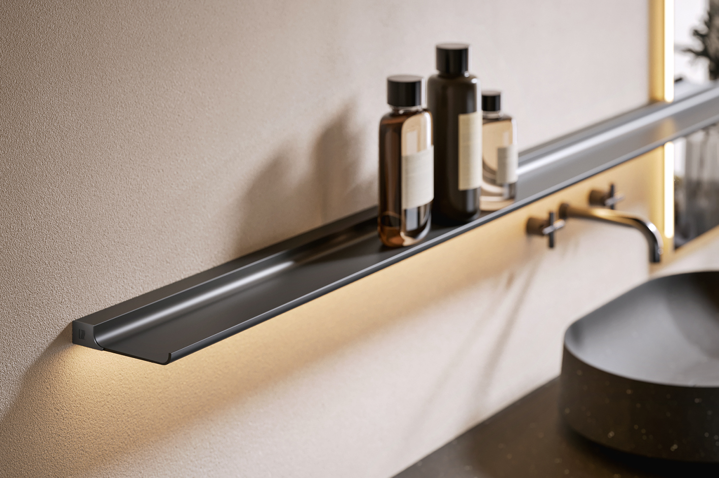 Tauro is flexible in design and installation. The most traditional mounting option is fully wall-mounted, allowing the shelf to function independently, completely detached from the mirror. Alternatively, a mixed installation is possible, partially wall-mounted and partially overlapping the mirror—ideal for projects that seek to create an interplay of elements. Finally, the most striking option features Tauro as a continuous over-mirror line: an uninterrupted design that seamlessly crosses planes and materials while maintaining the integrity of its form and integrated lighting.