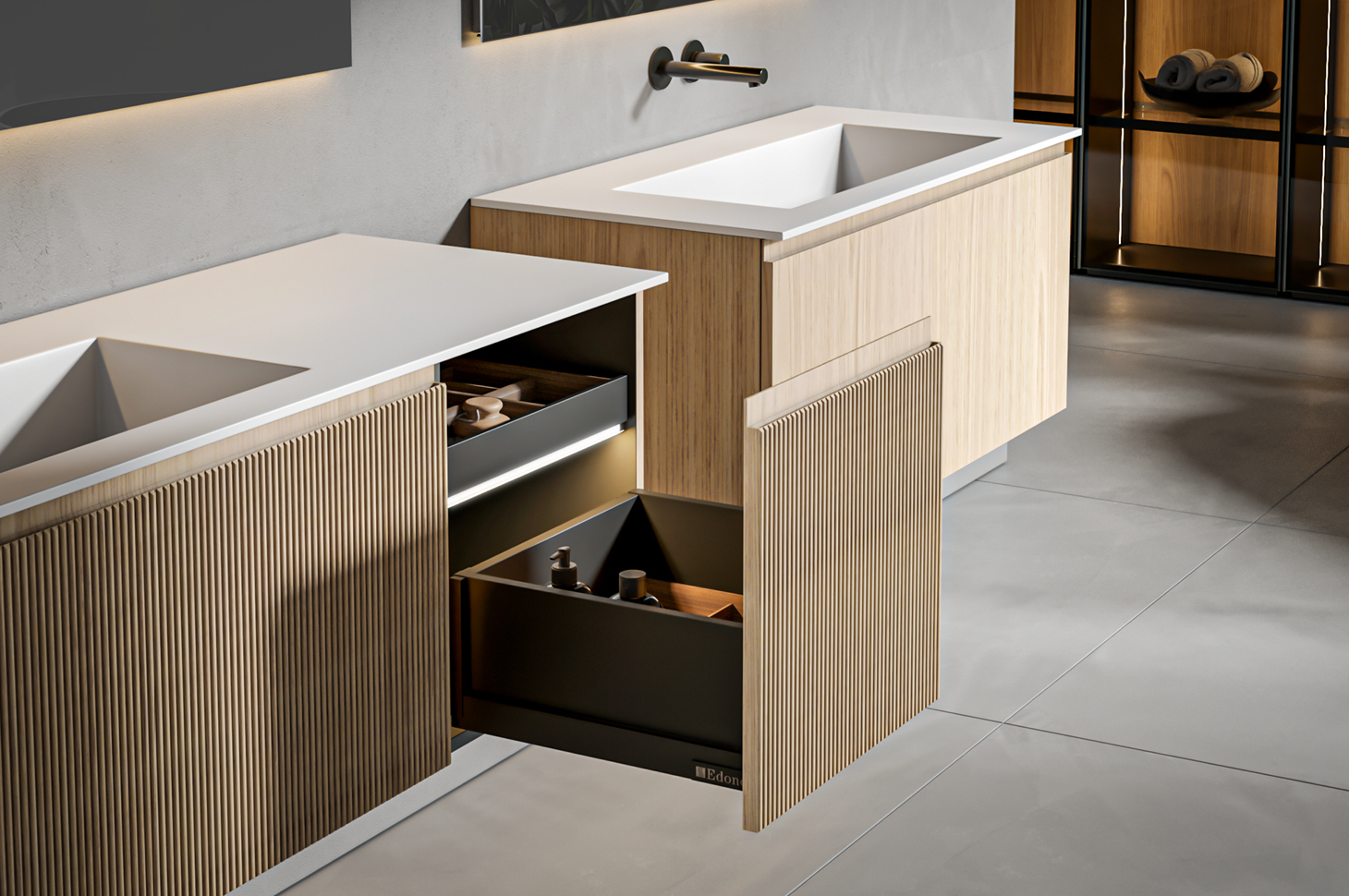 Beyond practicality, these lighting solutions enhance the overall ambiance, creating a warm and inviting atmosphere that transforms the bathroom into an even more pleasant space. More than just a functional addition, integrated lighting serves as a design element that highlights the structure and beauty of the furniture, adding an elegant and sophisticated touch. Discover more Edoné lighting solutions here.