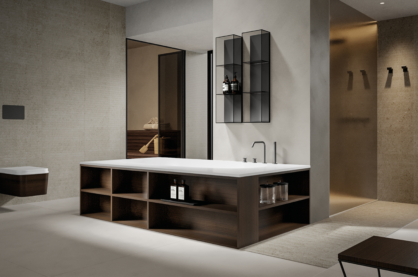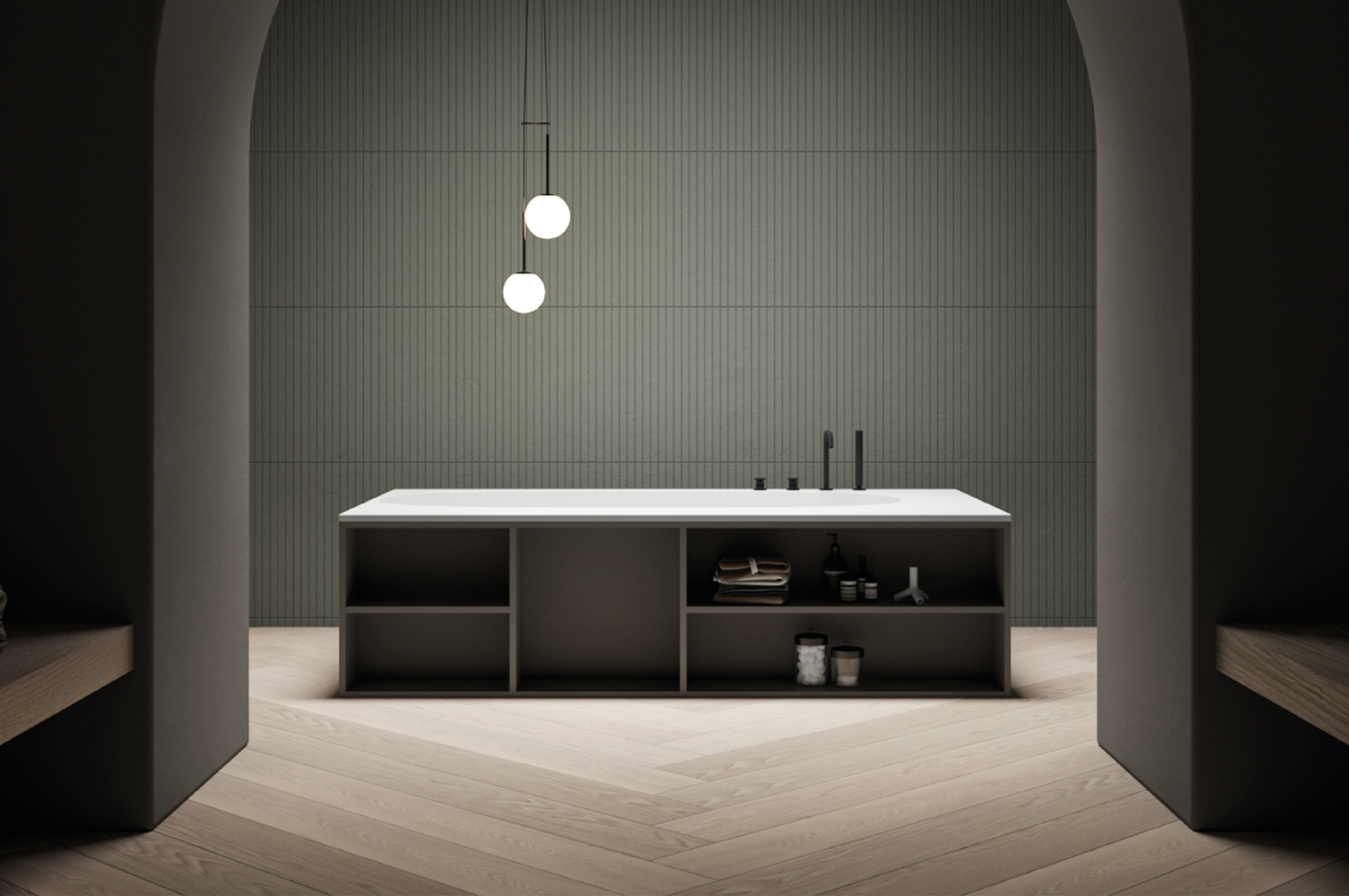 Available with an internal finish in Stonematt and Stonelight, it lends itself to all installation solutions thanks to the external panelling. It can be placed in the centre of the room or against a wall (single, double, or niche), choosing a fully exposed, semi-recessed, or flush floor installation. You can also request customisation of the upper surface dimensions. Finally, but certainly not least, the external panels can be requested in all Edoné Matte Lacquered MDF finishes, in Thermotreated and Natural Wood finishes, in Warm by Kerakoll, and in the exclusive Grit Bio Resin finish.
