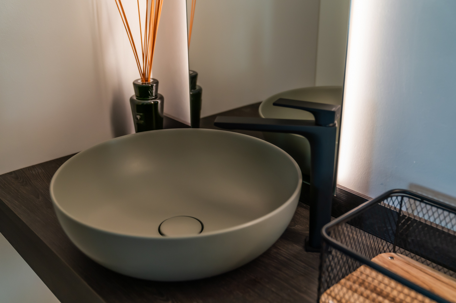 Deva countertop washbasin in Argilla Green finish with Irregular mirror.