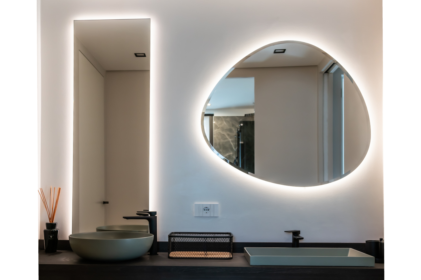 Catino countertop washbasin in Argilla Green finish and rectangular mirror with LED backlit on three sides.