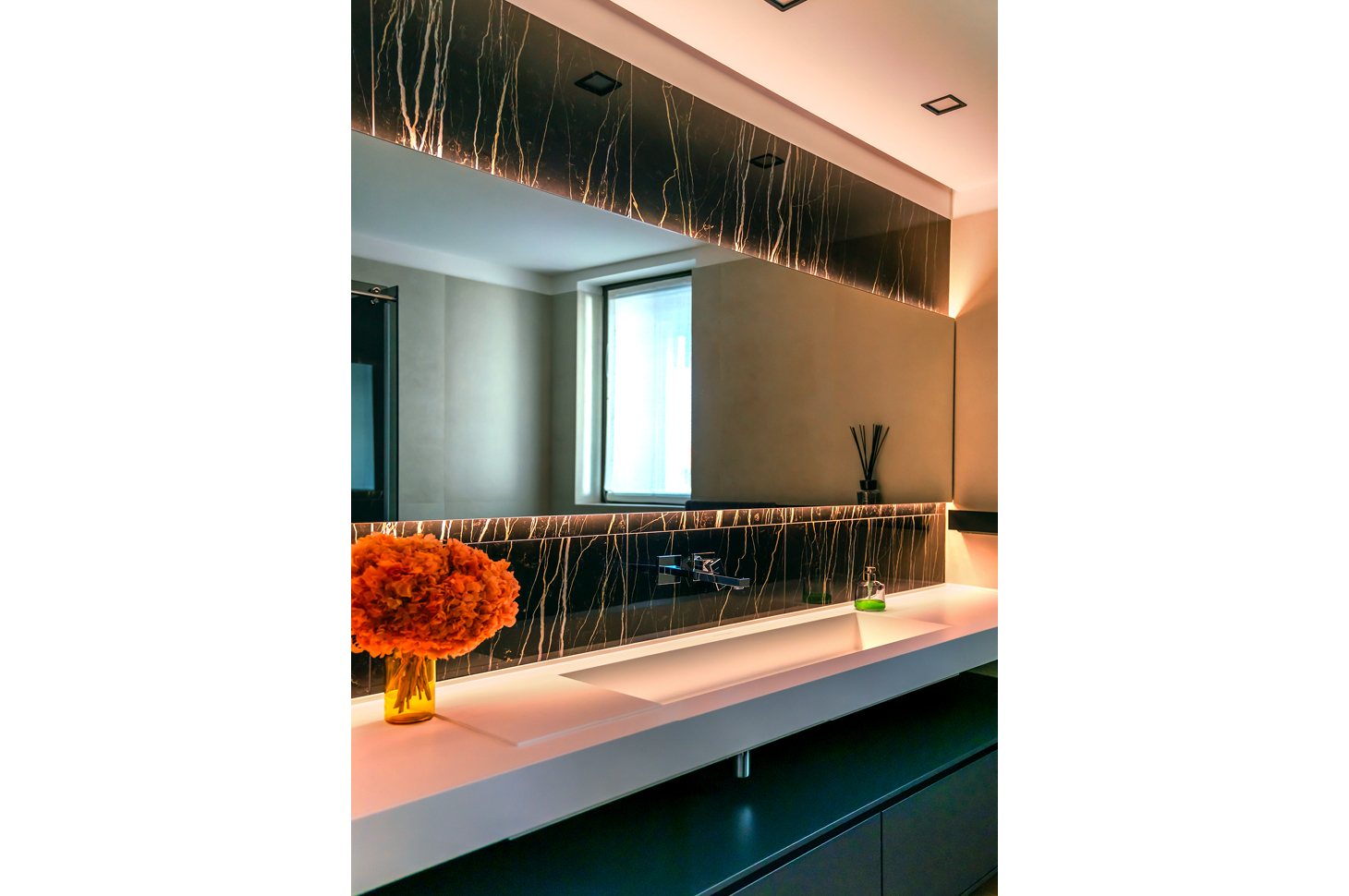 Mirror with custom-made LED backlighting and towel shelf in black China finish