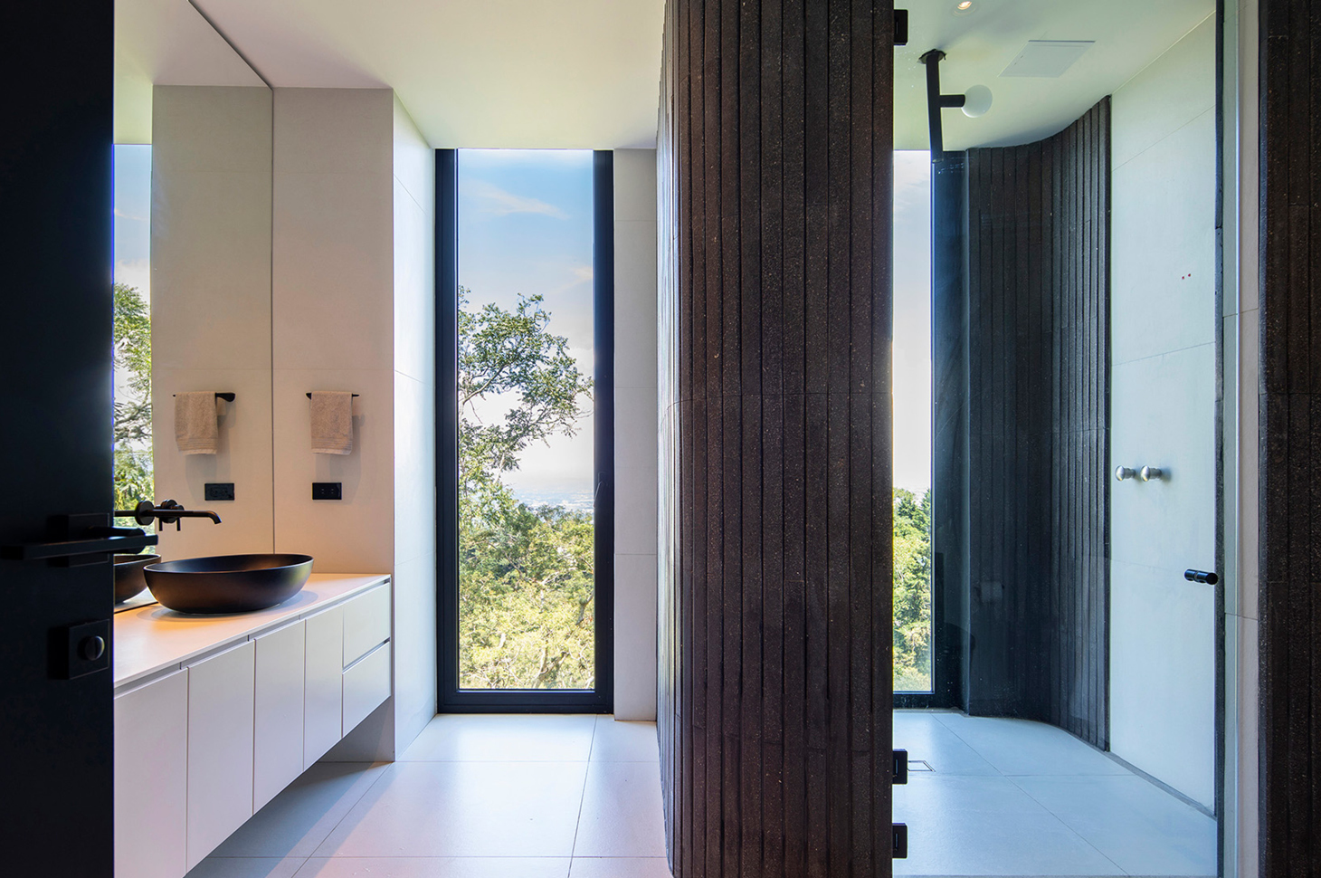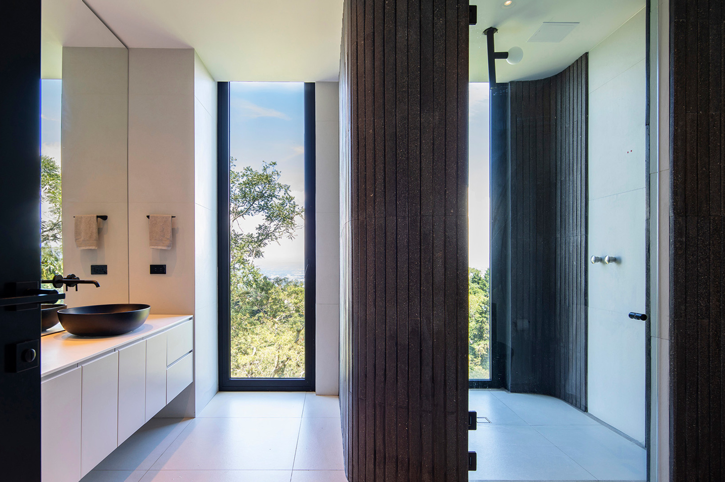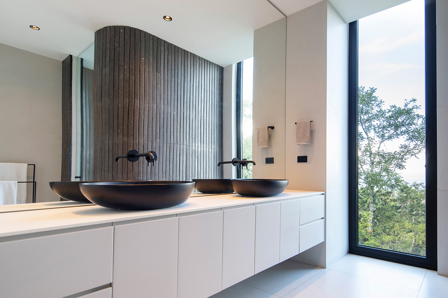 Luxury residences in this area always offer wide open spaces, such as inner courtyards, panoramic terraces and lush gardens. And this quest for continuity extends into the interior spaces as well: the finish in the soft, natural tones of chestnut, embellished and emphasized by the Veneziana texture, supported by the minimal elegance of the Eos design were the perfect combo to complement this bathroom (bathroom2) with its panoramic glass window, reflected in a full-wall mirror.
