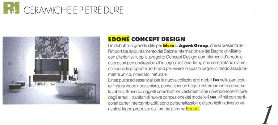 Un debutto in grande stile per Edoné di Agorà Group, che si presenta all'importante appuntamento del Salone Internazionale del Bagno di Milano con ulteriori sviluppi al progetto Concept Design: complementi d'arredo e accessori personalizzabili all'insegna dell'eco-living che completano e arricchiscono le proposte del brand per vivere lo spazio bagno in modo assolutamente unico, ricercato, naturale.