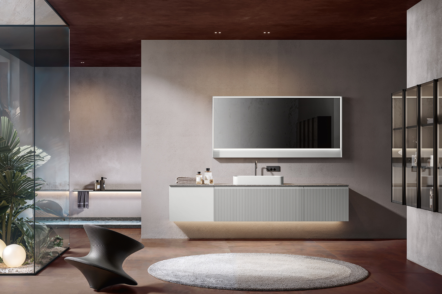 The defining feature of the Eros collection is its cannetted texture, accentuated by the distinctive 45° edge cut and integrated handle grip within the door. These elegant details once again highlight Edoné's dedication to craftsmanship, even in this new solution crafted from pressed polymer. Compact, stable, moisture-resistant, and easy to maintain, Eros brings the beauty of cannetted design to life, making it accessible for any installation context without compromising a single ounce of style. It’s a proud choice that meets specific market demands while maintaining unwavering standards of design and quality.