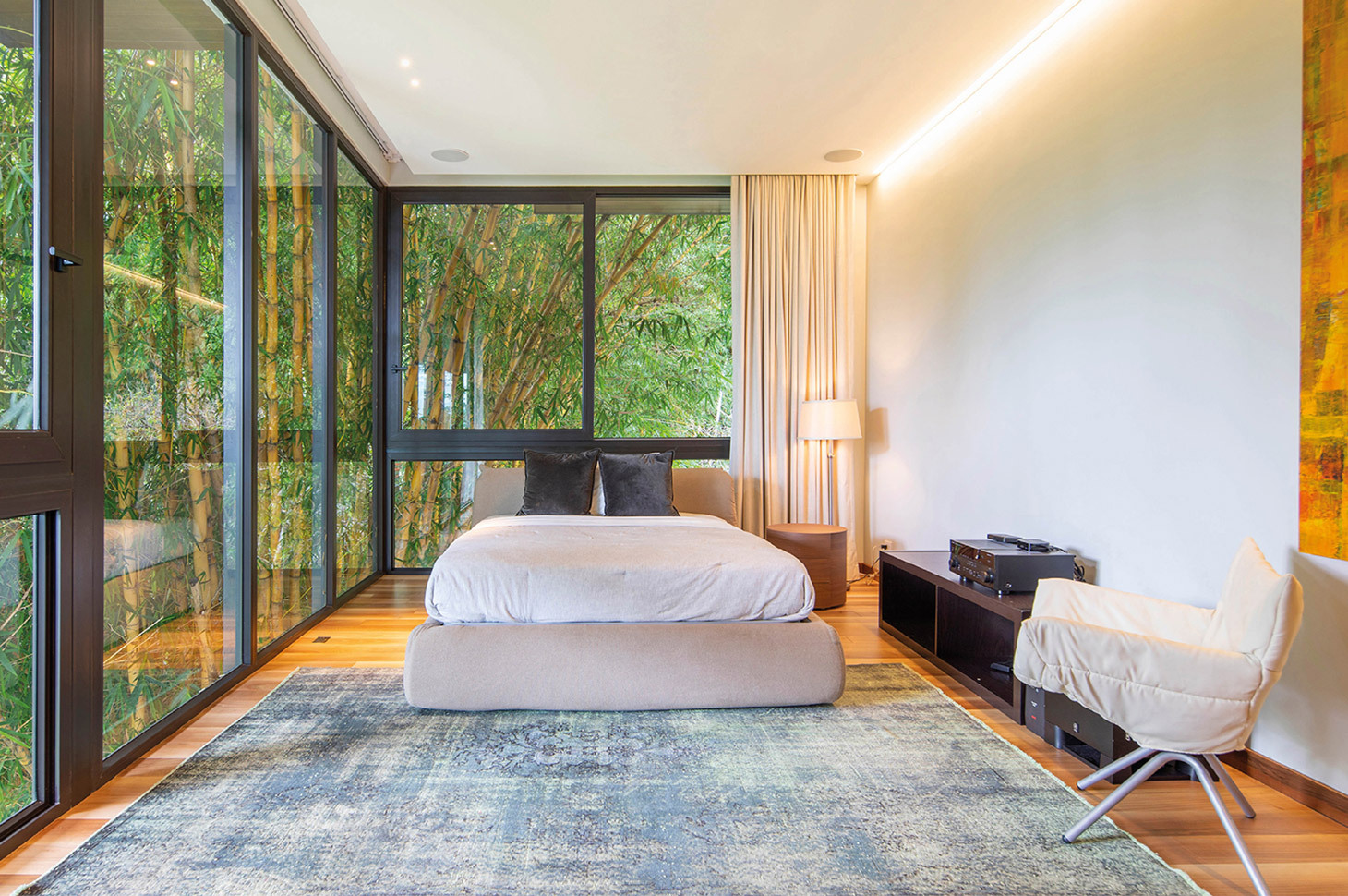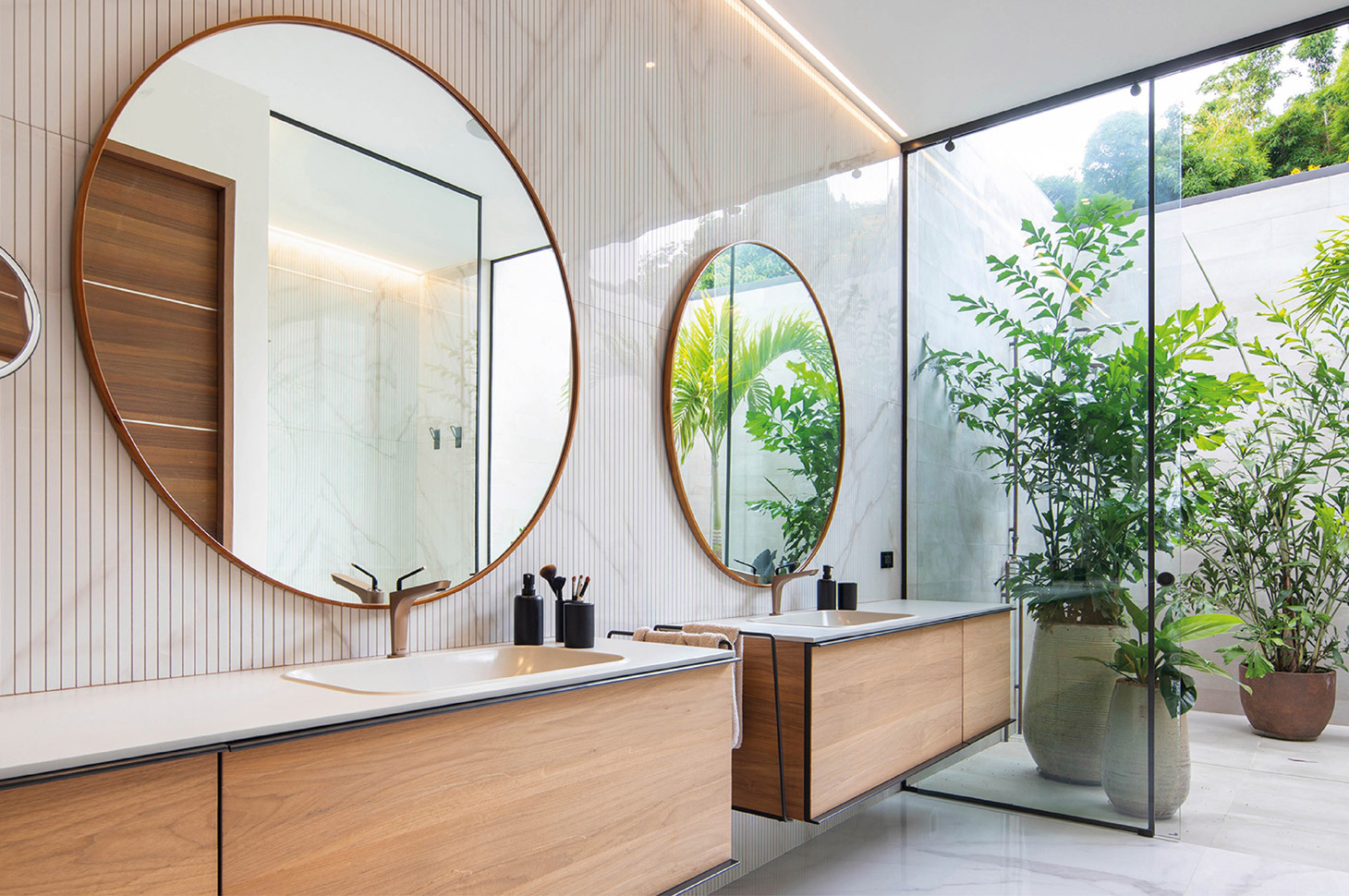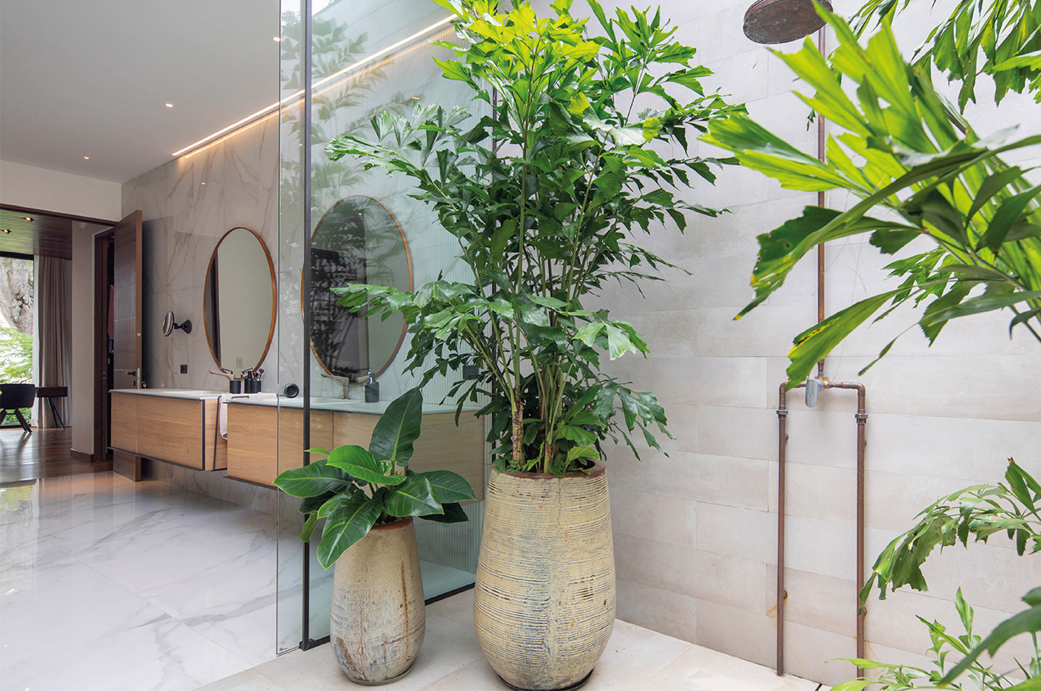 Casa Las Vistas si sviluppa su tre piani, per un totale di più di 700mq. In ogni ambiente è chiara ed evidente la ricerca di un dialogo costante con la rigogliosa natura esterna, ottenuto grazie ad ampie e panoramiche vetrate o, addirittura, grazie spazi che si sviluppano in modo misto, con una parte coperta e una all’aperto. Come accade, ad esempio, nel bagno padronale, in cui gli ampi e confortevoli spazi interni si integrano, grazie ad una apertura vetrata, con un altrettanto ricercato patio, attrezzato con piante in vaso e con doccia esterna. In tutti gli ambienti risalta la ricerca di toni e materiali naturali e terrosi, come l’ardesia, il legno e il marmo, per rafforzare quel senso di connessione tra l’ambiente domestico e il contesto in cui è ubicato.