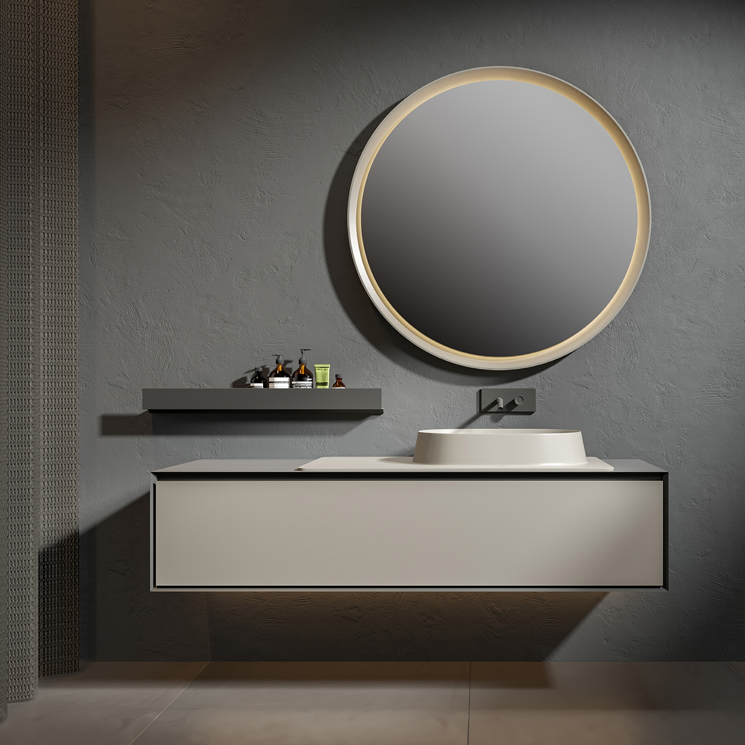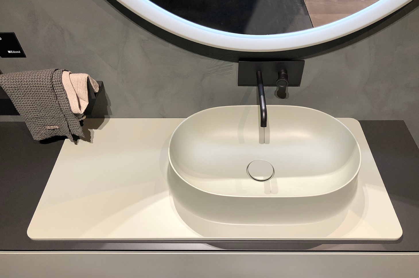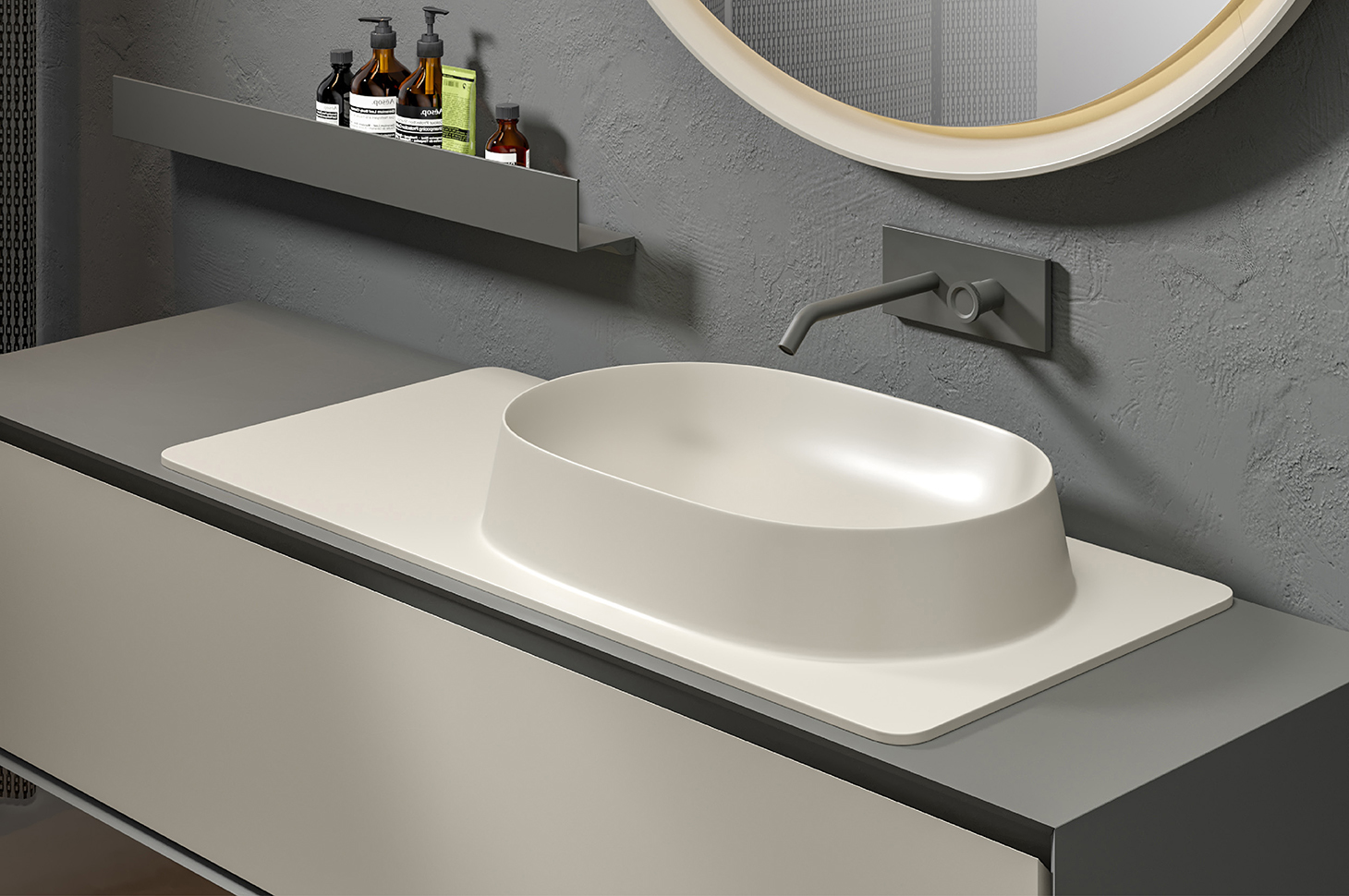 Among the new proposals Edoné presents for 2022 is the new Caldera washbasin. Its evocative name intuitively references the original idea behind the creation of this new monobloc countertop: the washbasin, with its concave form reminiscent of a volcanic crater, extends its perimeter and its functionality. Much like the stylized flow of volcanic lava, it overflows its role as a mere container, gracefully spreading outward to elegantly occupy the countertop space. It unites seamlessly into a single form, fulfilling both the functions of a hand basin and countertop protector.