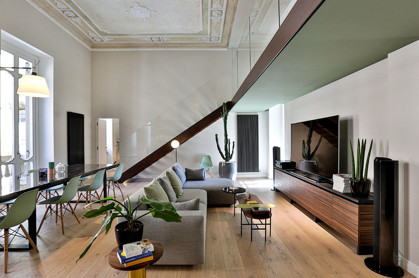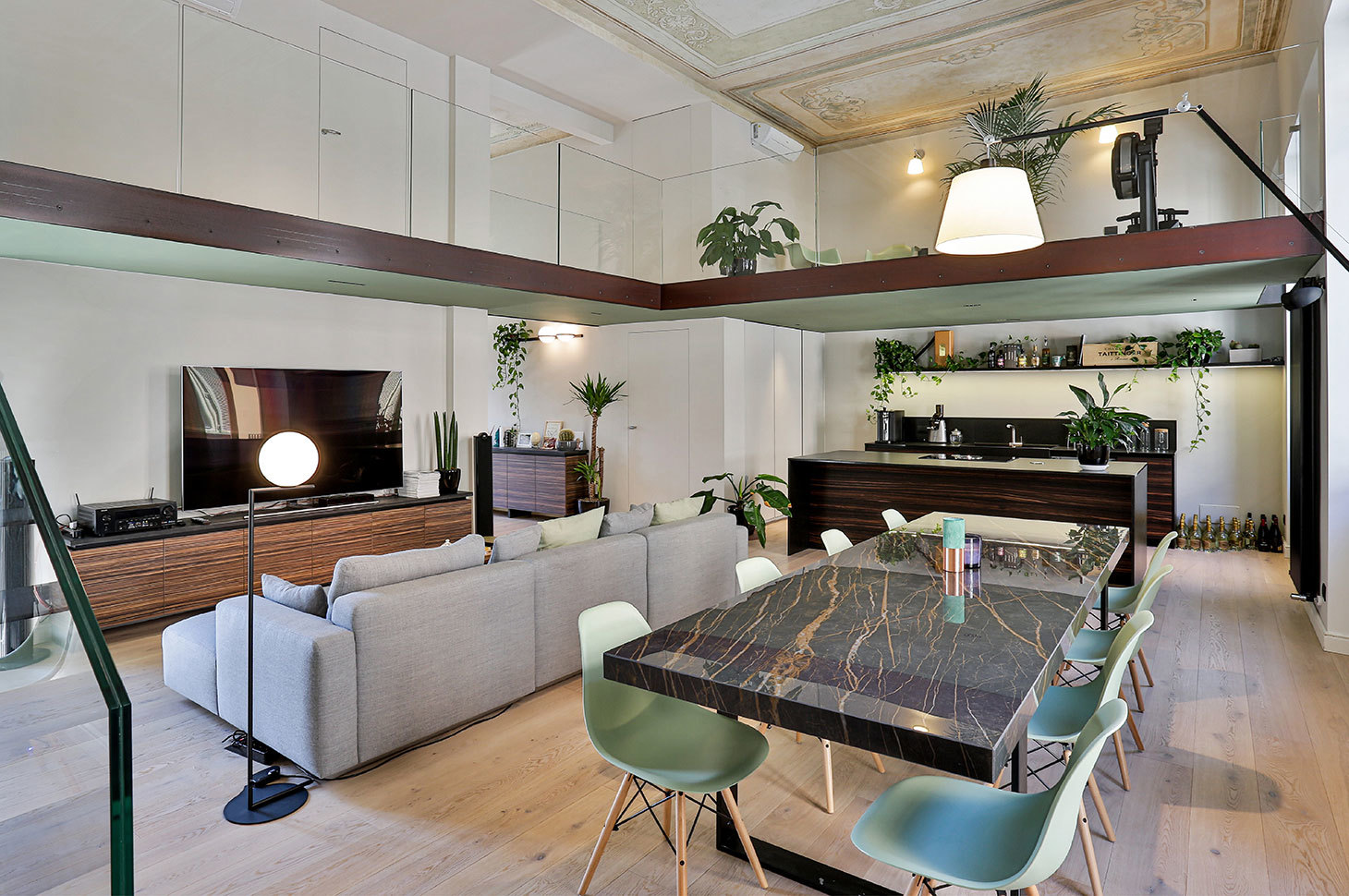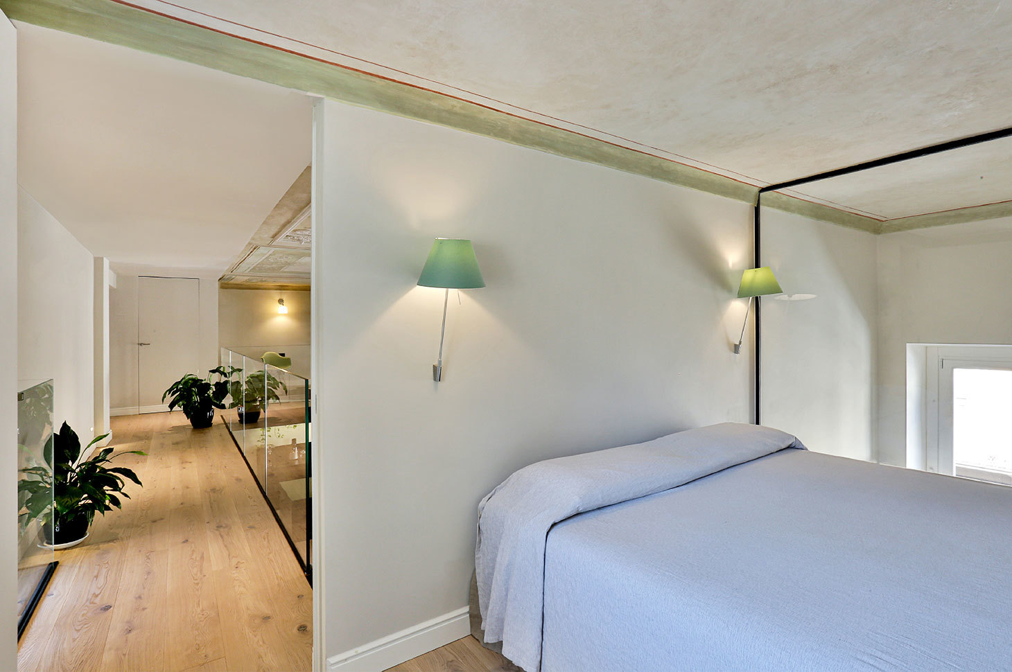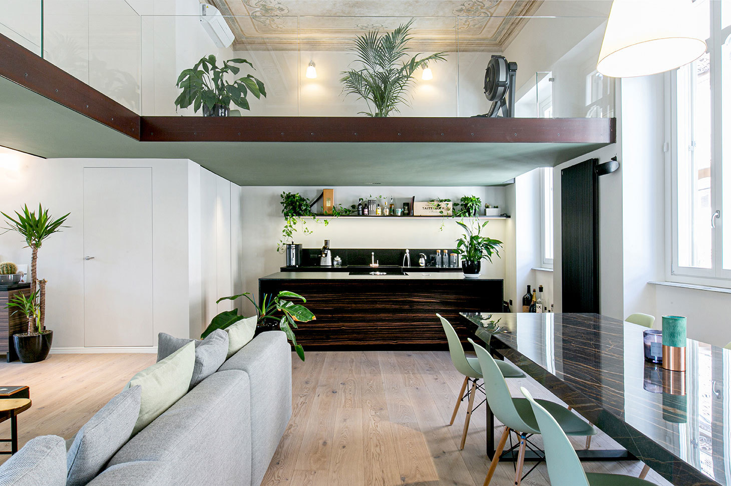 Il carattere dell’appartamento trae spunto dagli elementi stilistici ritrovati nella preesistenza: i bellissimi affreschi, ripristinati fedelmente, emergono forti nei toni del verde, colore riportato con vigore nei controsoffitti dei soppalchi. Le porzioni soppalcate, sono leggere e trasparenti, studiate per lasciare perfettamente accessibile alla vista il bellissimo soffitto, esaltandone la prospettiva. Forme avvolgenti, tonalità fresche e materiali pregiati compongono la moodboard dietro a questo progetto, in una palette dai colori impalpabili.
