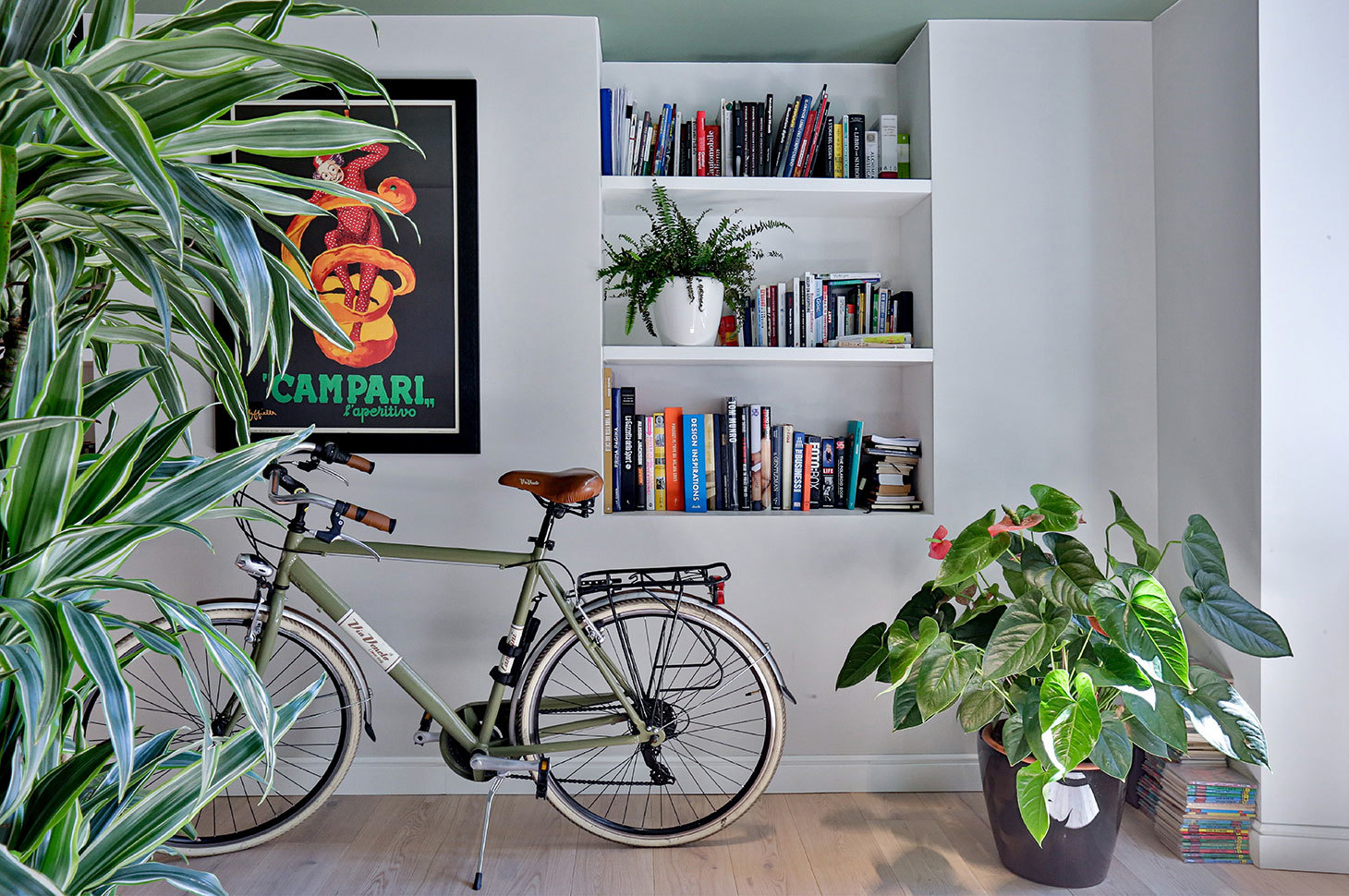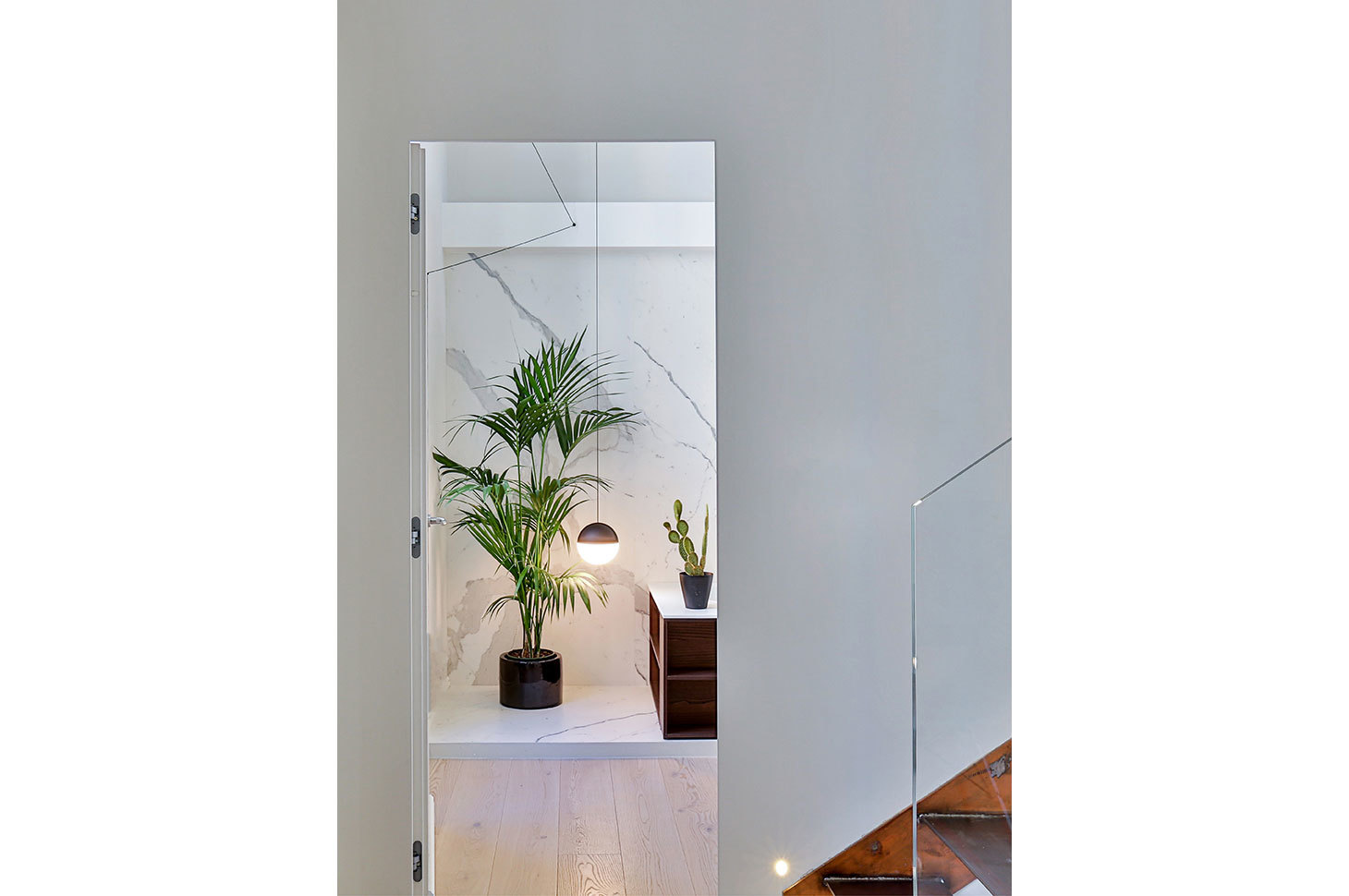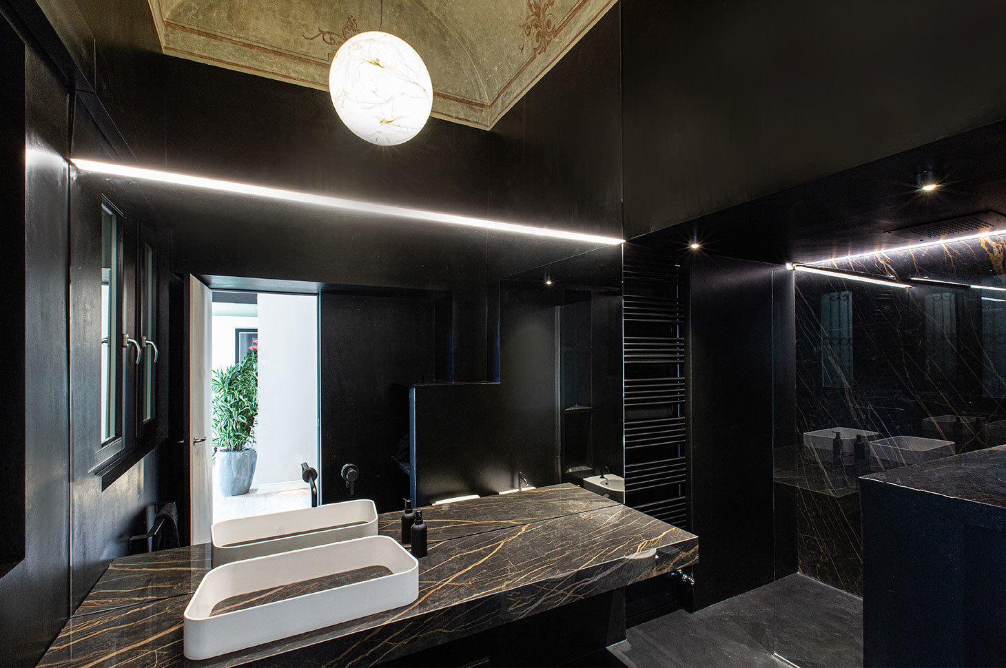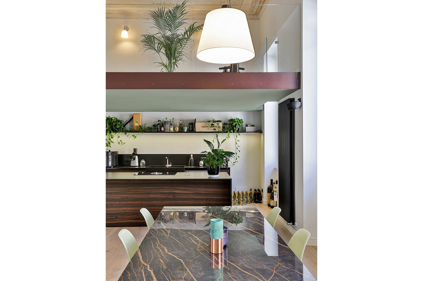 Il carattere dell’appartamento trae spunto dagli elementi stilistici ritrovati nella preesistenza: i bellissimi affreschi, ripristinati fedelmente, emergono forti nei toni del verde, colore riportato con vigore nei controsoffitti dei soppalchi. Le porzioni soppalcate, sono leggere e trasparenti, studiate per lasciare perfettamente accessibile alla vista il bellissimo soffitto, esaltandone la prospettiva. Forme avvolgenti, tonalità fresche e materiali pregiati compongono la moodboard dietro a questo progetto, in una palette dai colori impalpabili.