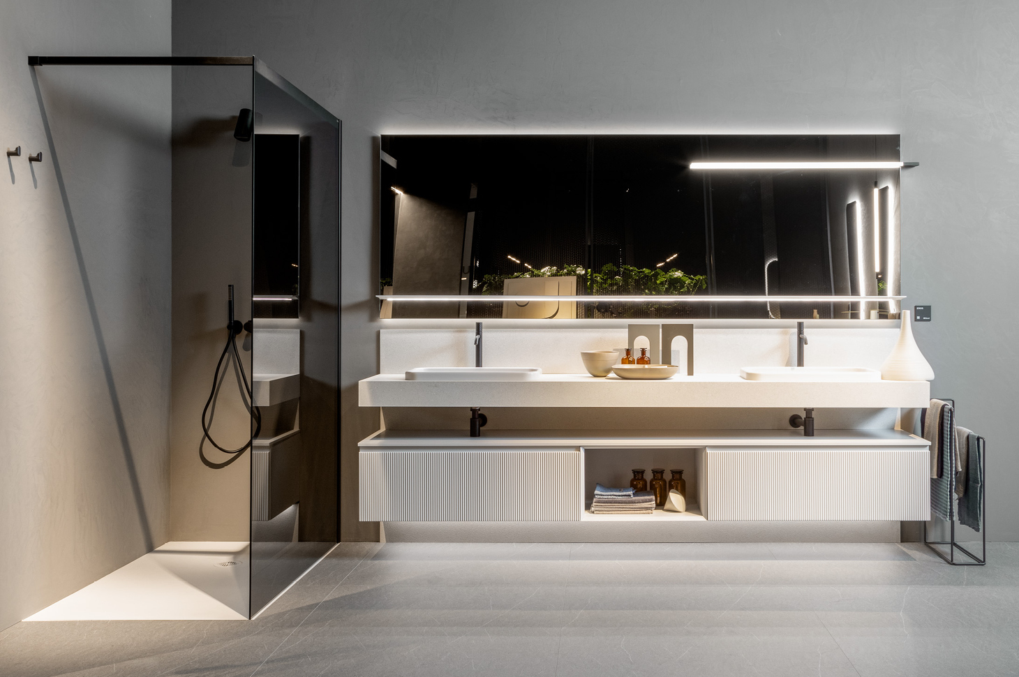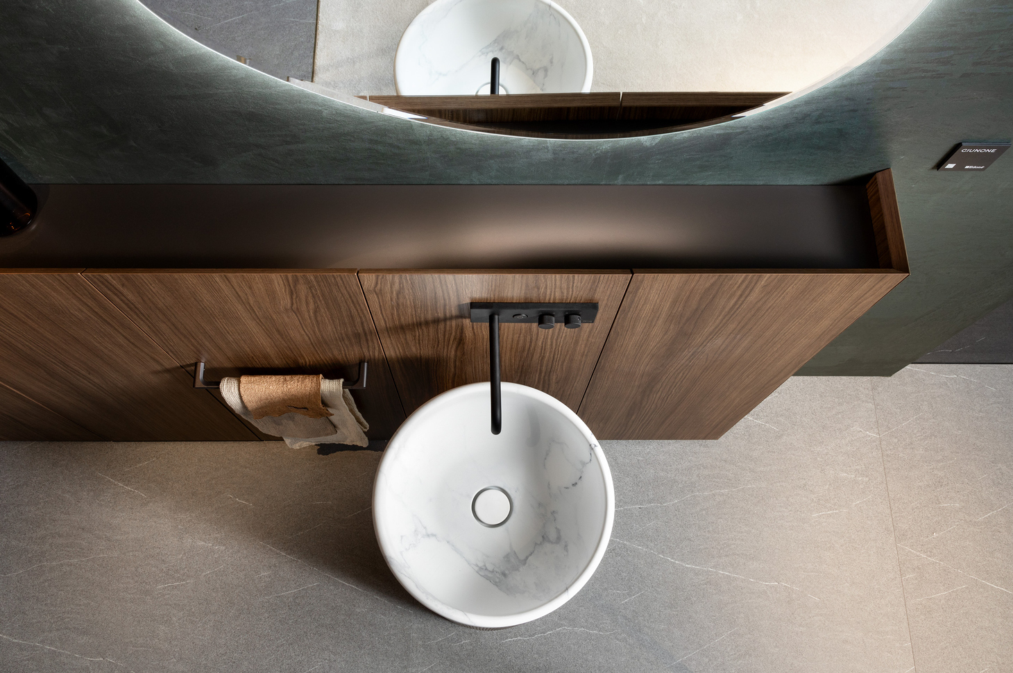 Detached from the wall, this solution allows great flexibility in positioning and designing the overall layout of the bathroom, especially in those design situations that seek distinctive elements with a strong scenic impact.