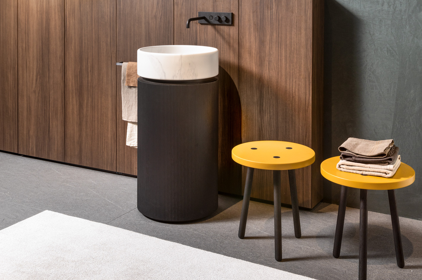 Edoné presents a preview of the Apollo washbasin also in a freestanding solution at the Salone del Mobile 2024. The generous thickness of its design and the clean lines of its form lend themselves perfectly to this solution: placed on a round floor base, its overall development has a clear reference to the aesthetics of classical columns.