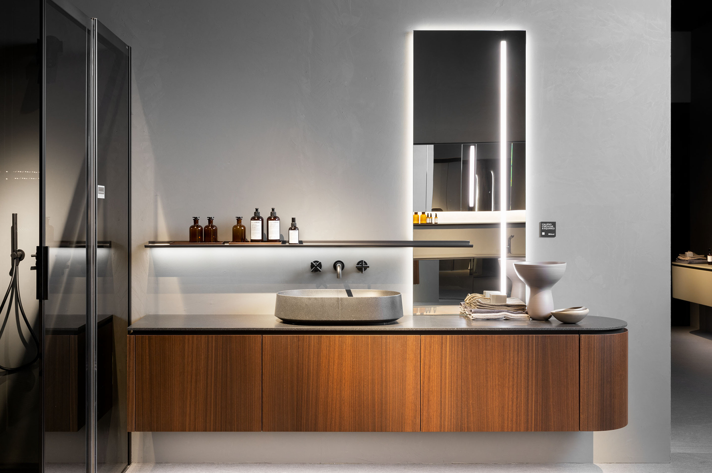 Tauro is also distinguished by three different installation proposals. A classic totally wall-mounted fixing, where the shelf expresses its functionality in full autonomy. A mixed fixing, partly on the wall and partly overlapping the mirror, for those cases where the design requirement is to seek an interplay between the elements. Finally, the most scenographic, involves the installation of Tauro as an over-mirror through-line: a continuous thread, crossing planes and materials, without interruptions, maintaining the integrity of its shape and incorporated lighting.