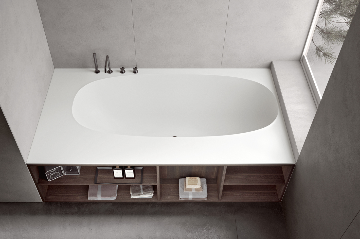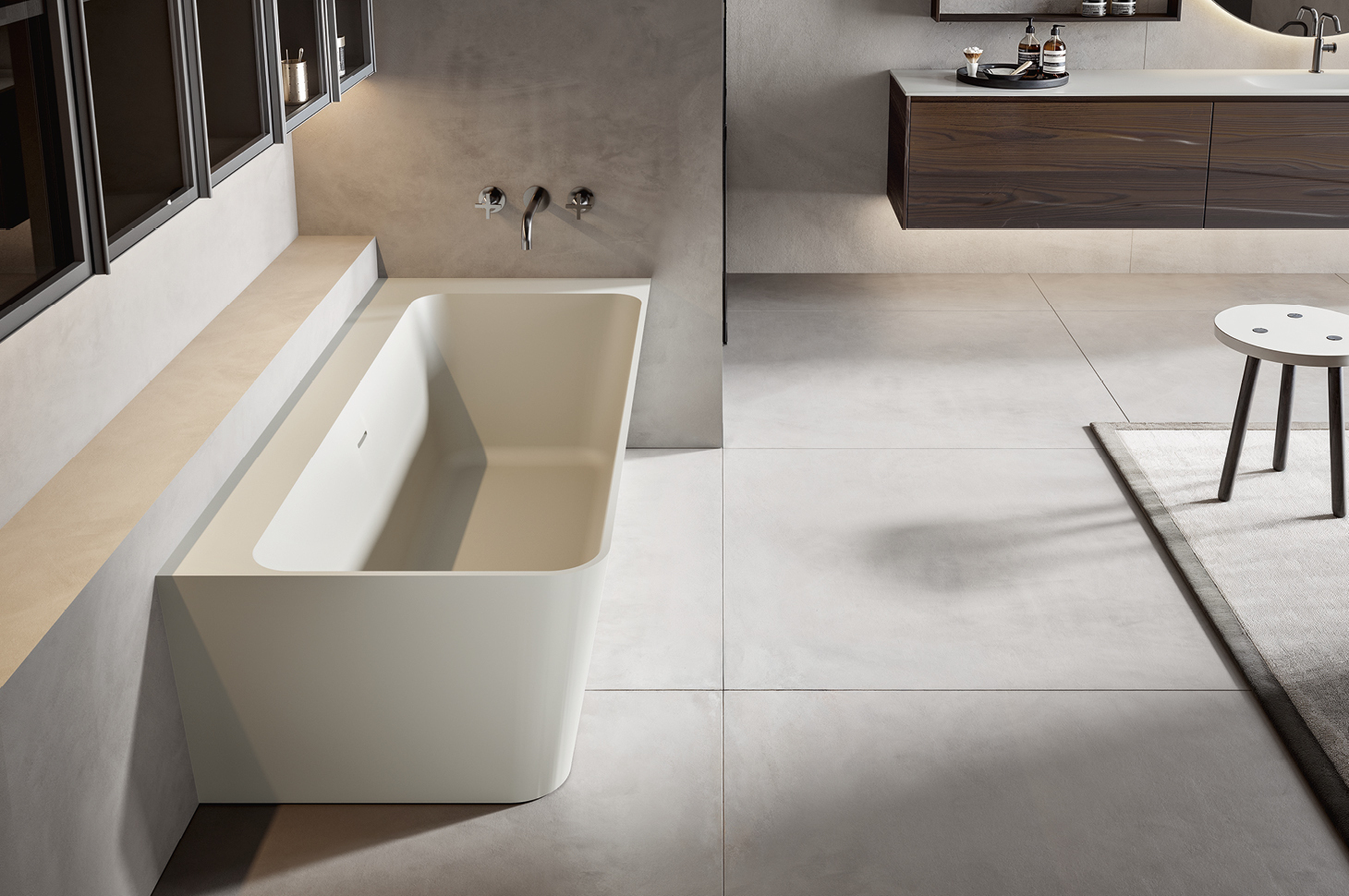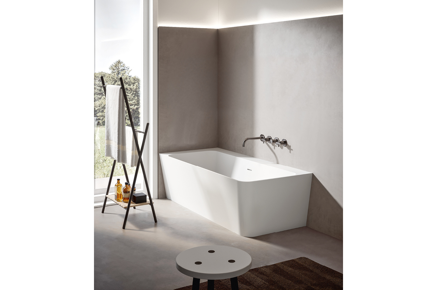 Alongside shower trays—covered in a previous article—Wellness also presents wall covering solutions and seven bathtub models, some of which are reimagined in a mini version.