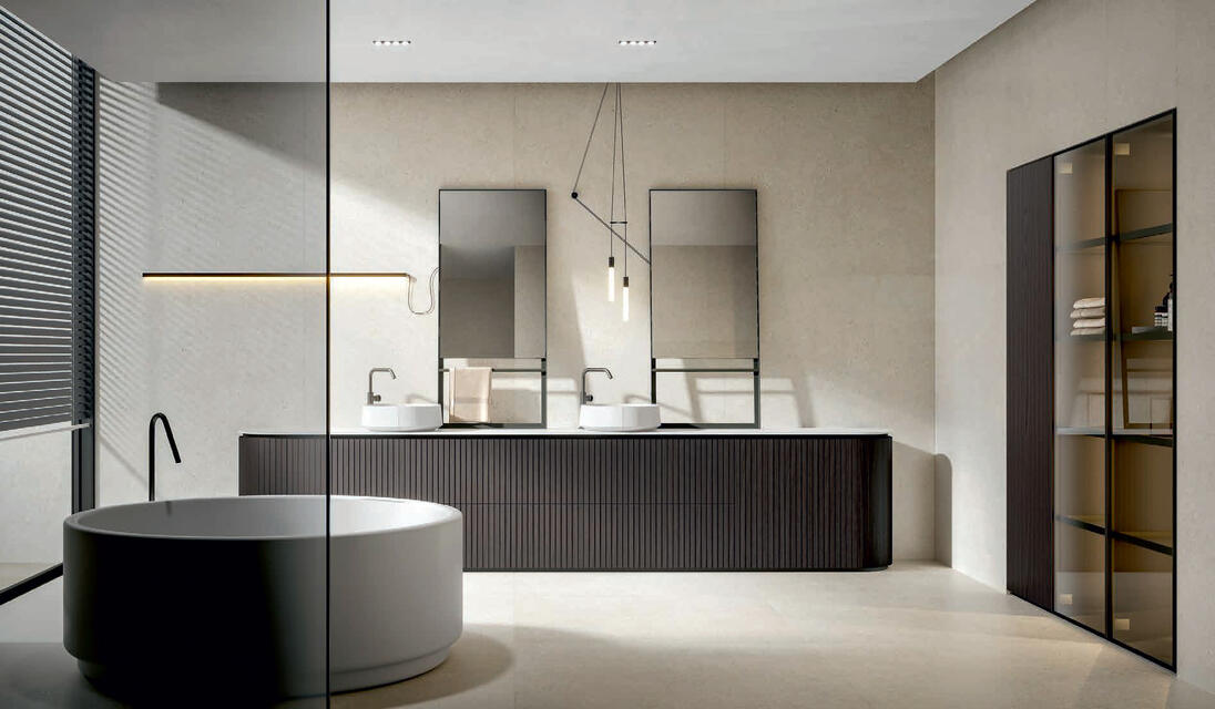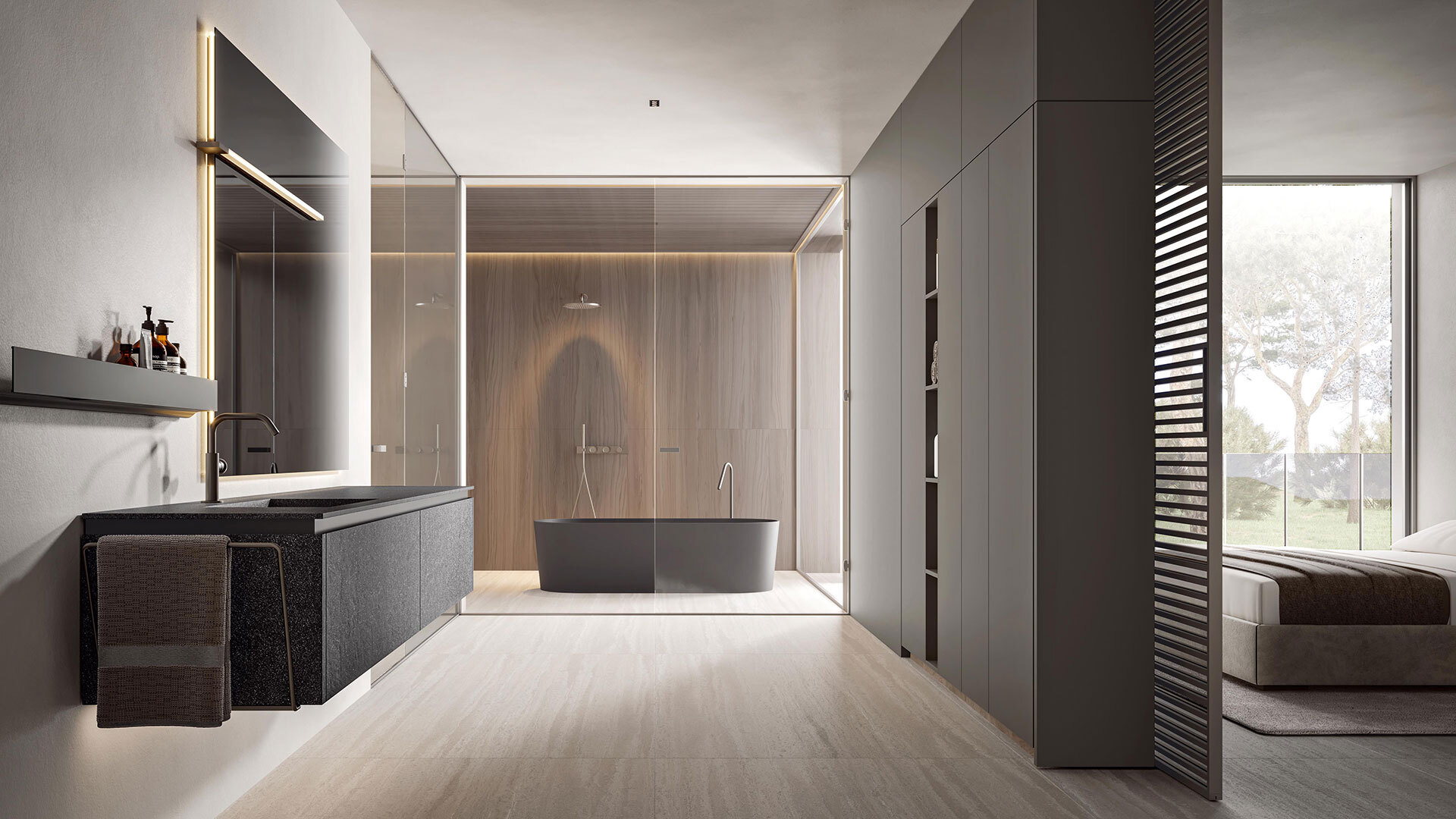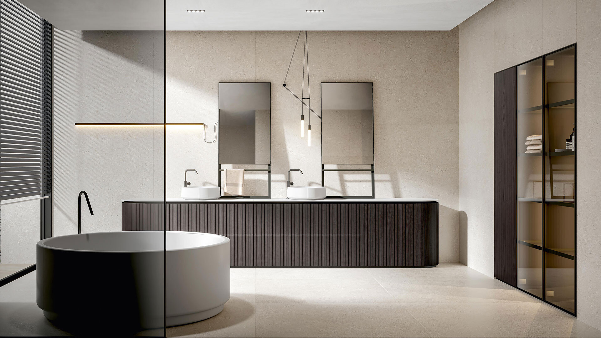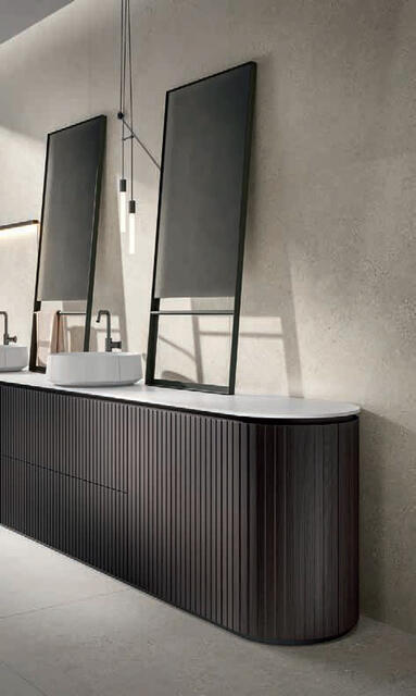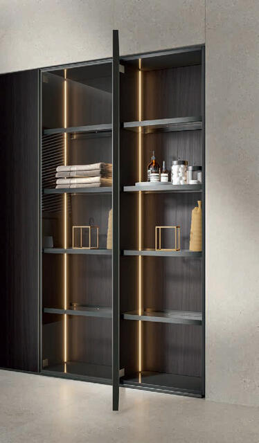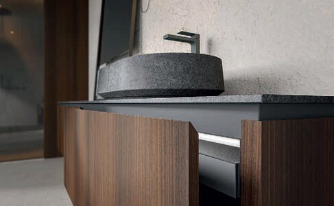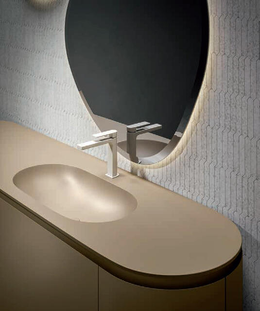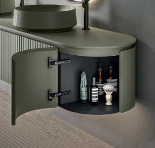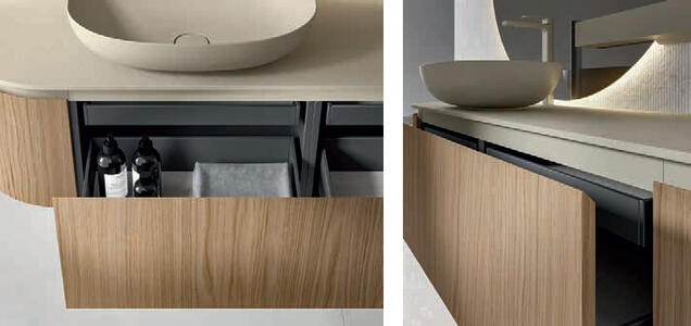 CALIPSO, in the two versions Squared and Circular, is characterized by the groove that runs continuously on three sides of the cabinet. A clean and elegant line, which demarcates the tops, emphasizes the top and loads of emphasis on the perception of the profiles. The lower volumes of the cabinet, thanks to the particular finishes suggested for this collection, seem almost devoid of opening lines and intuitively bring the attention on the throat, key to access the interior spaces.