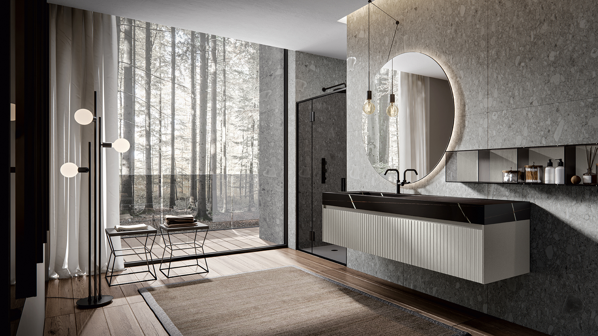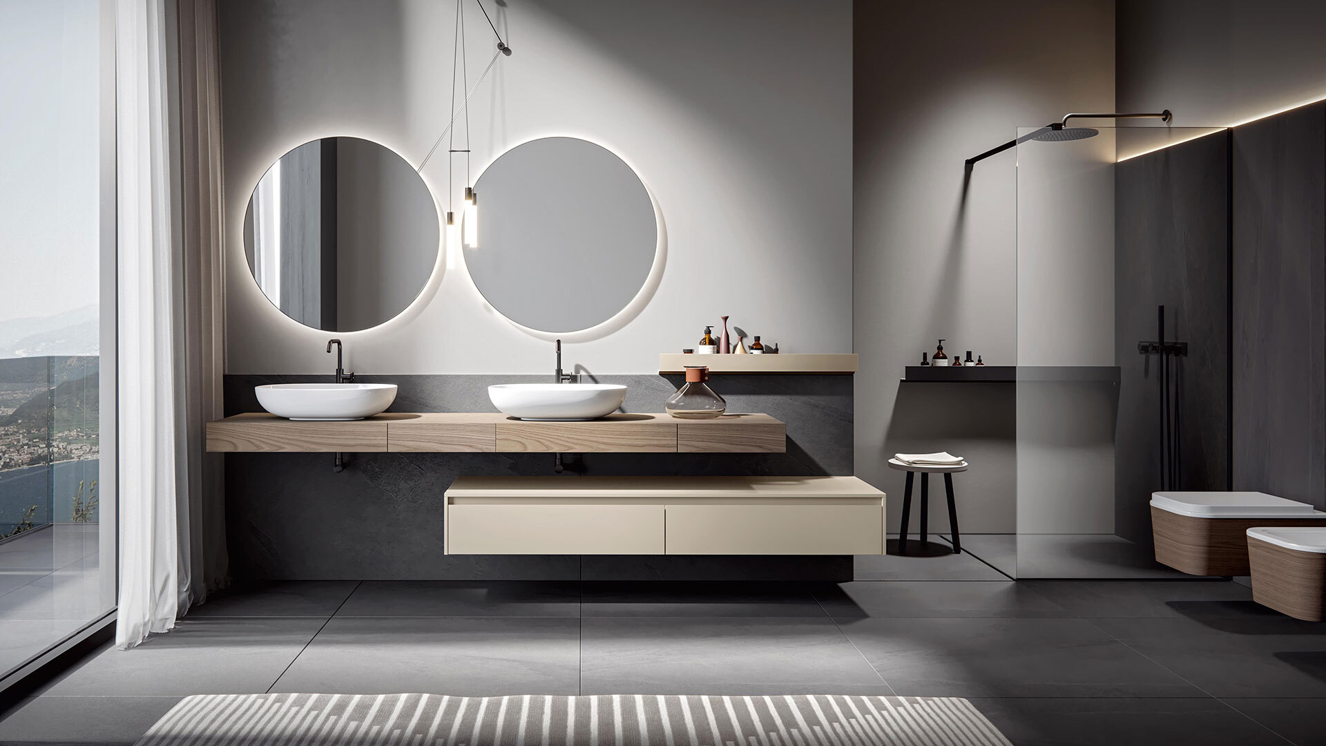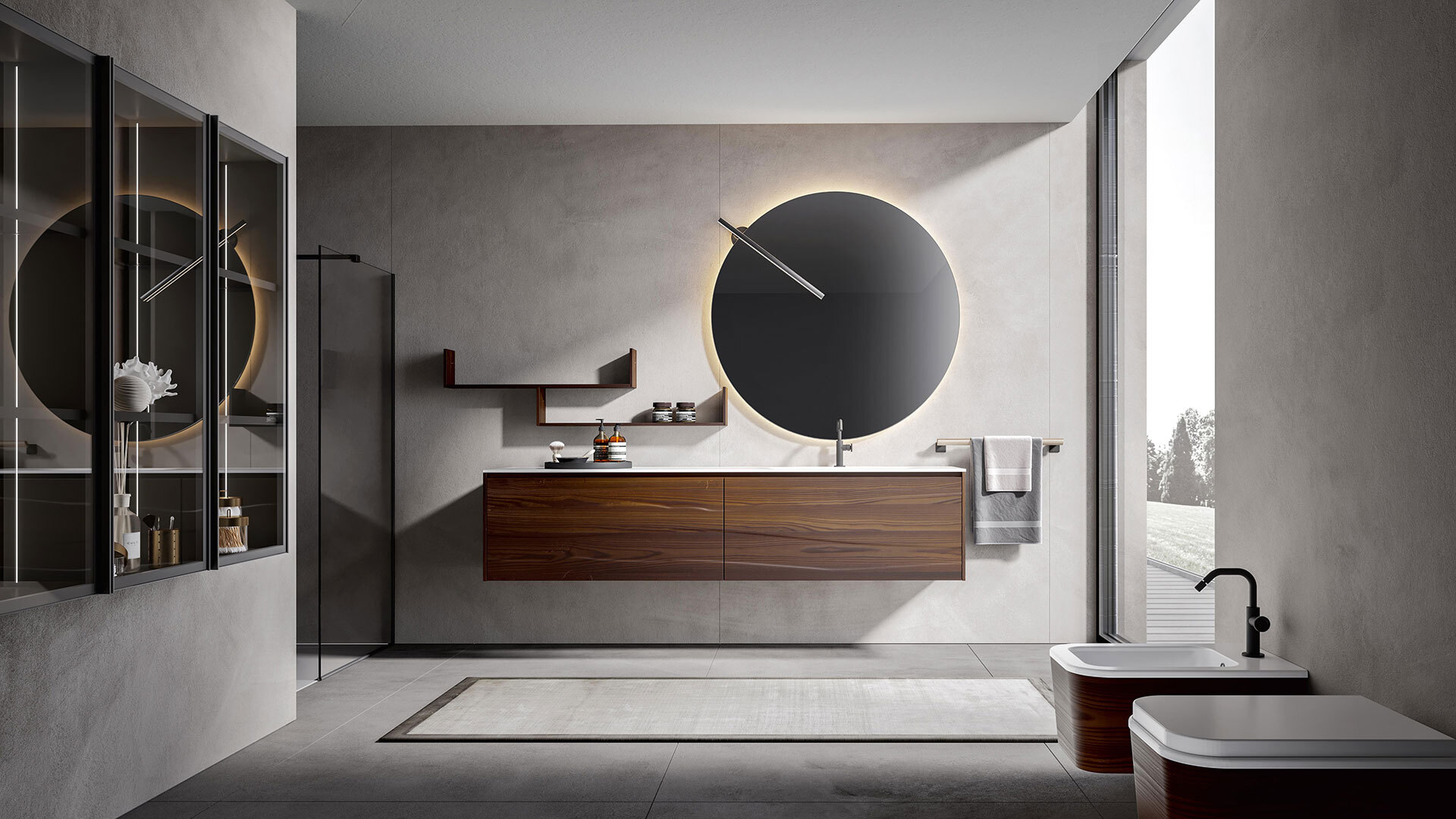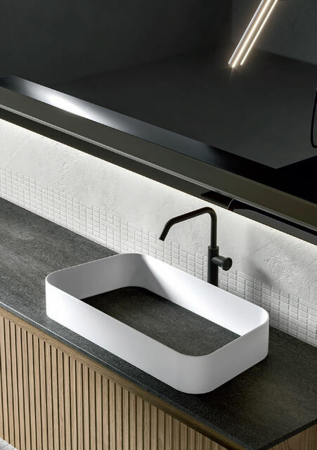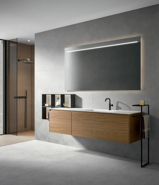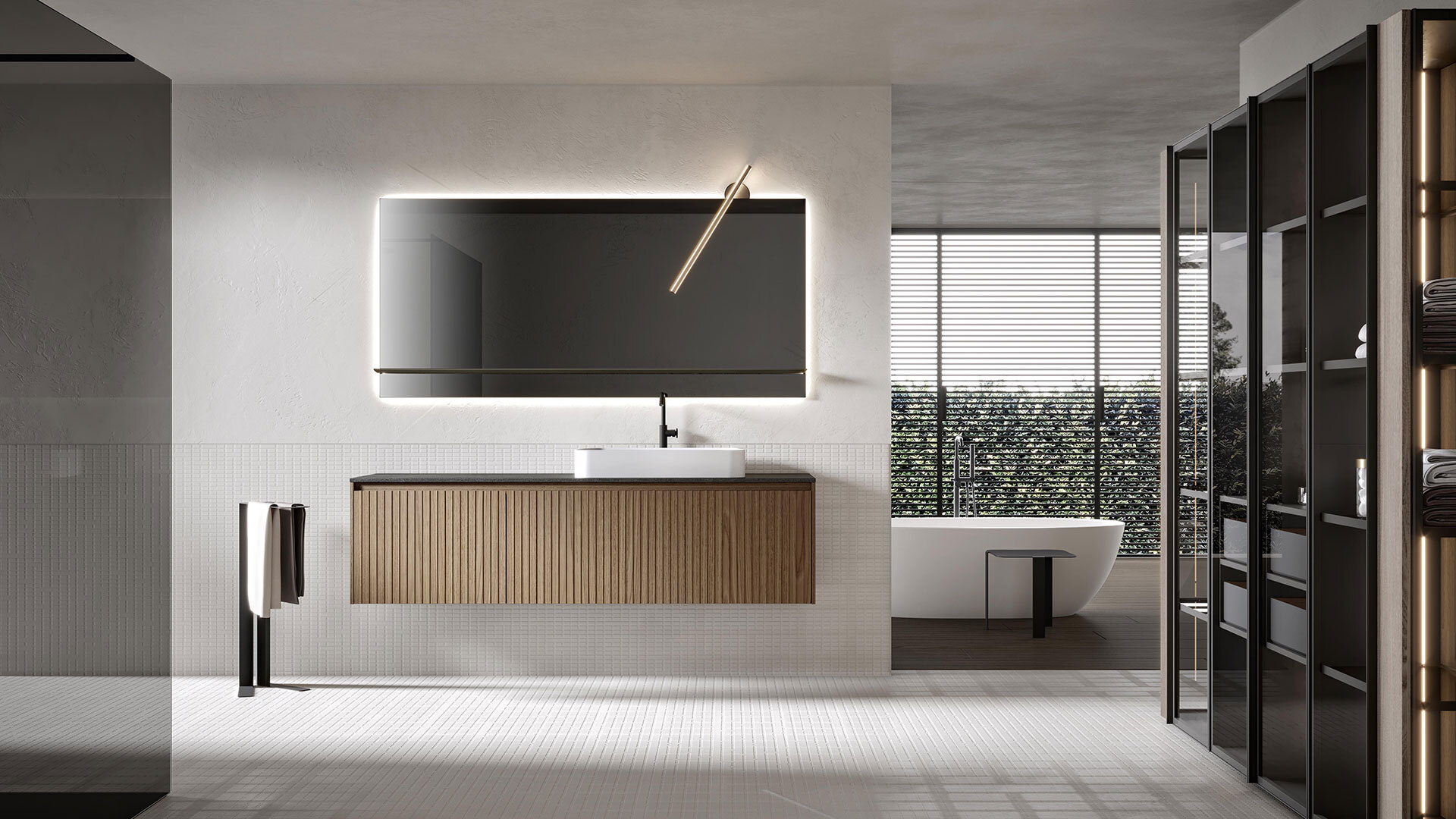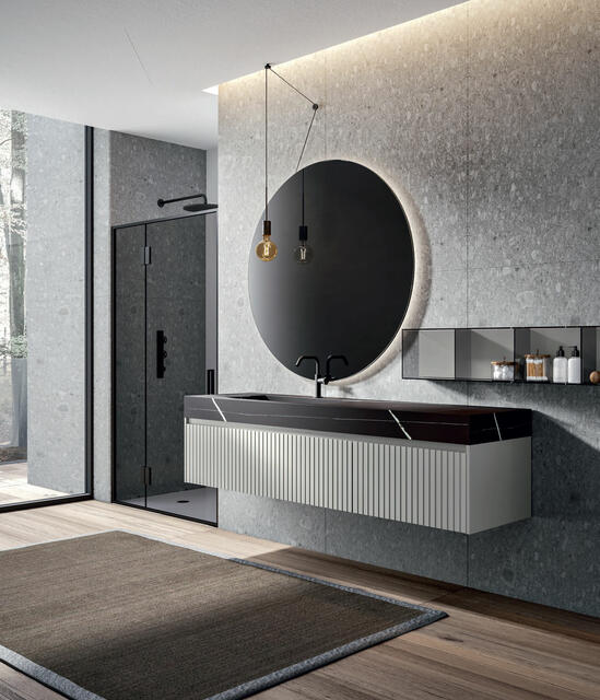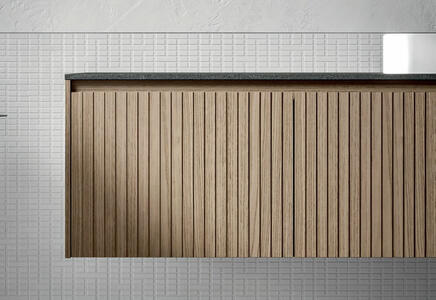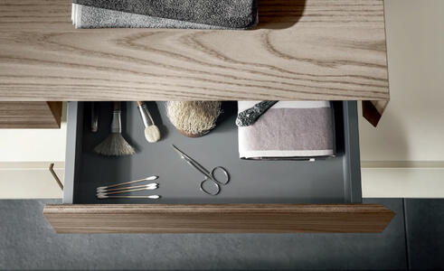 The aesthetic elegance of Eos is characterised by its neat and precise lines. The two sides of only 15mm thickness embellish and frame the vanity units, while its doors and drawers open through a comfortable 45° flat groove that develops in full length on the fronts. The use of textures leaves plenty of room to solutions of strong visual impact.