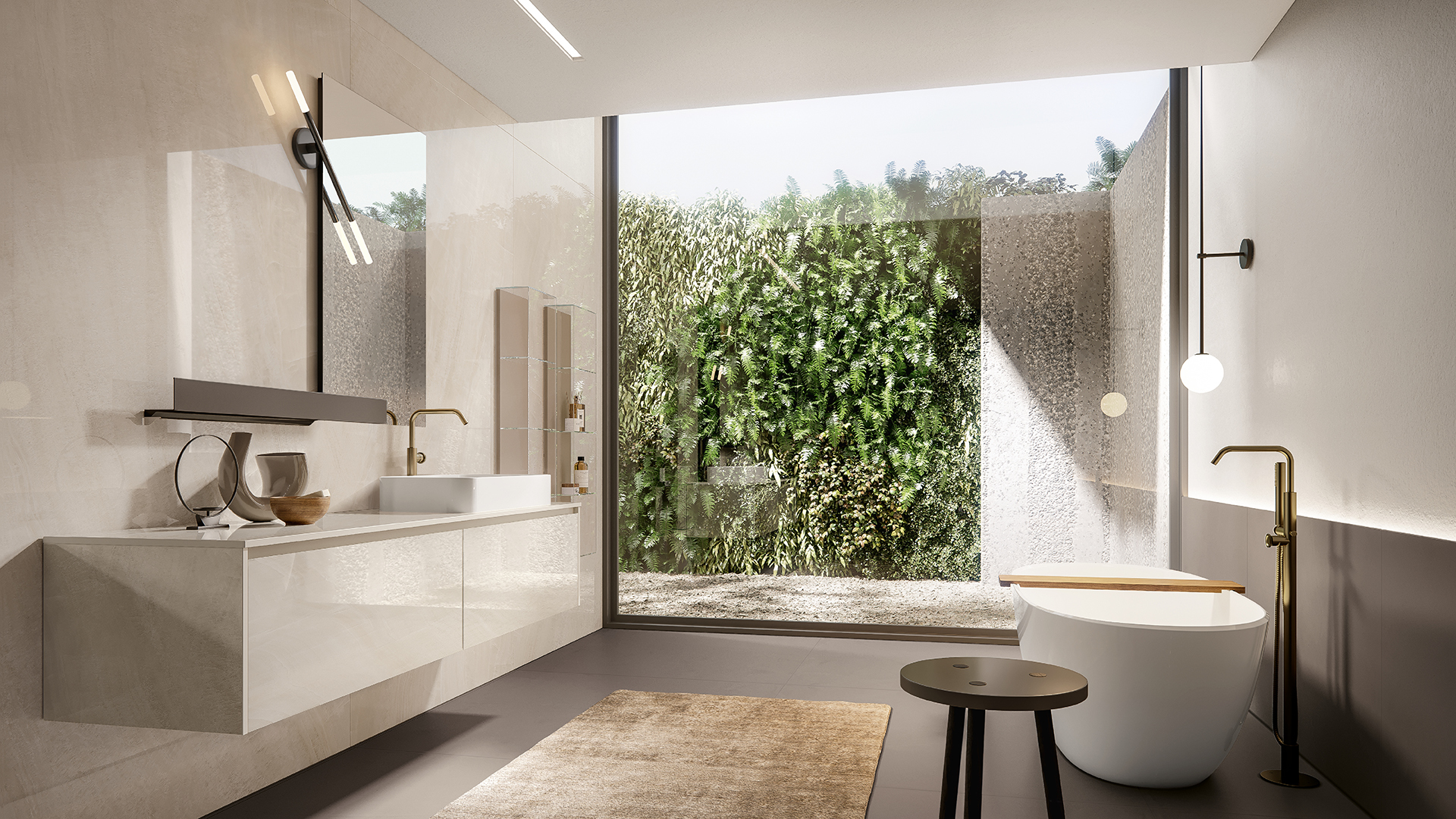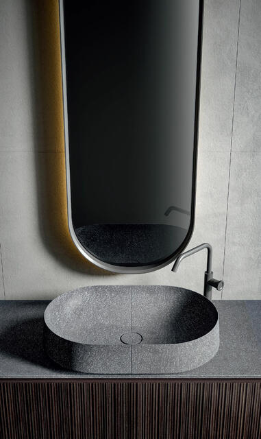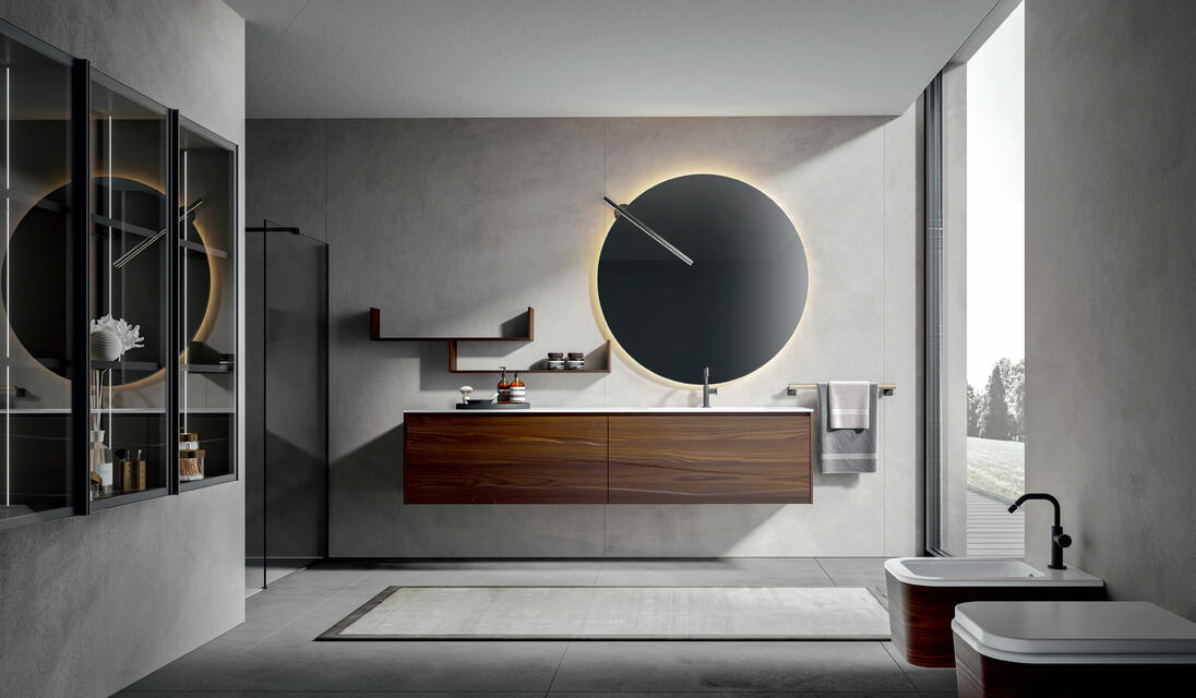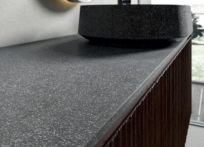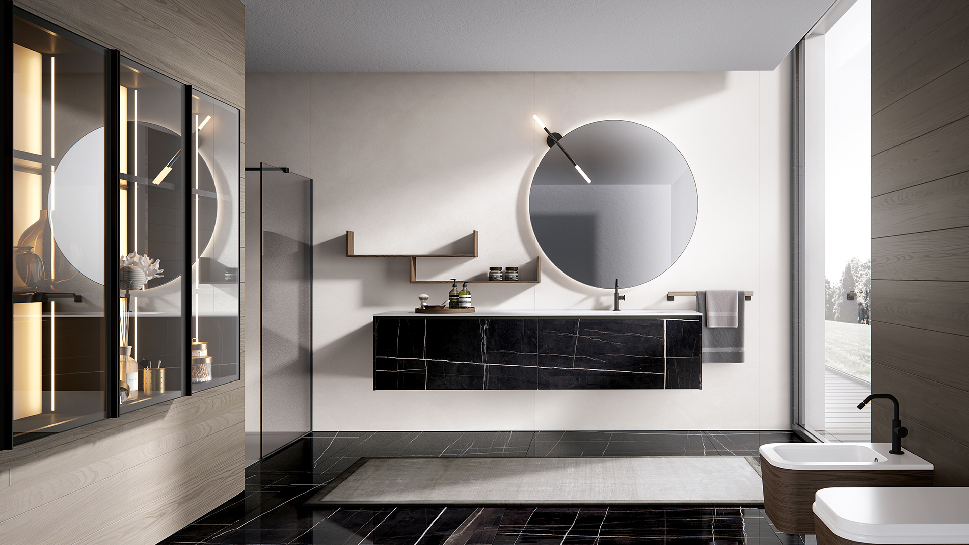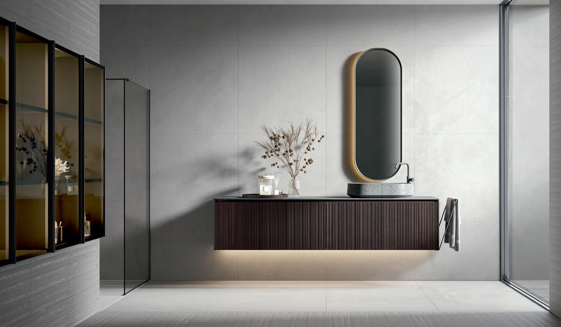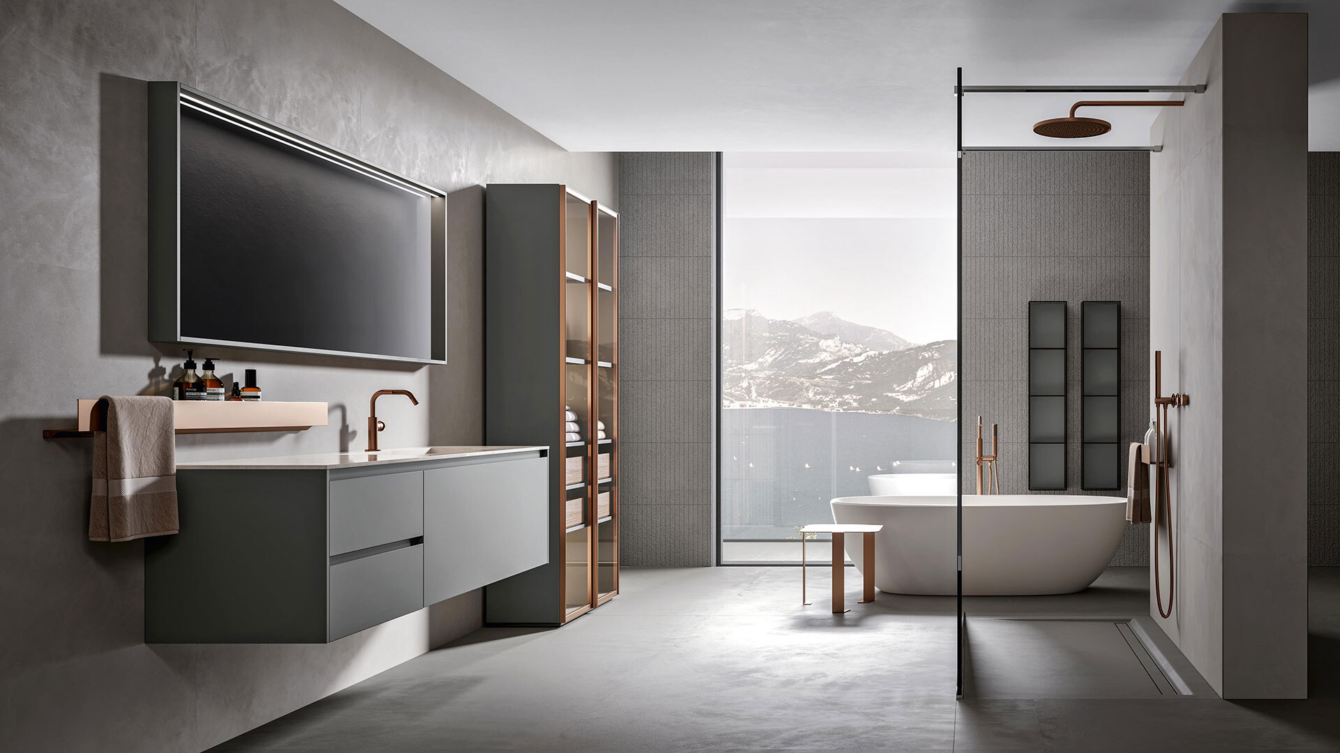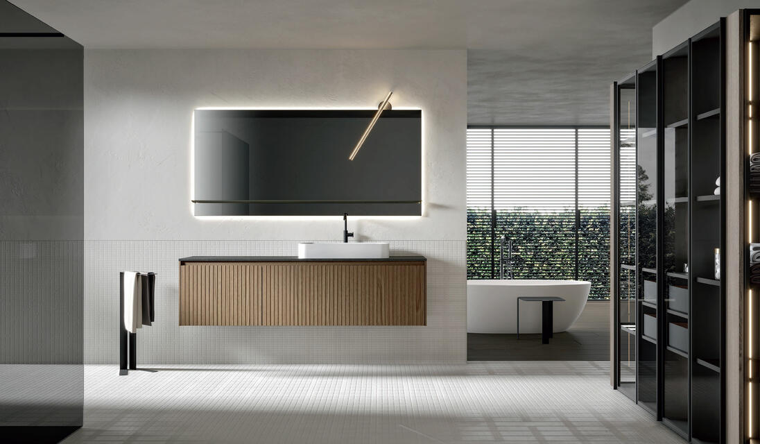 The aesthetic elegance of Eos is characterised by its neat and precise lines. The two sides of only 15mm thickness embellish and frame the vanity units, while its doors and drawers open through a comfortable 45° flat groove that develops in full length on the fronts. The use of textures leaves plenty of room to solutions of strong visual impact.