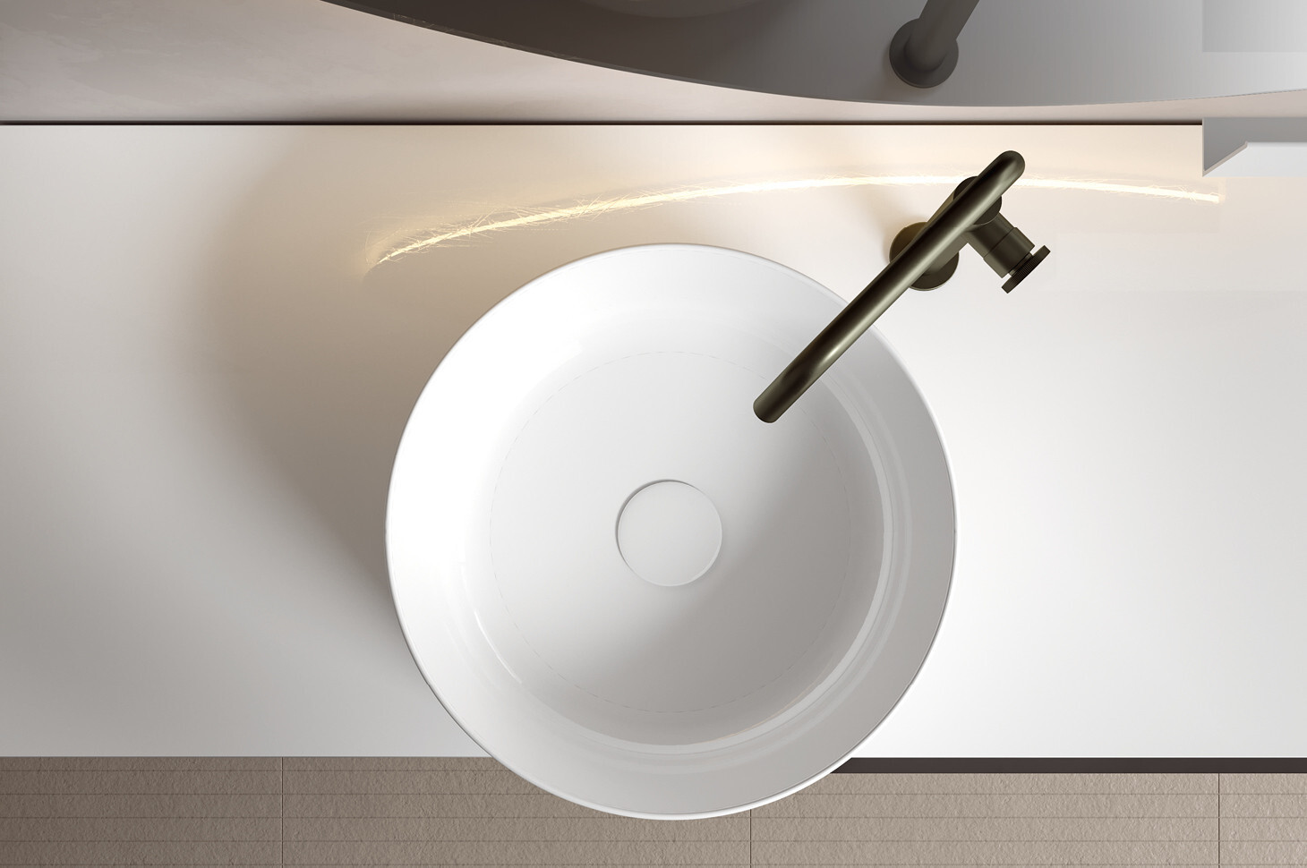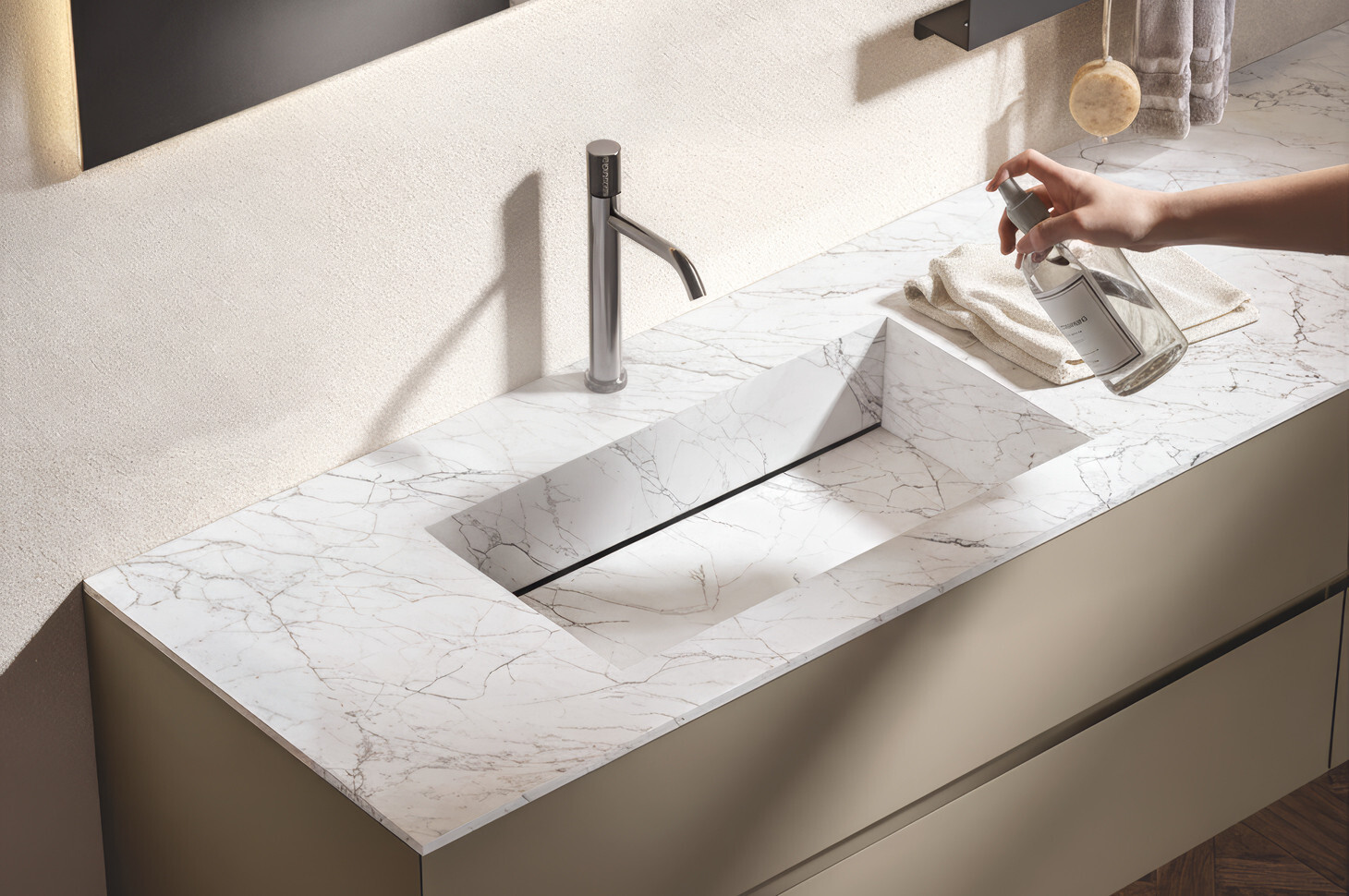 Sono robusti, non invincibili. I materiali del mondo Stone rendono al meglio con l’ordinario ben fatto: pH neutro → risciacquo → asciugatura. Per cosmetici o untuosità, sgrassatore delicato non abrasivo e risciacquo. Evitano acidi e basi forti e non apprezzano urti puntuali né calore diretto. Il vantaggio, quando top e lavabo sono nella stessa finitura, è duplice: coerenza estetica e routine identica su più elementi, come nelle proposte in Stonecolor/Stone, Grit Stone, Grit Resina Bio | Warm by Kerakoll; per le solid surface vale lo stesso beneficio con Stonematt, Edotek e Solid, seguendo le loro regole (ordinario neutro e, se serve, micro‑ripristino).