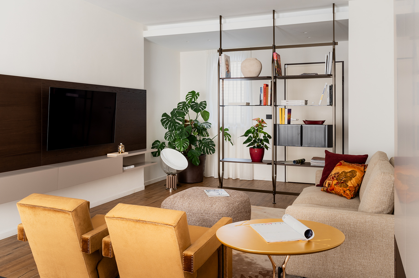 Nella zona giorno, dove i colori della terra dei legni utilizzati, si incontrano e scontrano con il vetro delle leggere sospensioni luminose e la durezza del metallo e del gres effetto Corten. Proseguendo, nella zona notte, lo sguardo viene direzionato da un incredibile giallo senape, che accompagna verso gli azzurri e i rosa degli ambienti bagno: una linea di energia, intensa ma morbida, che conduce con un’armonia incredibile verso i distensivi toni pastello delle zone dedicate al relax e alla cura della persona. Tutto il progetto Casa E+A racconta la centralità del disegno su misura e mette a convivere, con bella maestria, elementi iconici del design e tanto, tantissimo custom made