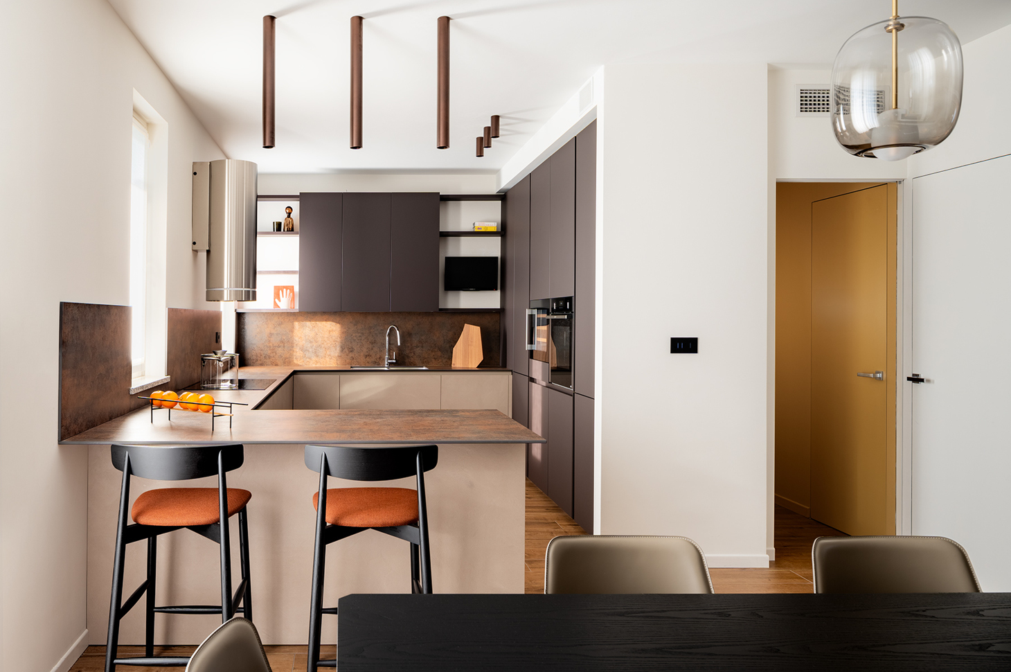 Casa E+A è un progetto di nuova costruzione, che parte dalla consulenza nell’iter di realizzazione e si evolve fino al disegno e ricerca di soluzioni su misura per il cliente. Più di 100 metri quadri nella storica Torino, che raccontano un dialogo di continuità tra zona giorno e zona notte, tra materiali e colori, in un elegante gioco di equilibri tra elementi di rigore (linee nette, metalli) e il calore di legno e tessuti dai toni caldi. Proprio il colore è uno degli elementi centrali di questo progetto, la chiave con cui Tina Pour detta il ritmo di lettura e il susseguirsi degli spazi.