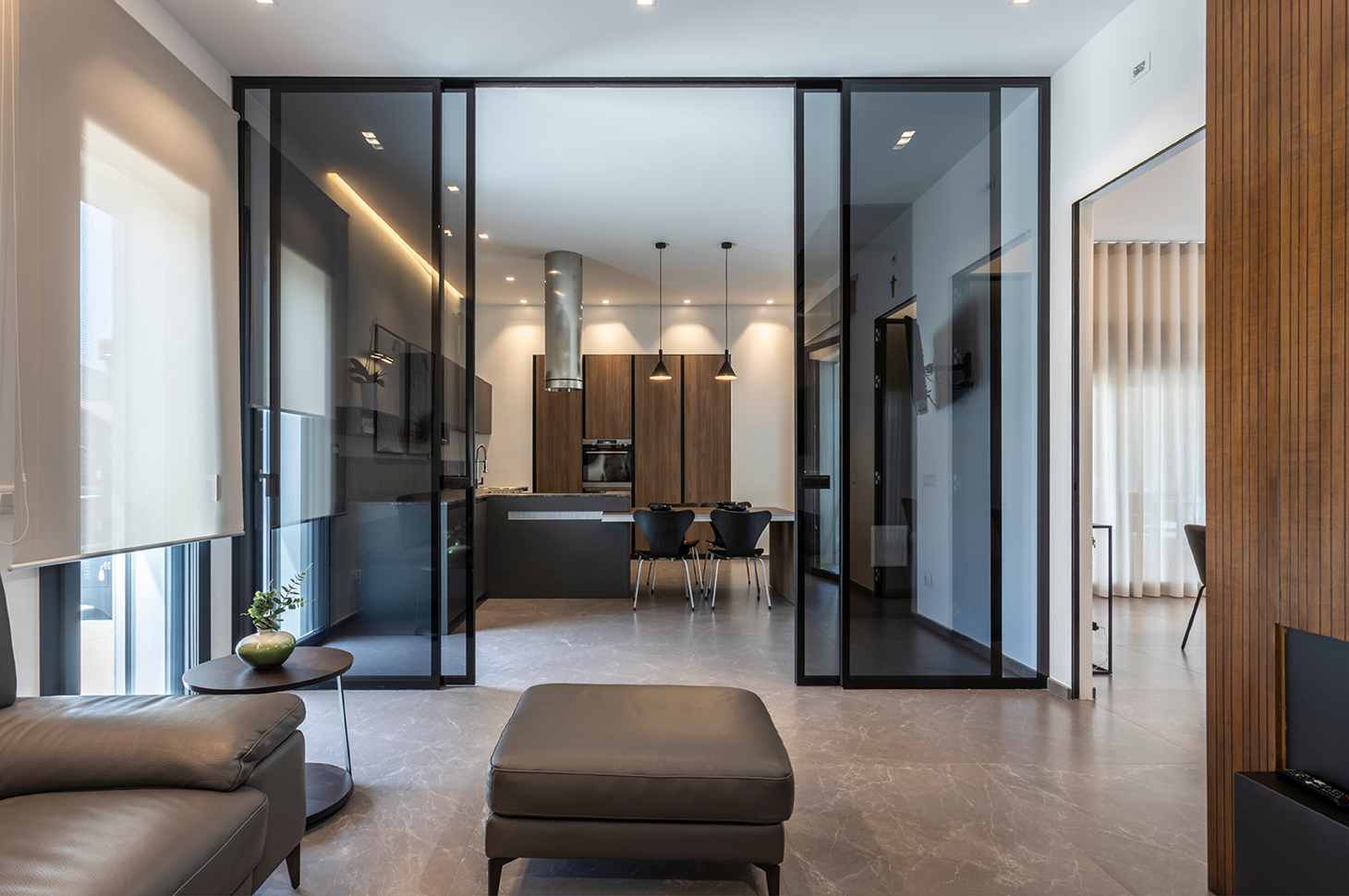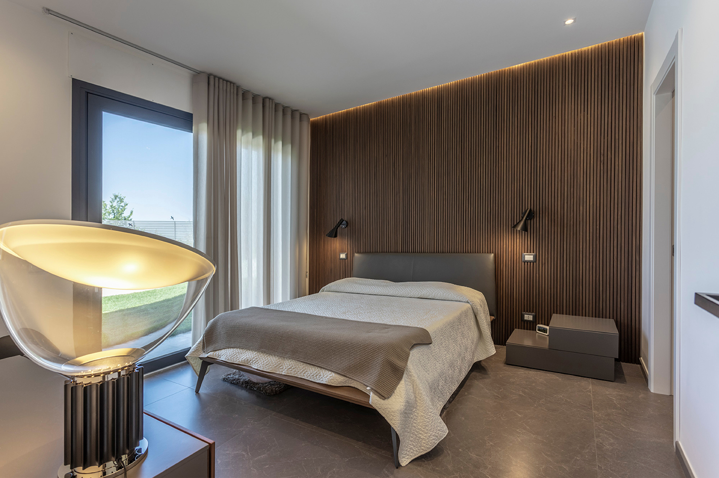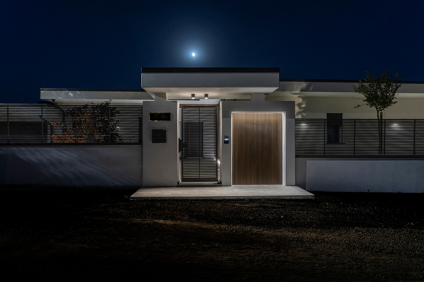 Siamo in un lotto della campagna abruzzese e il progetto è quello di un’abitazione privata che si sviluppa tutta su un piano. L’interno della villa è caratterizzato da uno stile minimal ma accogliente e ricercato, in cui la progettista intendeva dare spazio e risalto all’utilizzo di materiali come pietra, resina, metallo e legno. Gli spazi si distribuiscono in tre corpi distinti, ma continui. Il corpo centrale ospita gli spazi della sala da pranzo a cui si collegano da una parte la zona living e dall’altra la zona notte. Le grandi aperture vetrate presenti nella zona giorno fondono armoniosamente l’interno dell’abitazione con l’ampio giardino esterno dando un’idea di continuità tra l’indoor e l’outdoor, nella ricerca di valorizzazione del contesto verde in cui si inserisce l’abitazione. Tema che unisce tutto il progetto, la presenza di superfici e pareti con finiture legno texturizzate.