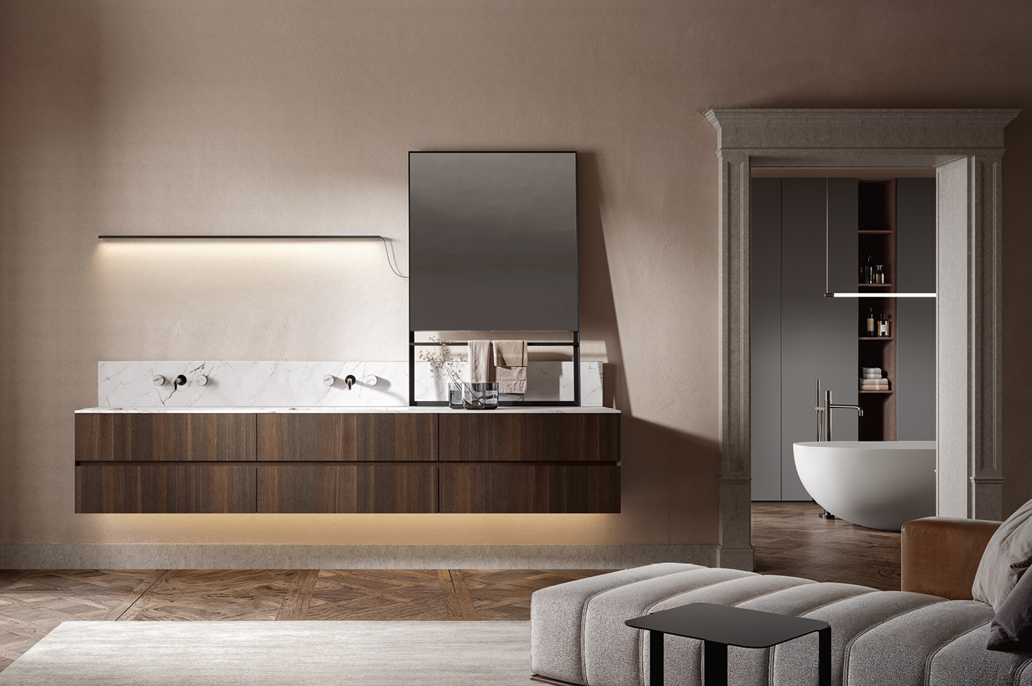 Disegnata su eleganti giunture a 45° dei fianchi, Artemide si presta con grande versatilità a esprimere stili molto diversi tra loro. Elemento di continuità è il top in appoggio che, in qualsiasi interpretazione di questo modello, delinea il rapporto tra mobile contenitore e lo spazio lavabo. Le prese maniglia sono ottenute con un altro taglio a 45° e, nel caso di una soluzione a cassetto doppio, vanno a creare una caratterizzante gola centrale. Il dettaglio del top in appoggio porta, nella proposta Artemide, un’elegante leggerezza visiva, capace di valorizzare i diversi elementi. Grazie alla sua linea definita, texture e finiture possono essere messe in risalto per continuità e pulizia delle linee, oppure scegliendo un carattere opposto, che punta su contrasti di materiali e volumi in appoggio.