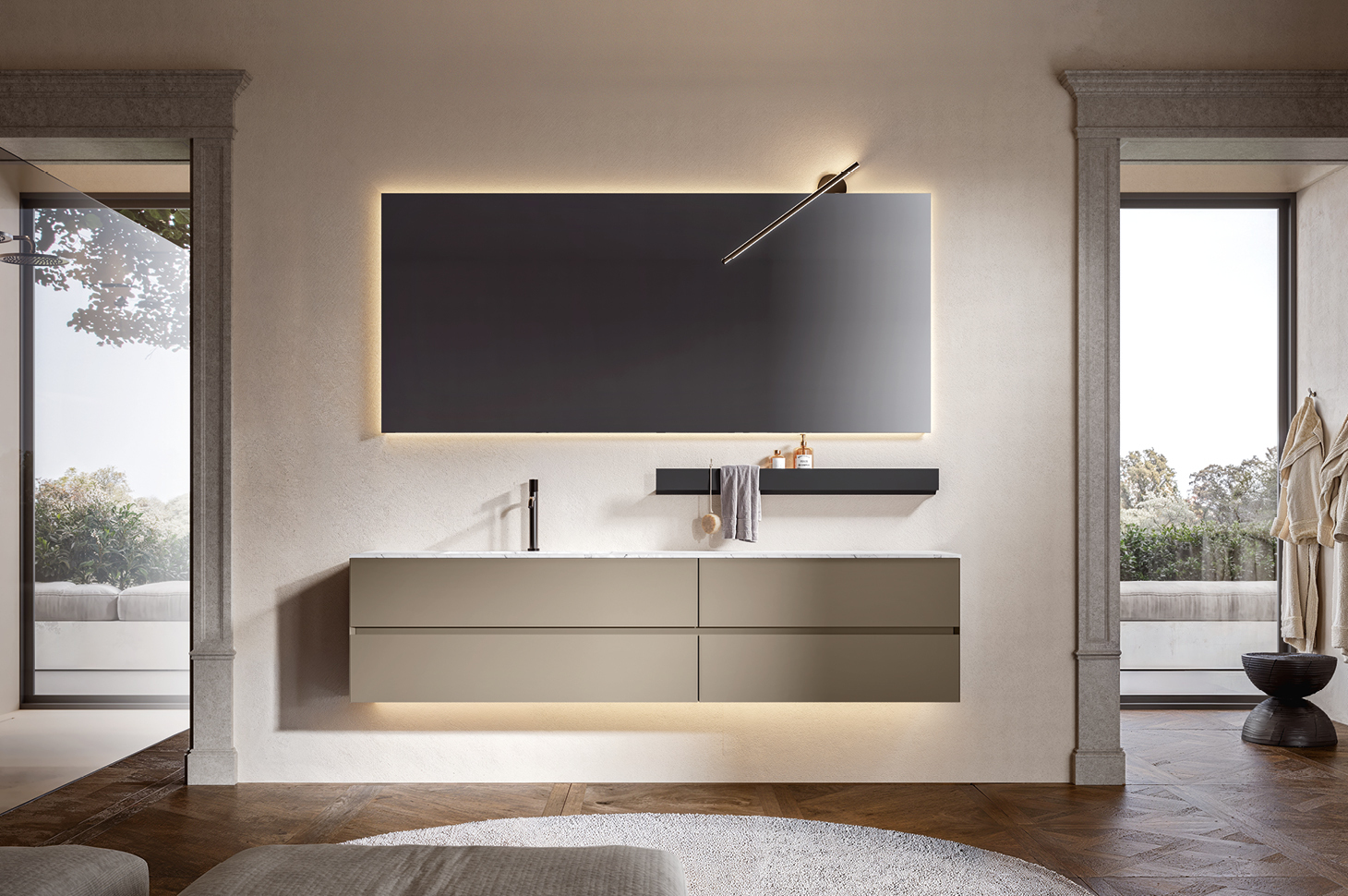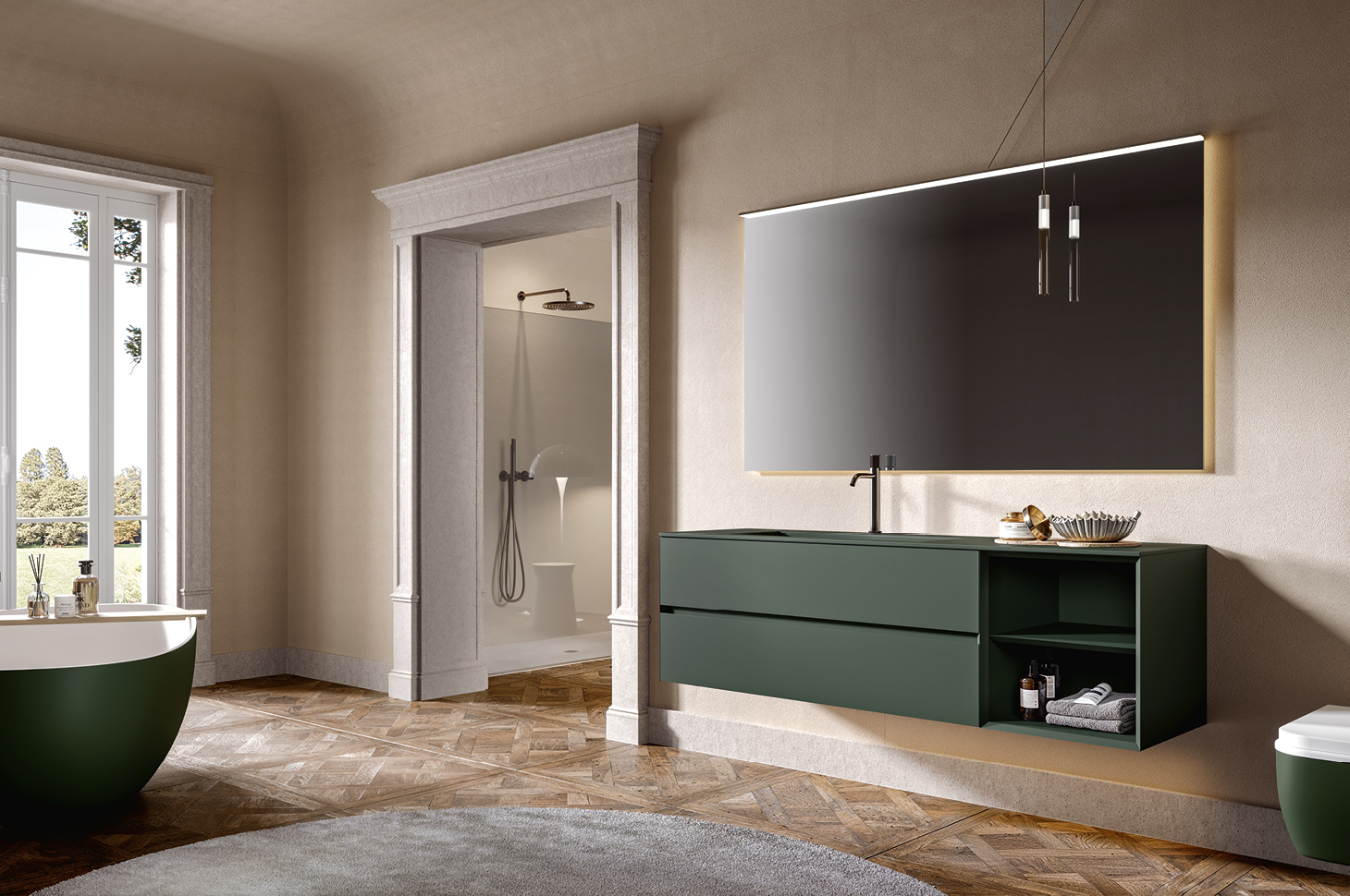 Linee pulite, cassettoni e vani giorno e l’unicità di un carattere distintivo che arriva direttamente dalla possibilità di personalizzare i colori di ogni elemento, creando una perfetta continuità con gli altri elementi del bagno, come sanitari e vasca. Questa scelta di design permette di trasformare lo spazio bagno in un ambiente coerente con una visione precisa, dove ogni dettaglio racconta uno stile unico e personale. Per esempio, optare per una palette monocromo dalle tinte decise racconta la voglia di un’espressione audace, che enfatizza i volumi e le texture, ideale per chi è alla ricerca di un ambiente contemporaneo e di forte impatto estetico, senza perdere mai di vista gusto e funzionalità.