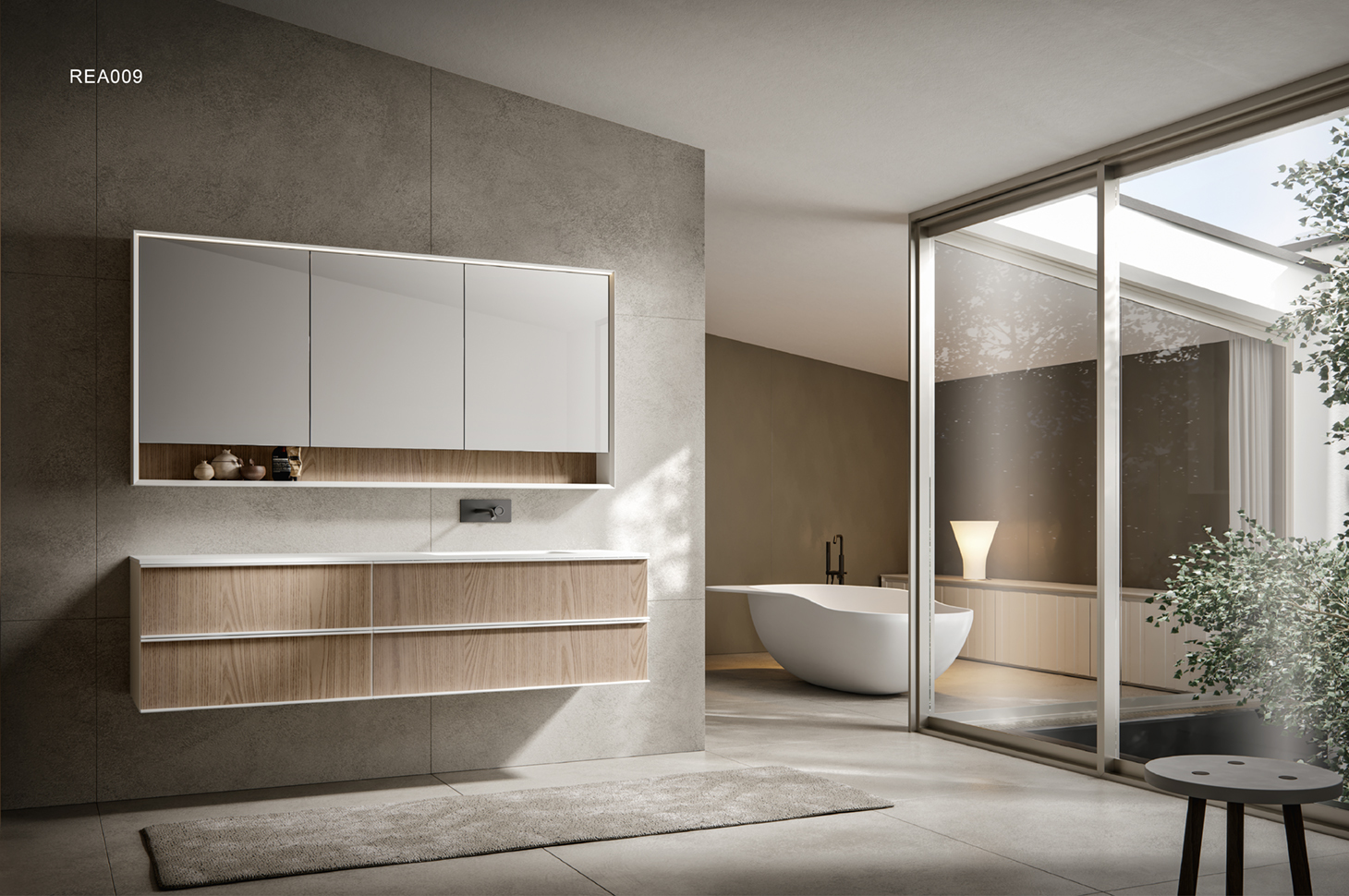 Nella composizione REA009: specchiera contenitore perimetro 45° a tre ante, con vano a giorno, mobile Rea in Castagno tinto Cumino con telaio in finitura Bianco Diamante, top in vetro extrachiaro sabbiato Diamante con lavabo integrato. Sullo sfondo vasca West in Stonematt, in primo piano tavolino serie Nature.