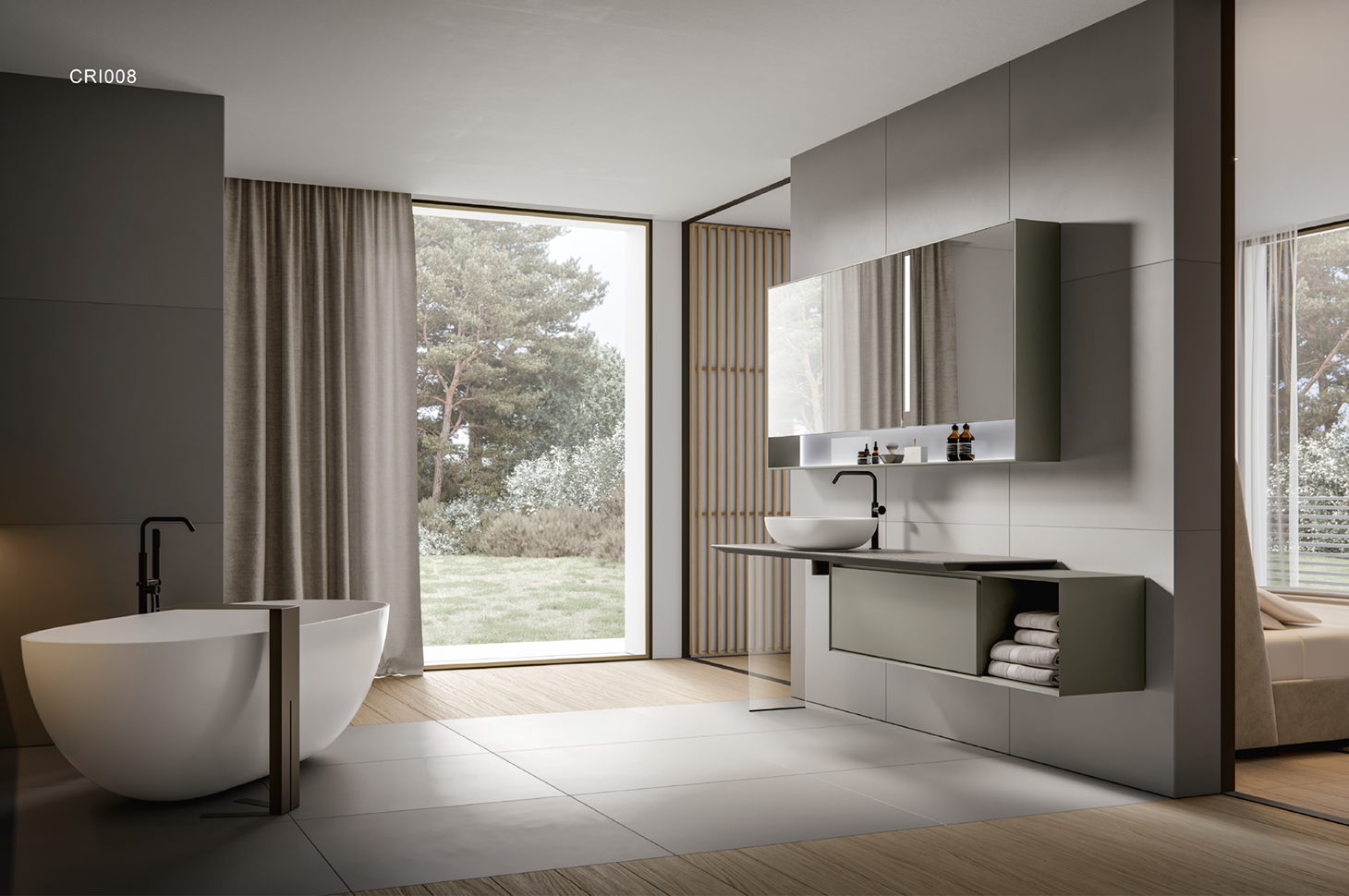 Nella composizione CRI008: specchiera contenitore a tre ante, con fascia luminosa laccata e vano a giorno in vetro bianco opalino retroilluminato, monoblocco Crio con cassetto e vano a giorno laccato Talpa, consolle Eterea taglio a 35°, vasca Ray in Stonematt, miscelatore Wheel a terra con doccetta per vasca e tavolo rettangolare serie Piega.