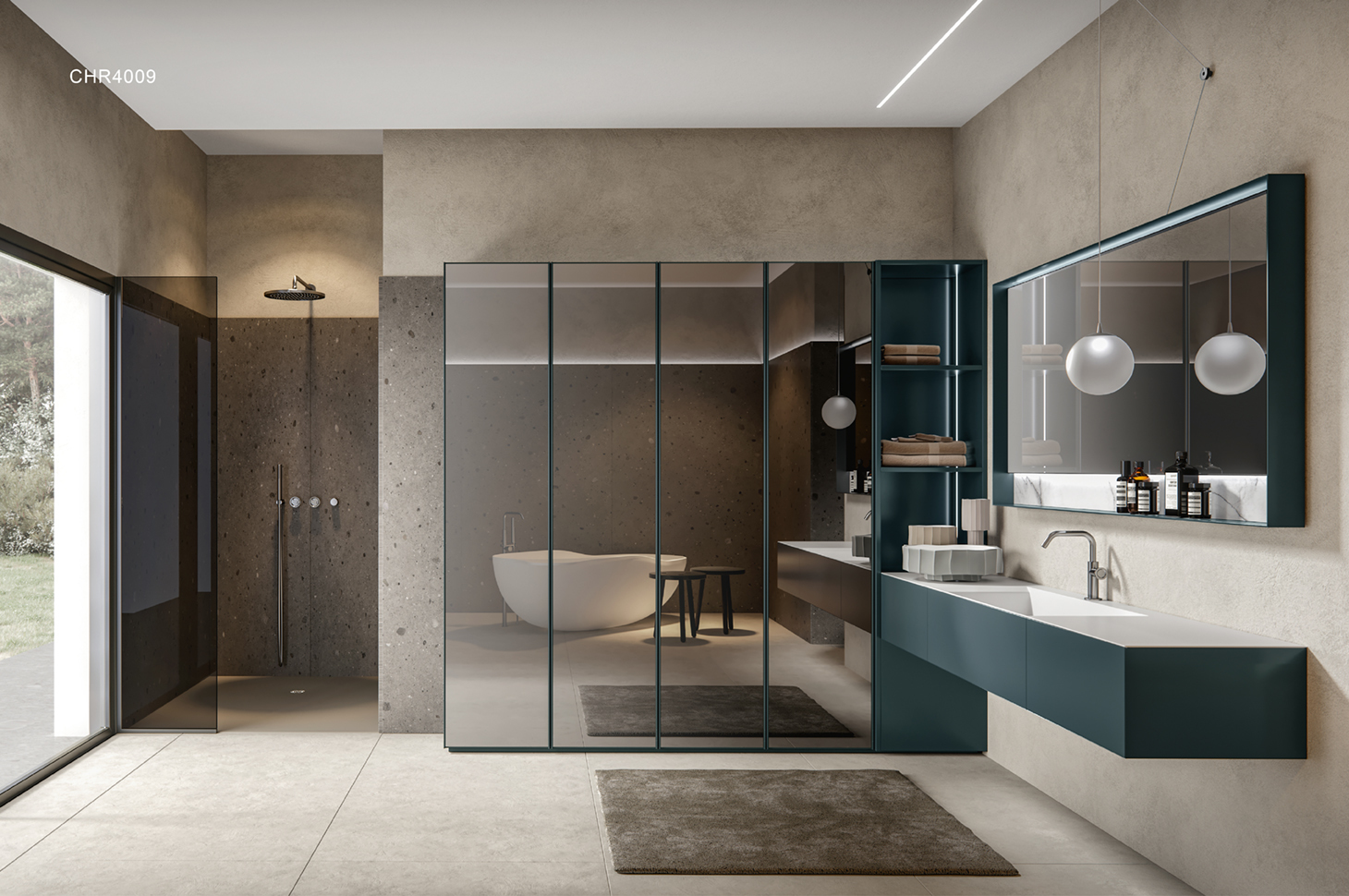 Nella composizione CHR4009 specchiera Frame con LED, lampada Globe, basi Chrono44 sospese, laccate Pavone opaco e colonne Rea con anta in finitura Specchio Fumé.