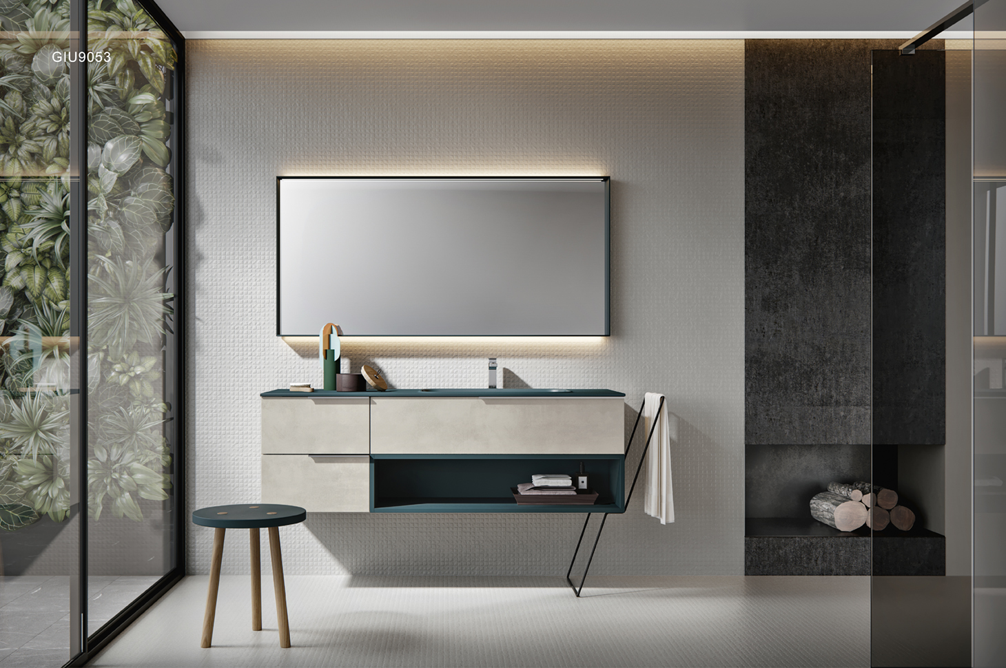 Nella composizione GIU9053 specchiera Filo con sistema audio bluetooth, mobile Giunone, maniglia Tiziano Brill, frontali Nobilitato Cemento Perla e parte a giorno Laccato opaco Nettuno, top in Stone Nettuno.