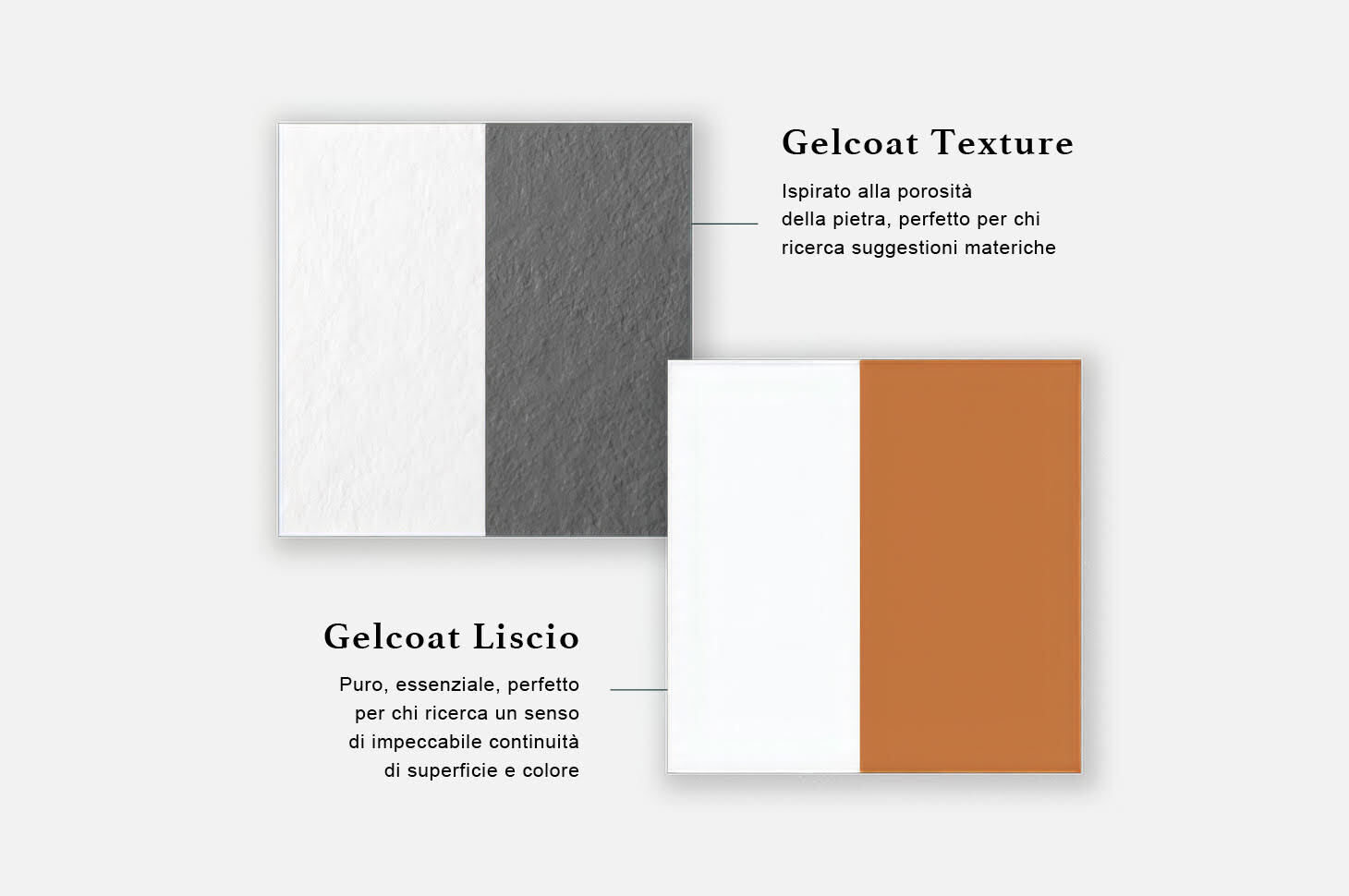 La durata e la resistenza sono aspetti cruciali in un piatto doccia di qualità. Materiali innovativi, come il Gelcoat che scegliamo per le nostre proposte, garantiscono una lunga durata senza compromettere lo stile. Questo materiale ci permette inoltre di offrire un’ampia gamma di colori, su finitura liscia o texture, garantendo una personalizzazione del piatto doccia adatta al mood d’ambiente in linea con il concept del progetto.