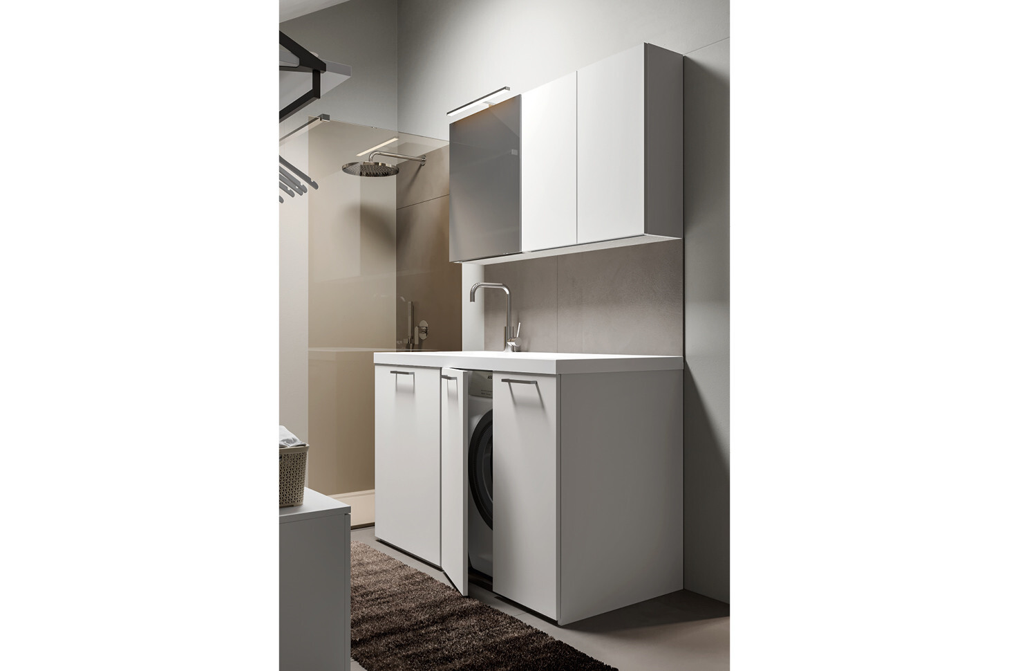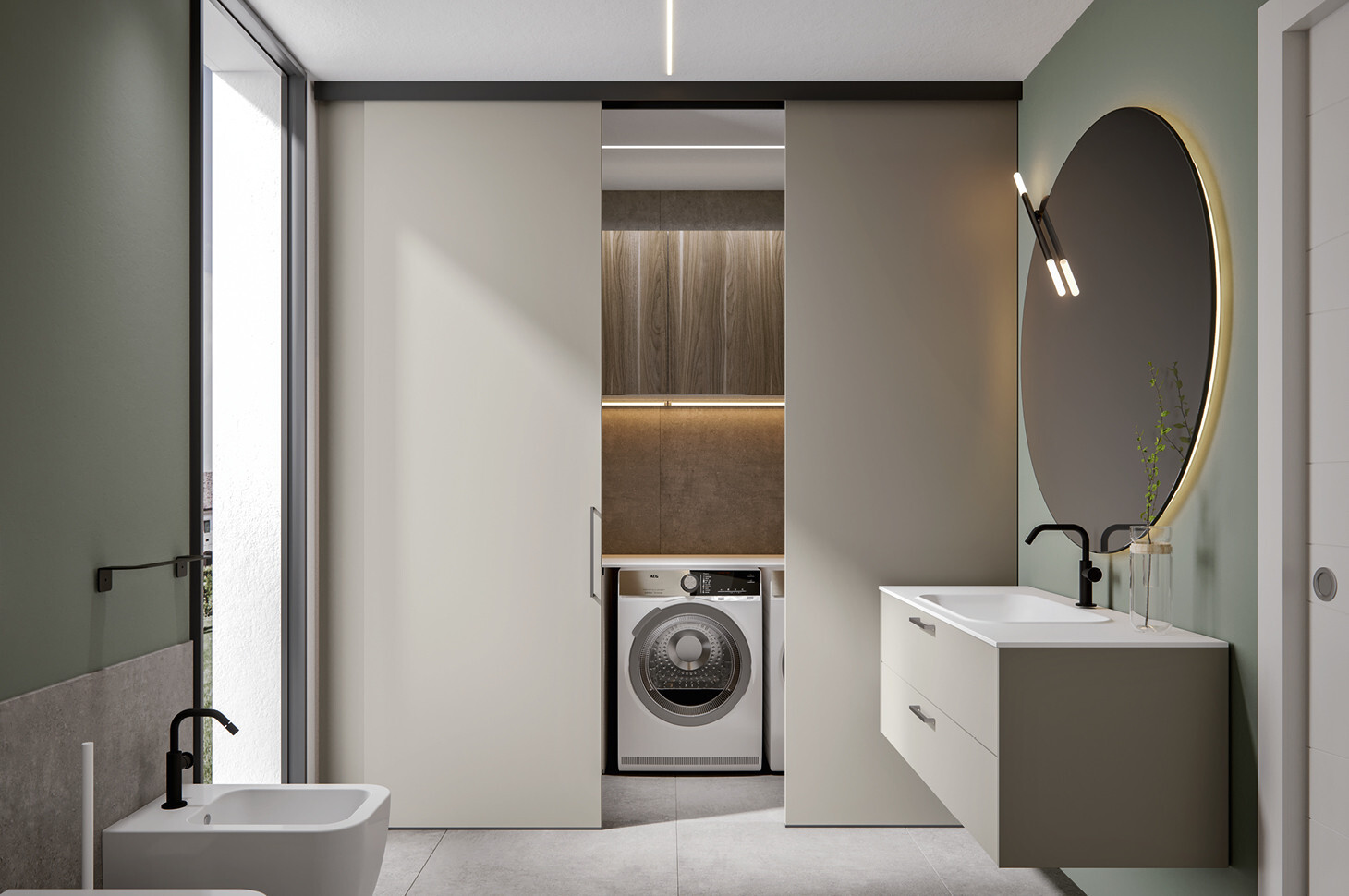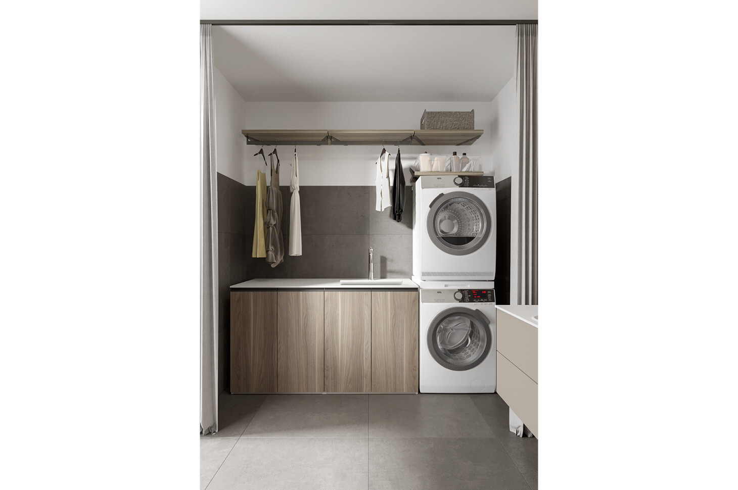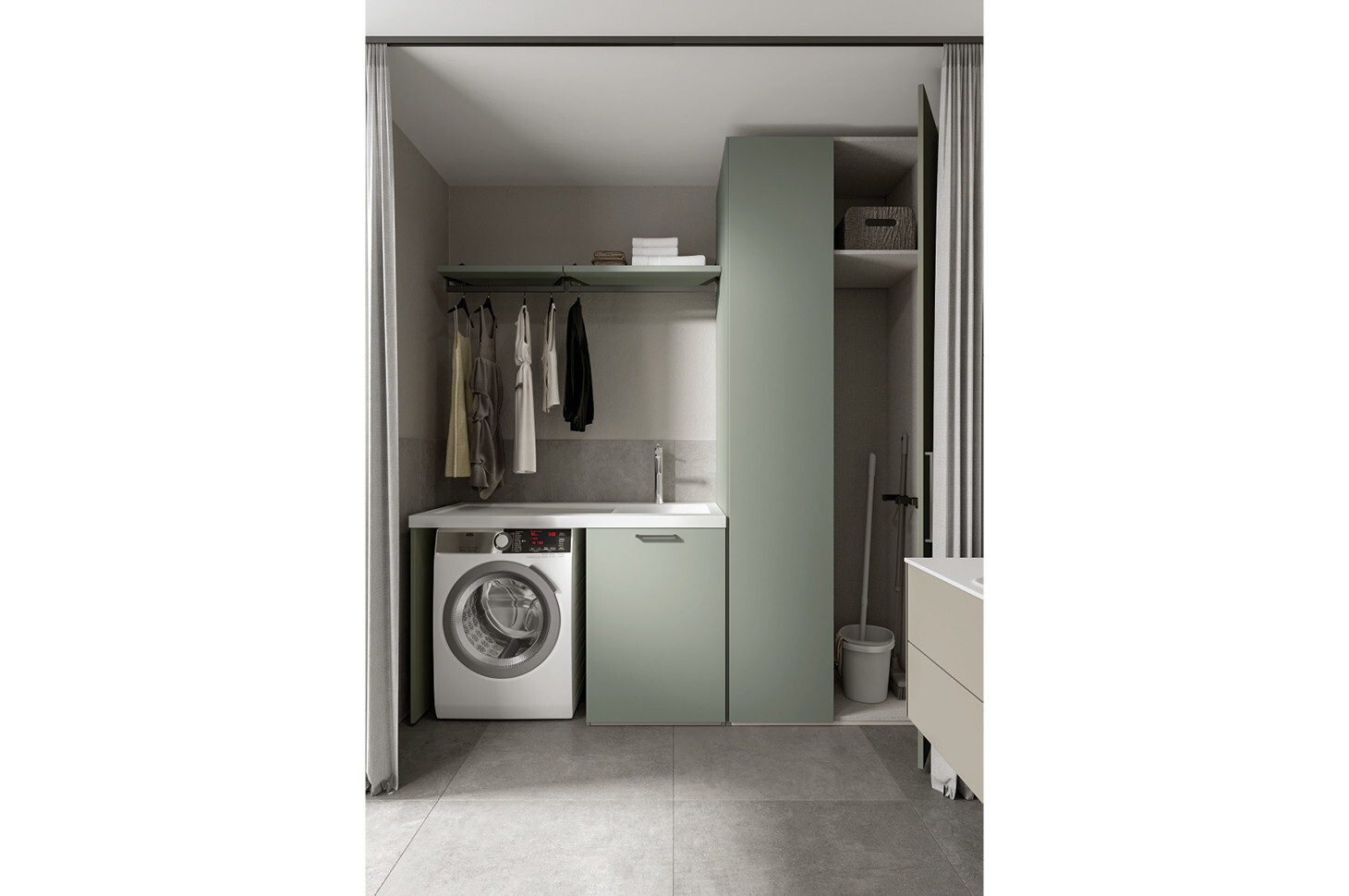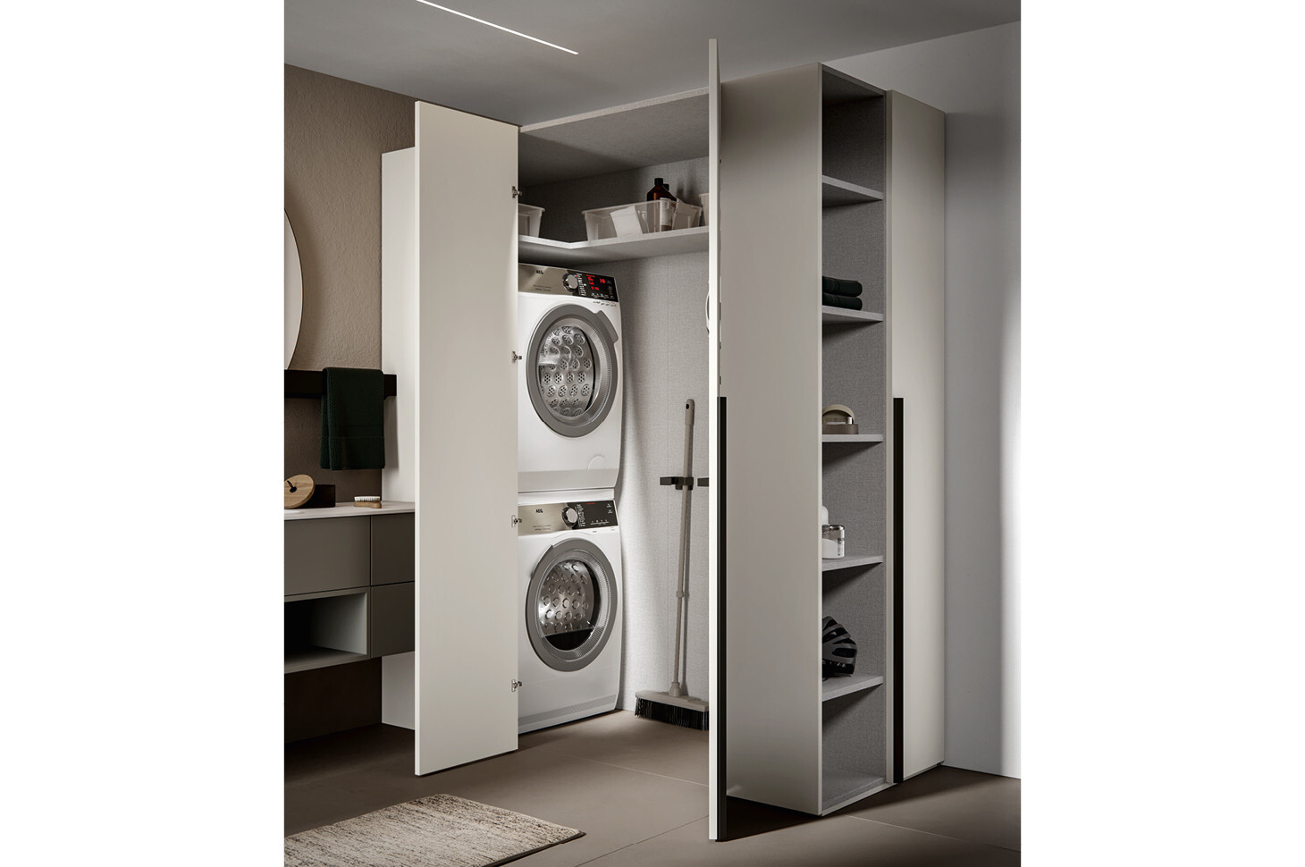 La collezione offre numerose configurazioni modulari che sfruttano al meglio ogni nicchia: basi e colonne attrezzate ospitano lavatrici e asciugatrici, mentre i moduli con vani contenitivi e luci LED sottopensile garantiscono comfort e praticità. Le tende o porte scorrevoli di copertura completano un sistema progettato per il vivere quotidiano, in cui ogni elemento contribuisce a creare spazi compatti ma completi, pensati per rispondere alle esigenze reali della vita quotidiana.