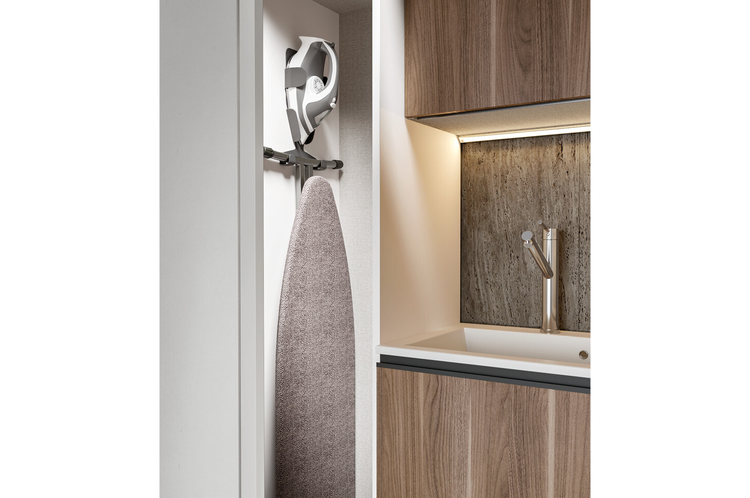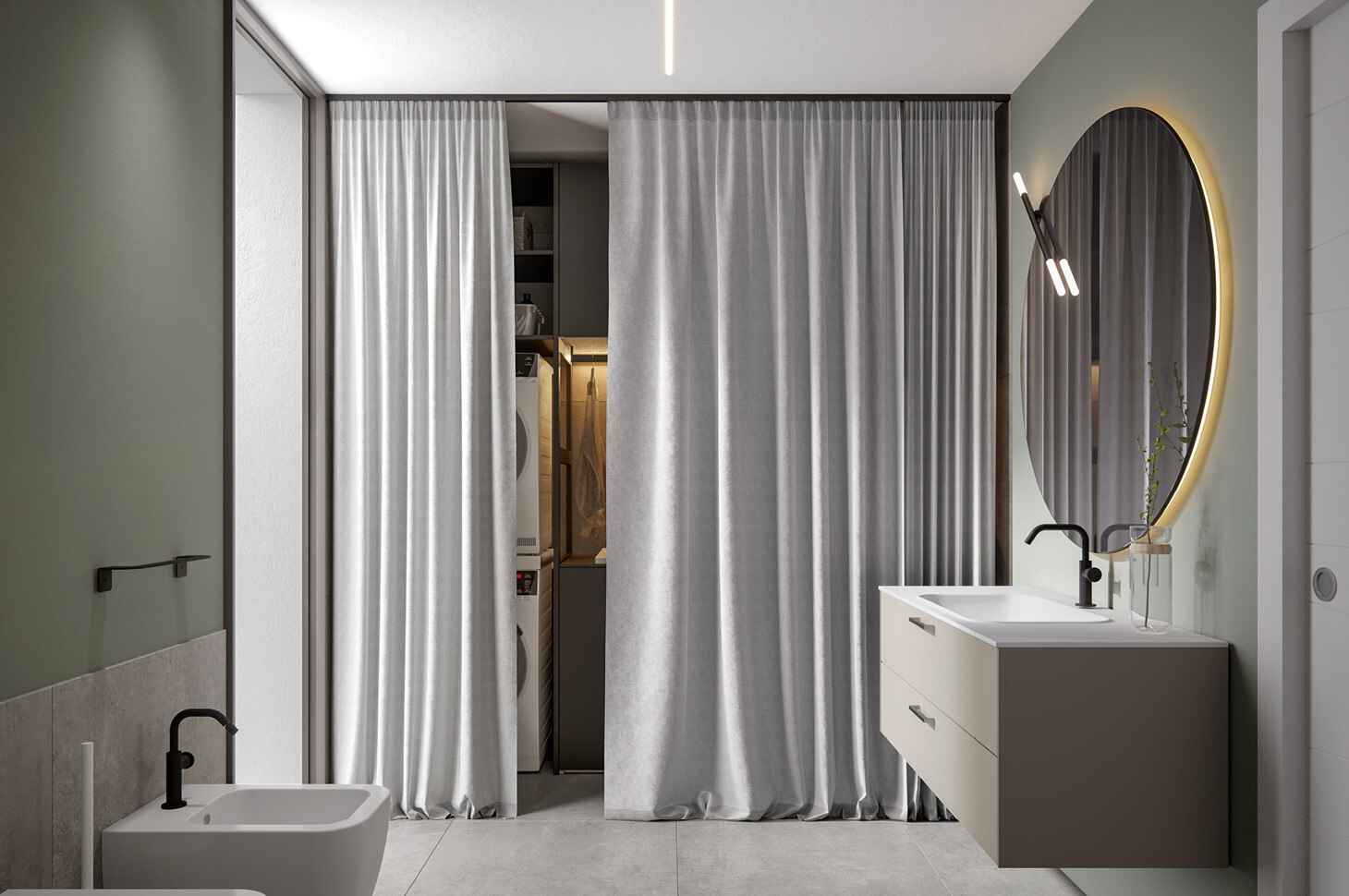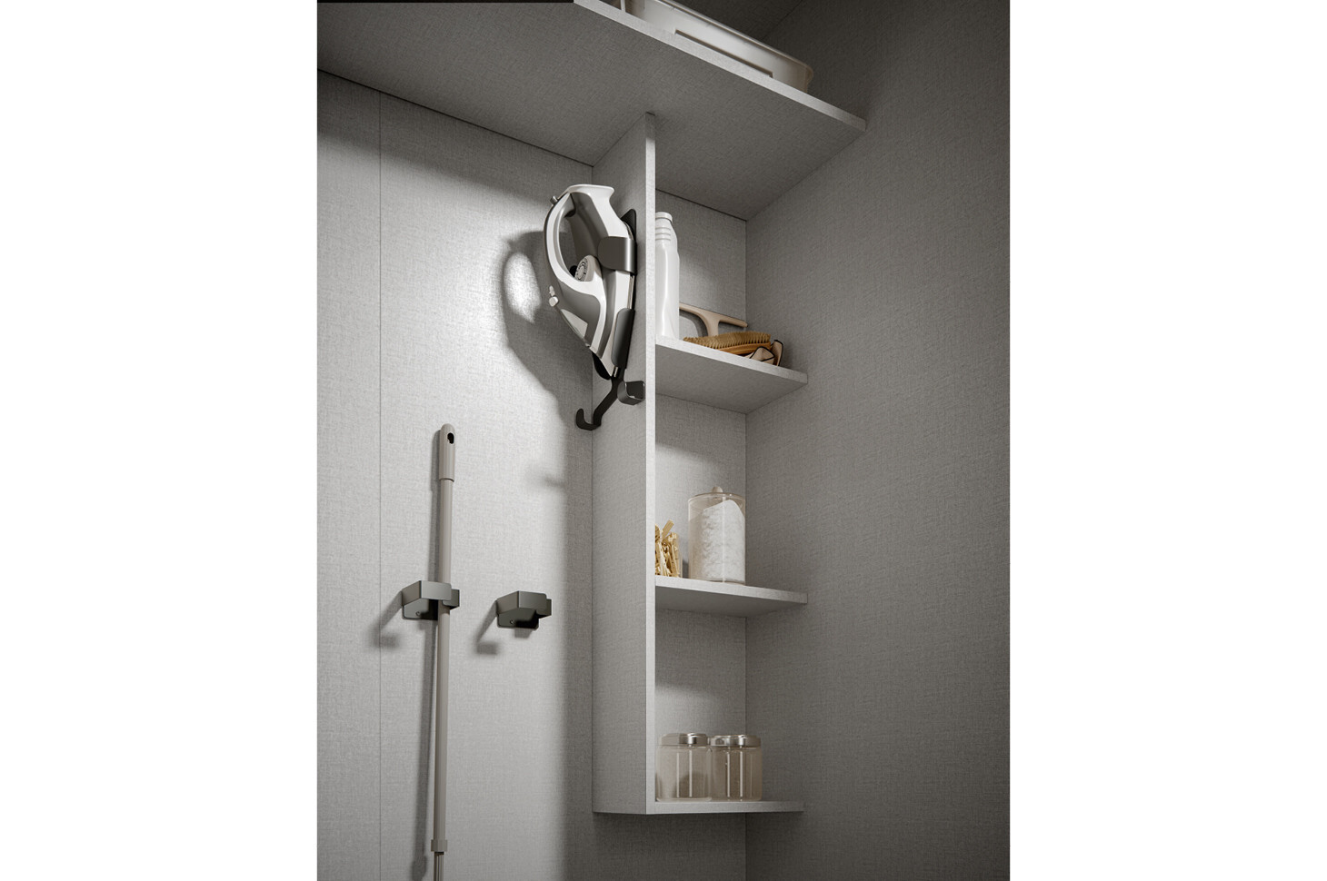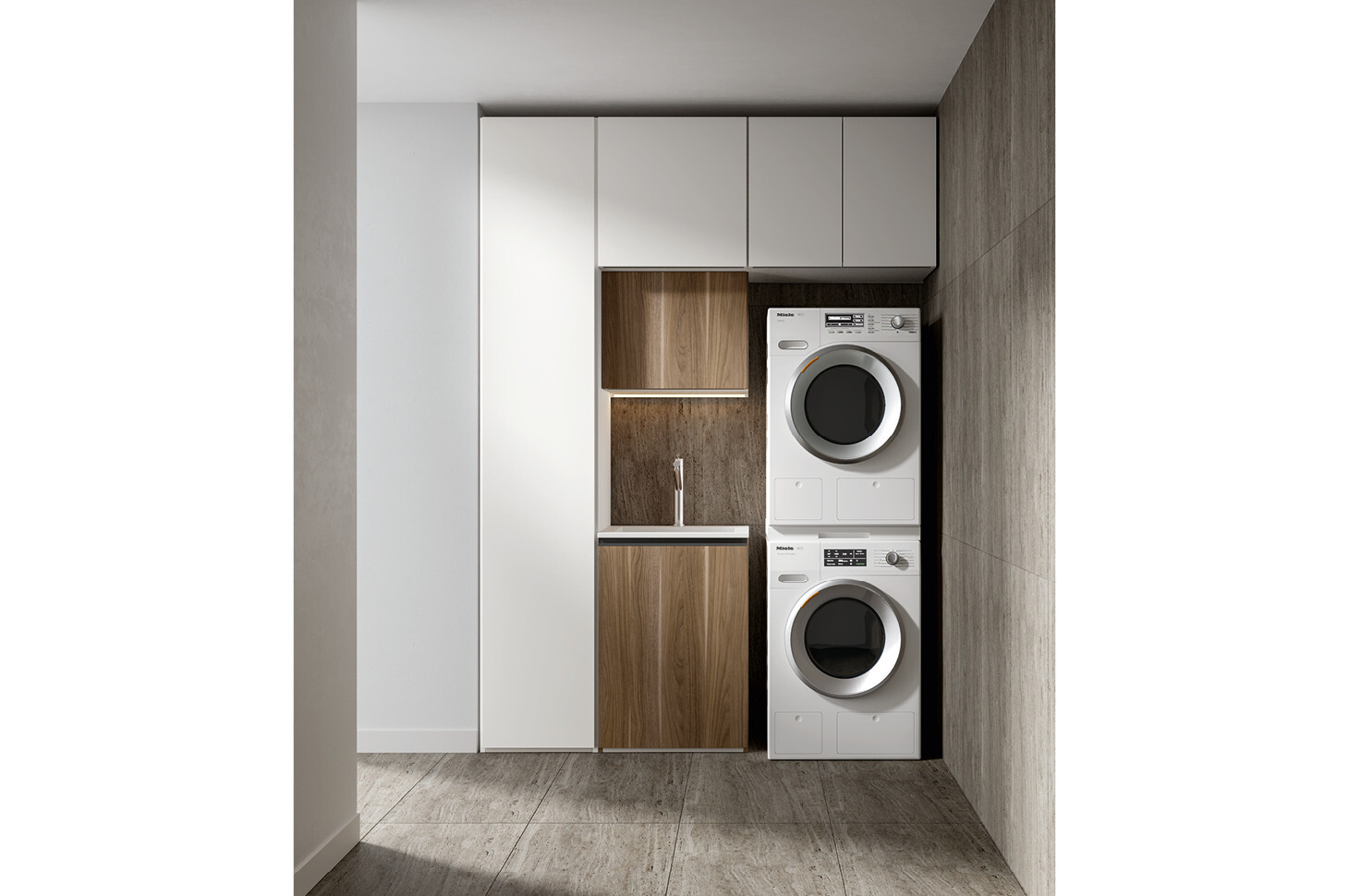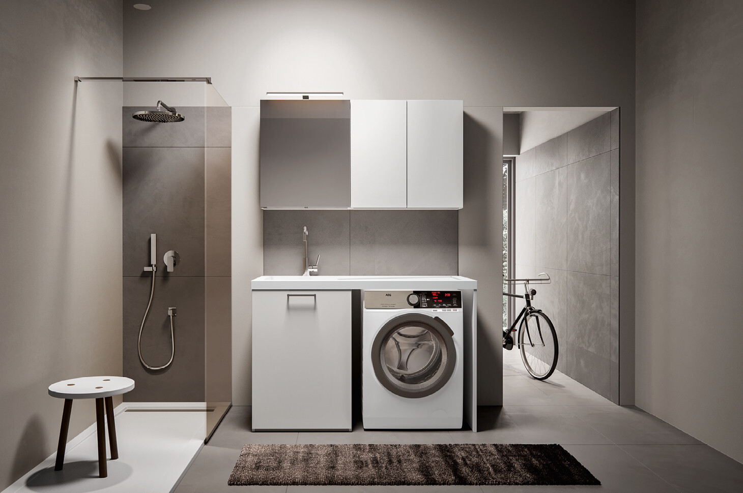 La collezione offre numerose configurazioni modulari che sfruttano al meglio ogni nicchia: basi e colonne attrezzate ospitano lavatrici e asciugatrici, mentre i moduli con vani contenitivi e luci LED sottopensile garantiscono comfort e praticità. Le tende o porte scorrevoli di copertura completano un sistema progettato per il vivere quotidiano, in cui ogni elemento contribuisce a creare spazi compatti ma completi, pensati per rispondere alle esigenze reali della vita quotidiana.