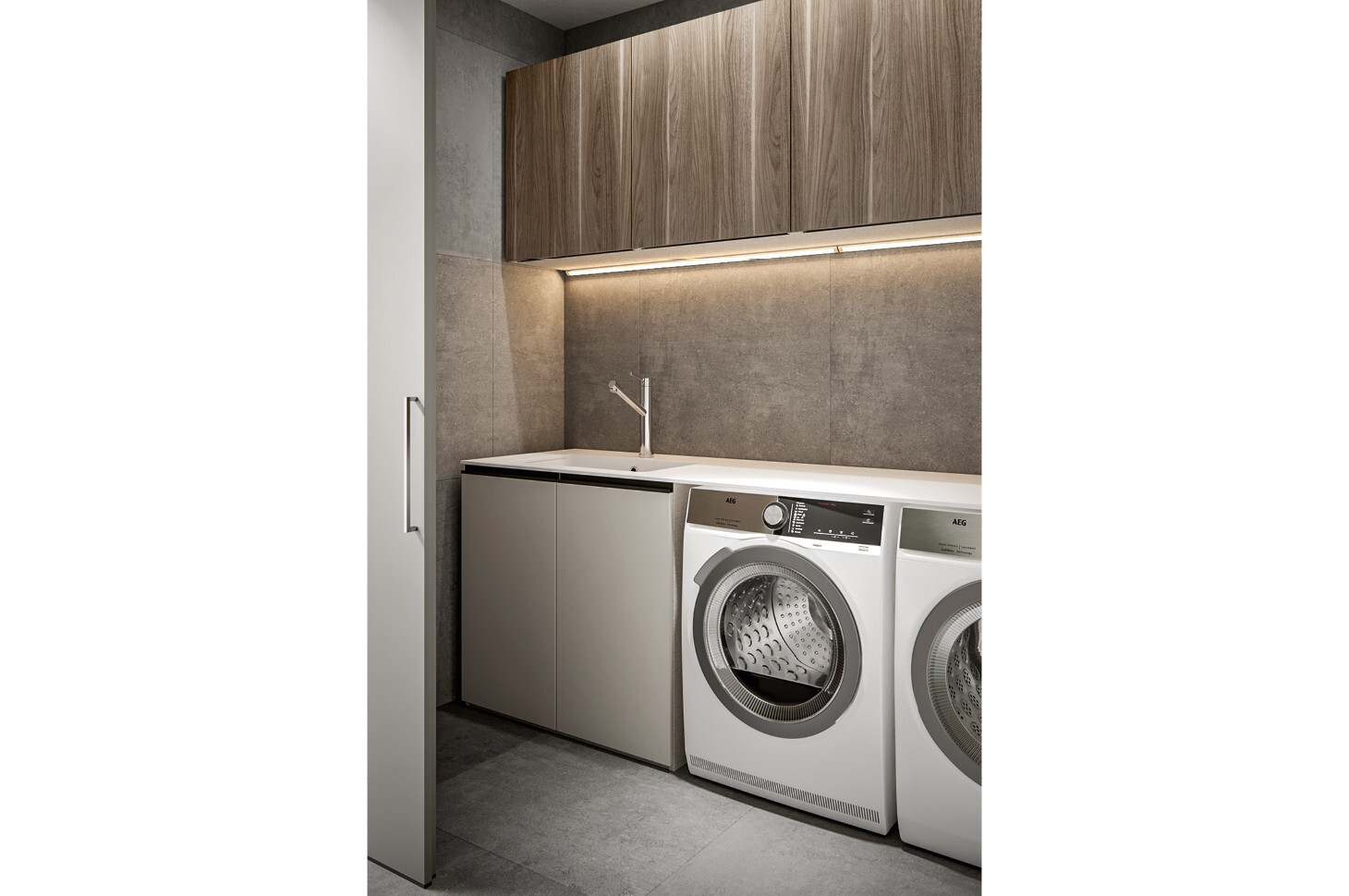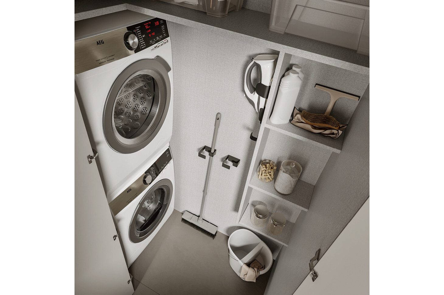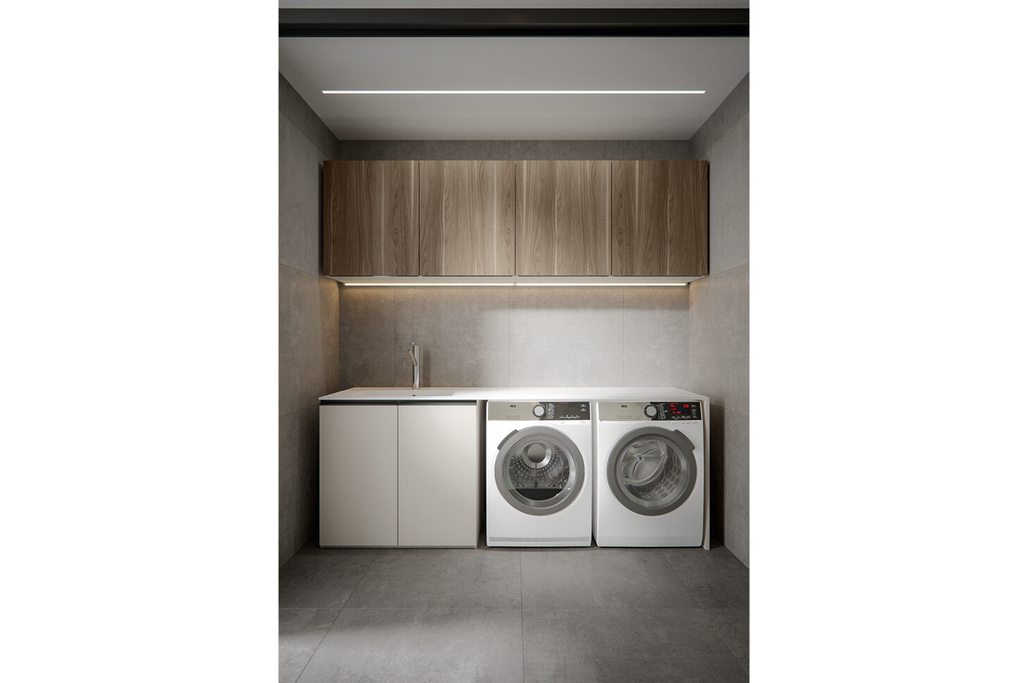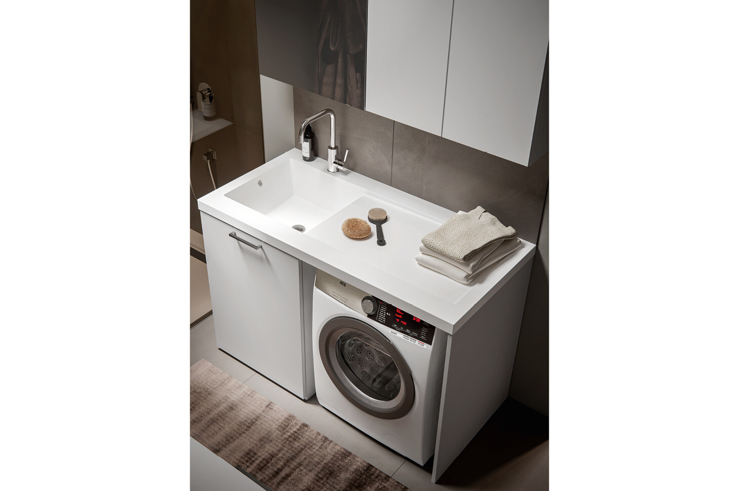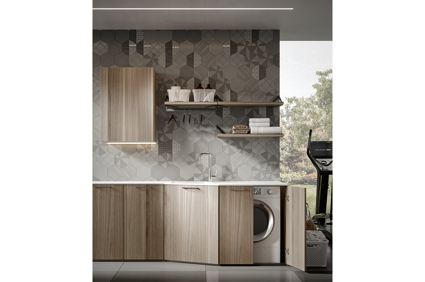 La collezione offre numerose configurazioni modulari che sfruttano al meglio ogni nicchia: basi e colonne attrezzate ospitano lavatrici e asciugatrici, mentre i moduli con vani contenitivi e luci LED sottopensile garantiscono comfort e praticità. Le tende o porte scorrevoli di copertura completano un sistema progettato per il vivere quotidiano, in cui ogni elemento contribuisce a creare spazi compatti ma completi, pensati per rispondere alle esigenze reali della vita quotidiana.