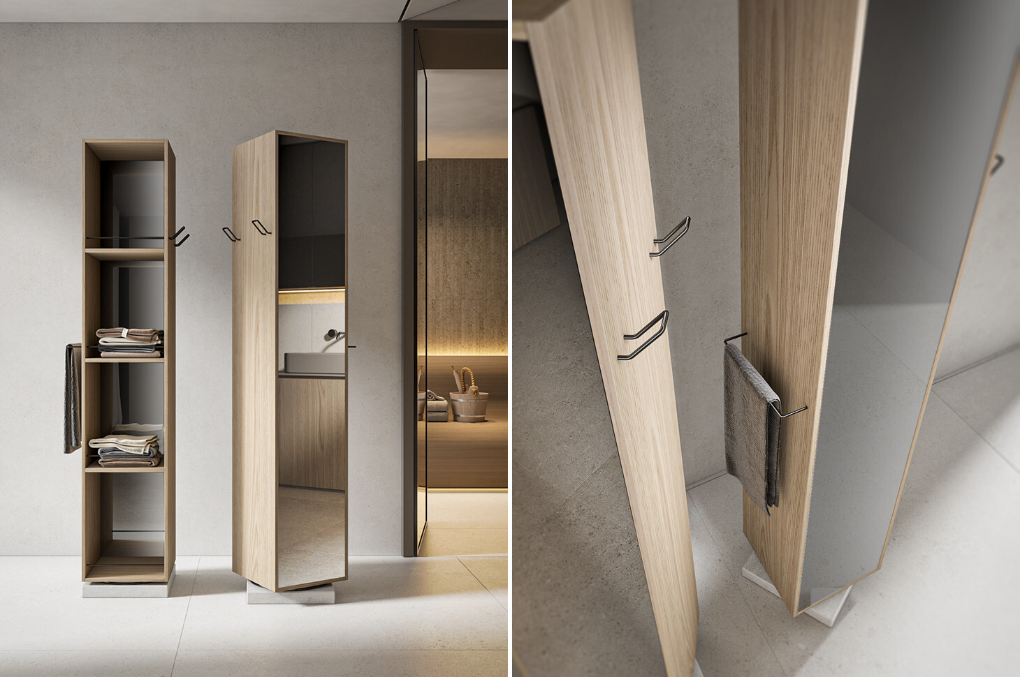 Le colonne girevoli Edoné con schiena a specchio e basamento in marmo uniscono funzione e design in un sistema compatto e sorprendente. Ruotano a 360° per offrire accesso da ogni angolazione, garantendo un utilizzo pratico e ordinato che ottimizza lo spazio e valorizza la funzionalità quotidiana.