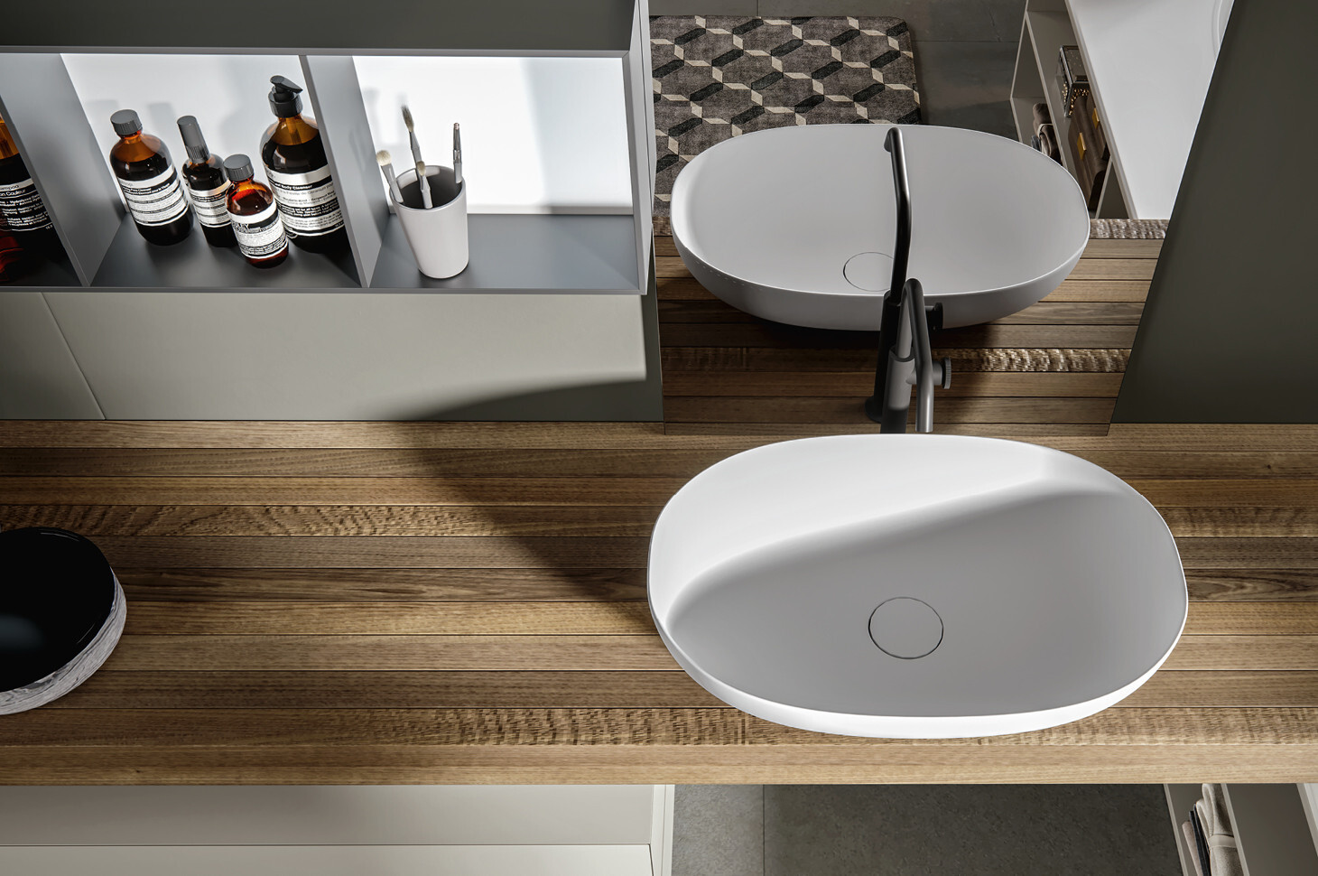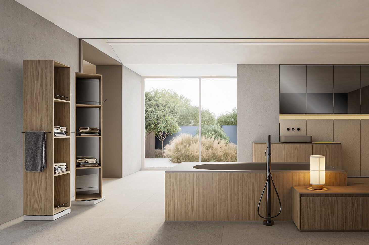La rotazione diventa esperienza: un movimento che rivela, ordina e nasconde, restituendo al bagno la perfezione dell’equilibrio tra estetica e praticità.