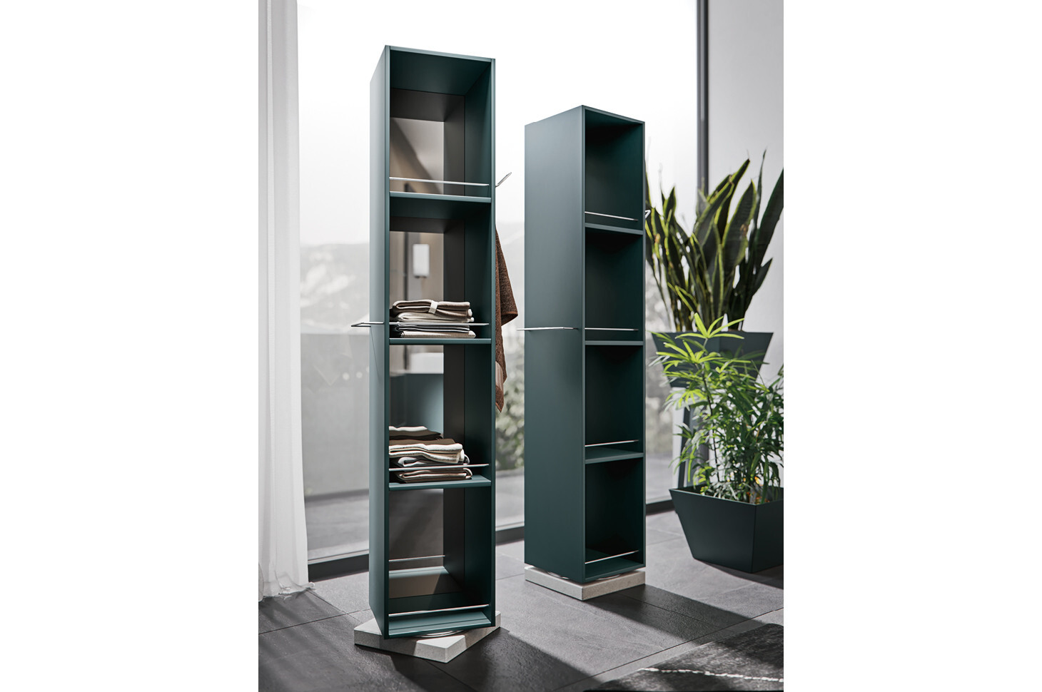 Disponibile nelle finiture laccato opaco e nelle essenze Edoné, la colonna girevole è completa di accessori cromo – con possibilità di scelta in finitura Asfalto – e basamento in marmo grigio chiaro. Alta 181 cm e con base quadrata da 34 cm, ospita uno specchio verticale bifacciale, appendini e portasalviette.