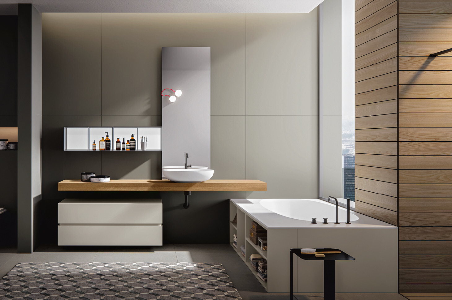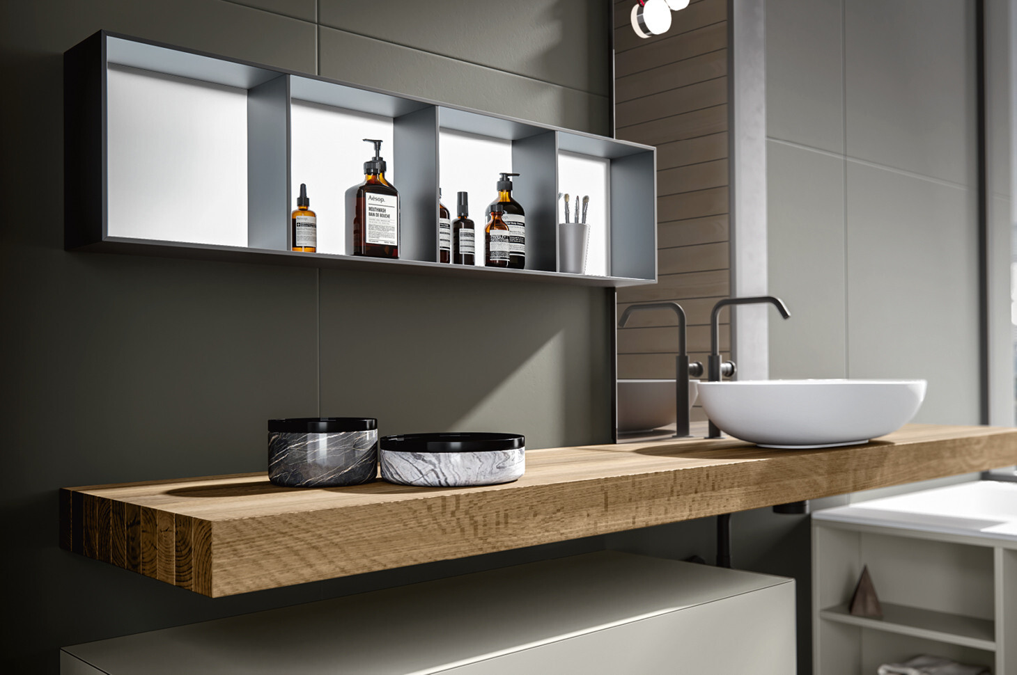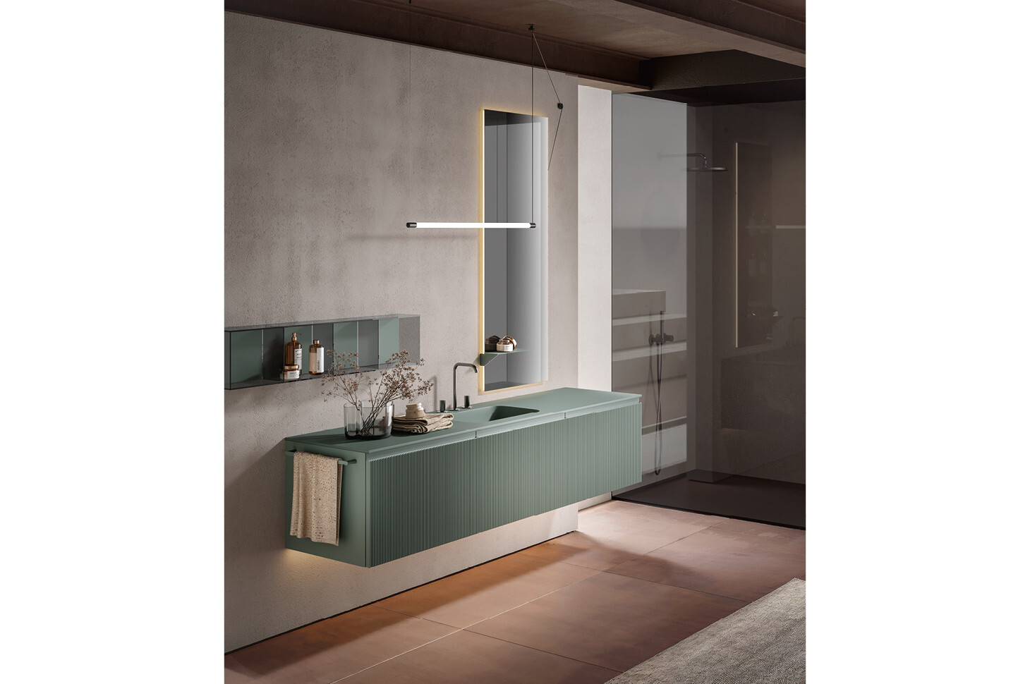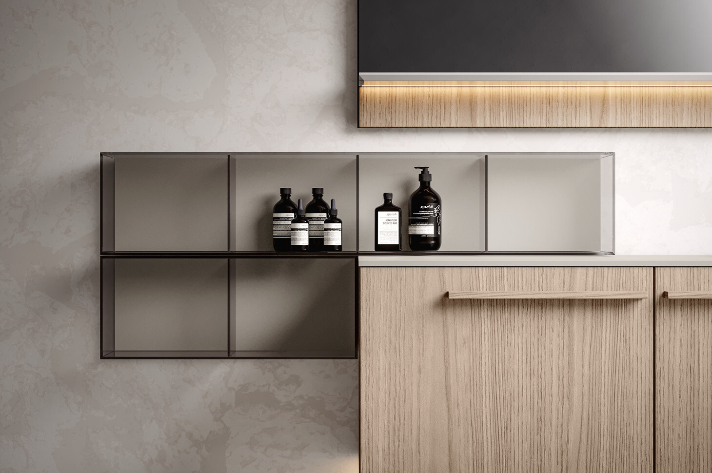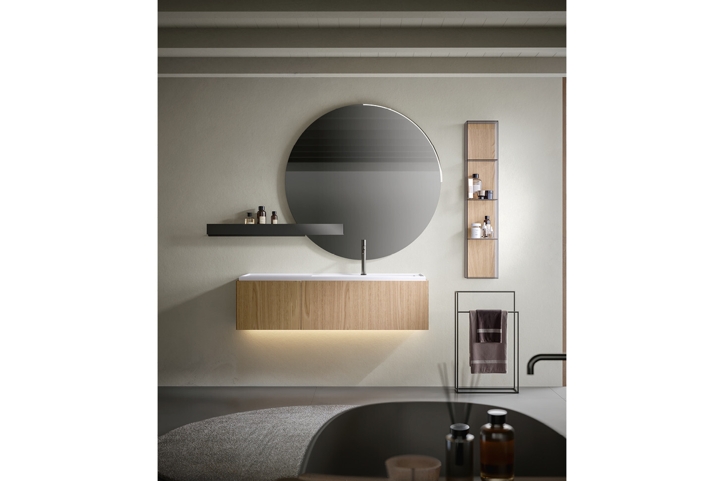 Con una profondità di soli 15 cm e lato corto da 30 cm, sono disponibili in quattro misure – 30, 60, 90 e 120 cm – e, su richiesta, retroilluminate con luce LED, perfetta per creare un’atmosfera morbida e donare personalità alla composizione. Elementi sottili che si integrano ai mobili principali, offrono soluzioni precise e funzionali per ogni configurazione progettuale.