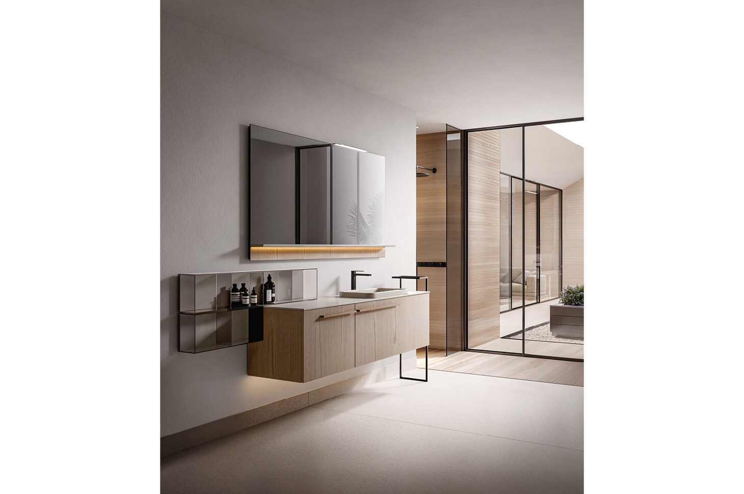 La loro caratteristica distintiva è lo schienale personalizzabile nelle finiture laccato opaco o lucido, essenze, nobilitati e Natural Wood, così da creare un raffinato effetto total color coordinato al resto dell’arredo. Le superfici trasparenti e i profili sottili creano un gioco di riflessi amplificando la percezione dello spazio, valorizzando la luce e garantendo una coerenza visiva con l’intero progetto bagno.