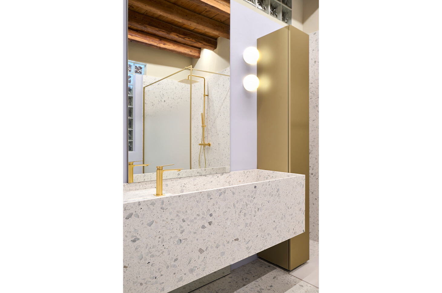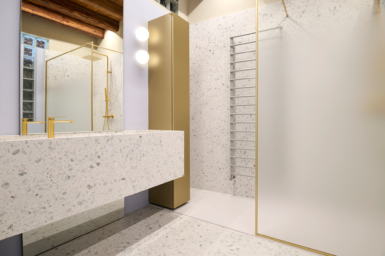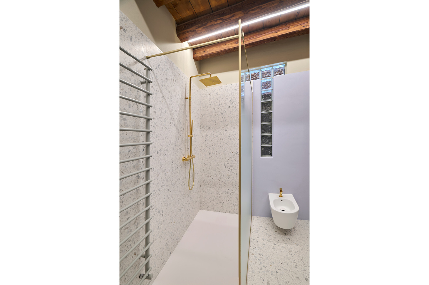 Sì: nel bagno ospiti la pianta irregolare ci ha portati a progettare un piatto doccia trapezoidale Giove in edotek cemento (collezione Wellness), con scarico laterale e griglia in tinta. La flessibilità del brand è stata determinante per adattare misure e geometrie all’ambiente, mantenendo continuità estetica e funzionale con la colonna Bath living finitura gold metal opaco e garantendo un insieme coerente, senza compromessi.