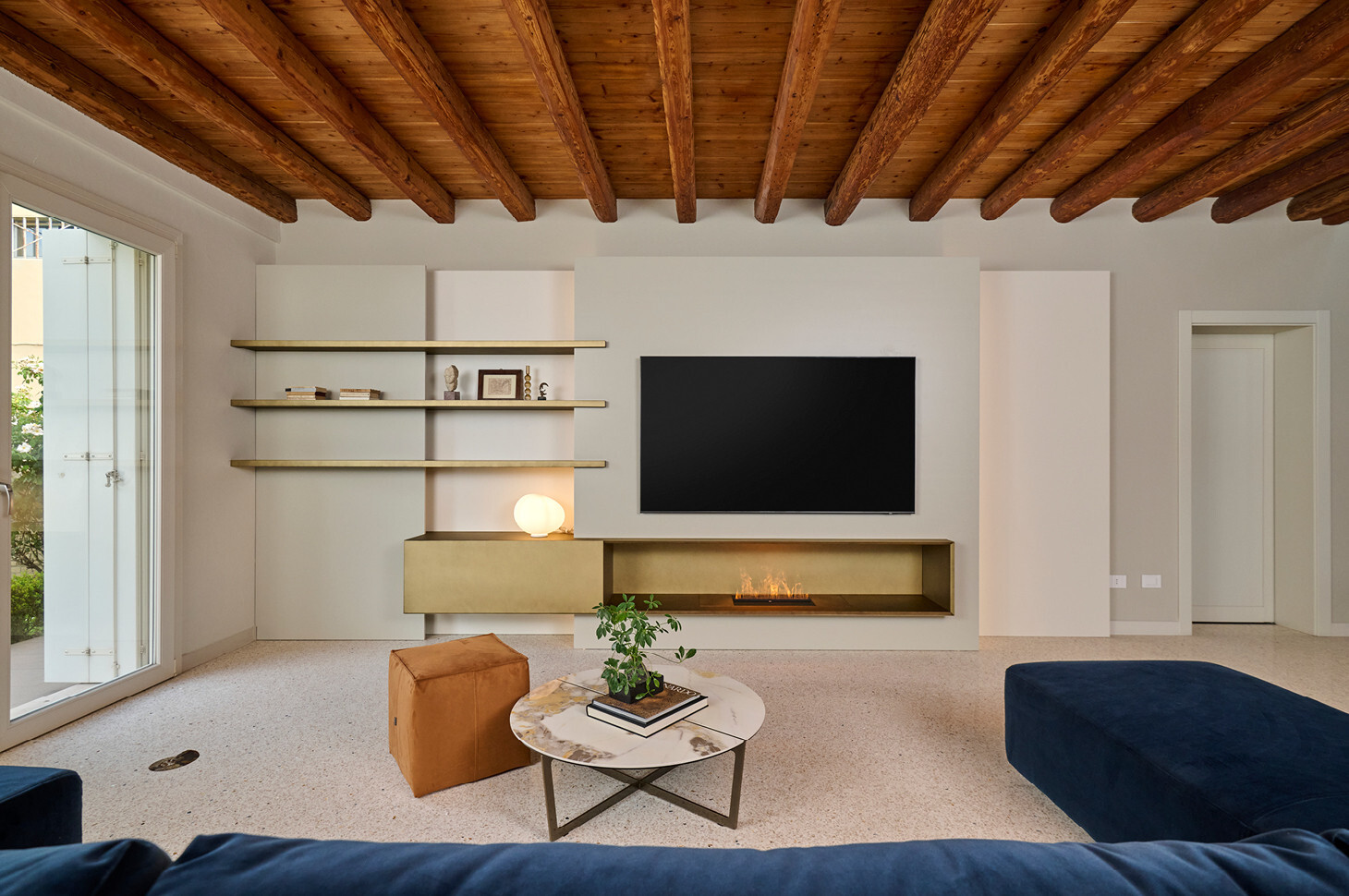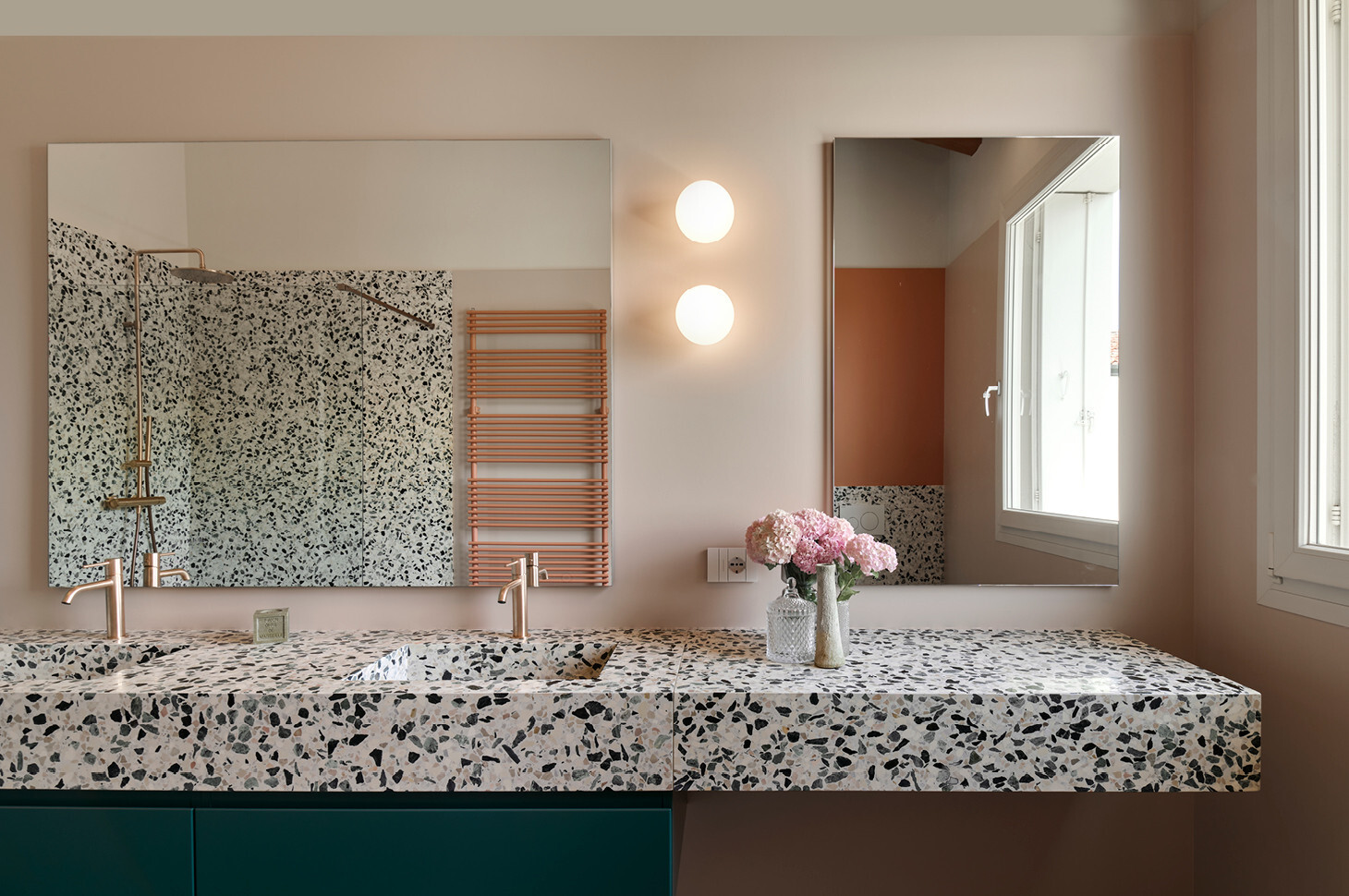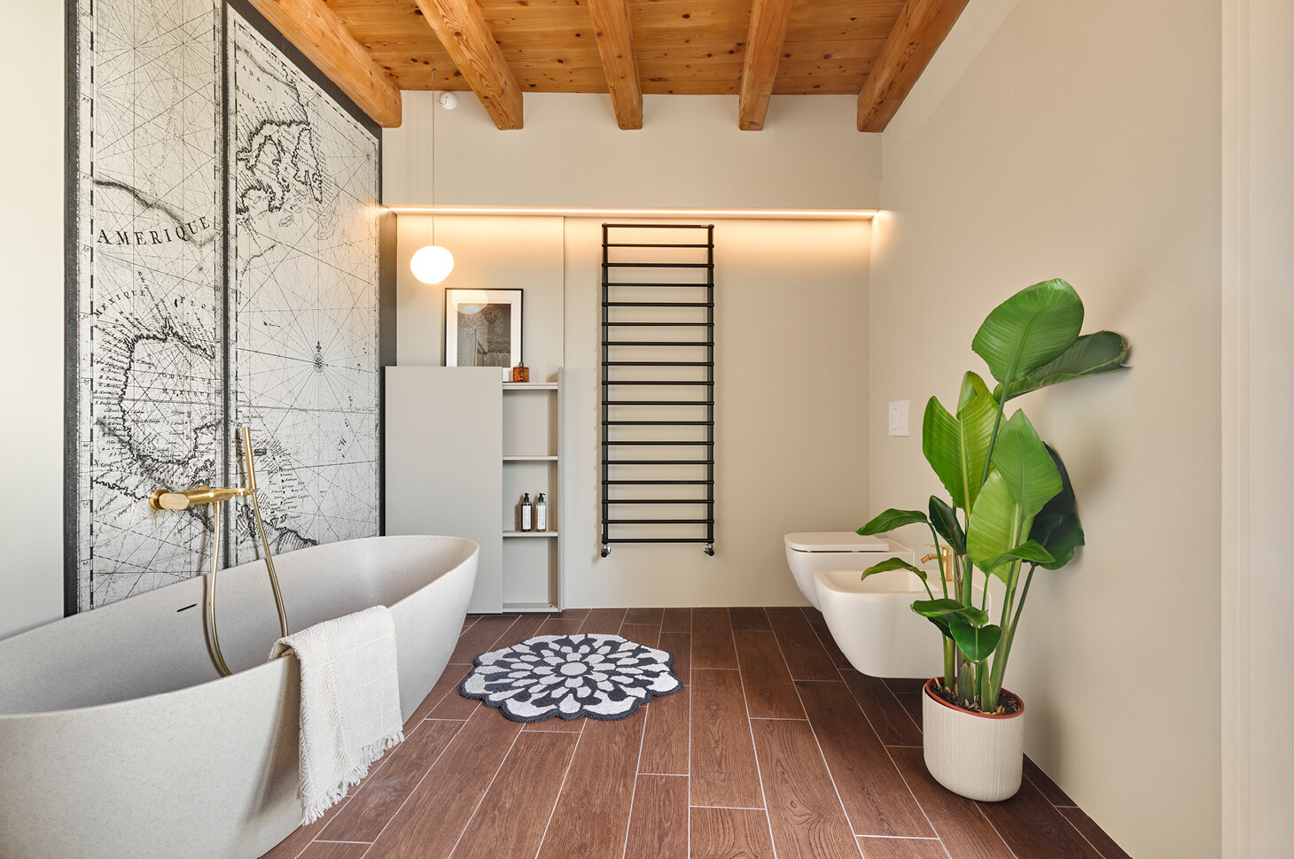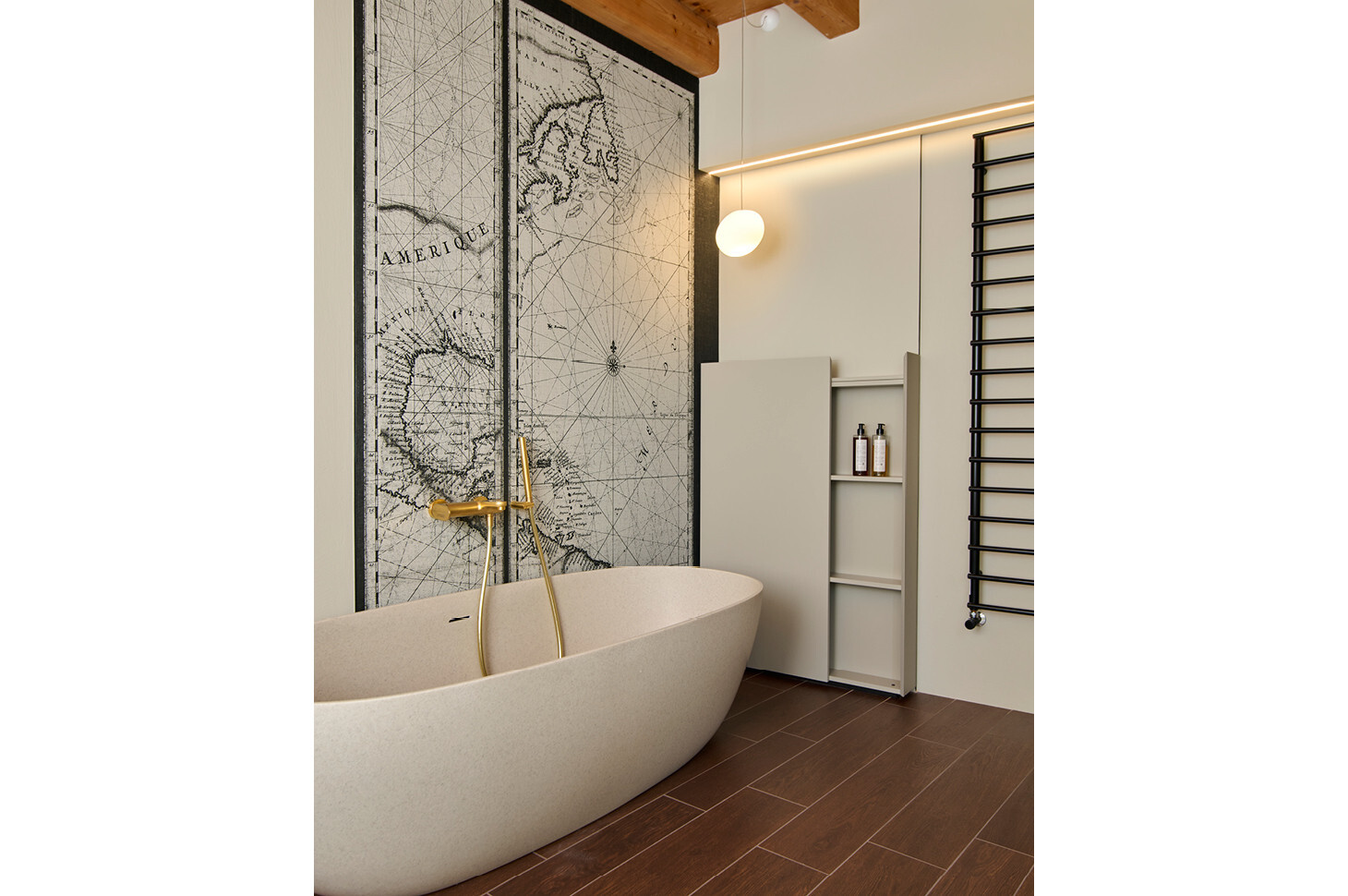 Sì: nel bagno ospiti la pianta irregolare ci ha portati a progettare un piatto doccia trapezoidale Giove in edotek cemento (collezione Wellness), con scarico laterale e griglia in tinta. La flessibilità del brand è stata determinante per adattare misure e geometrie all’ambiente, mantenendo continuità estetica e funzionale con la colonna Bath living finitura gold metal opaco e garantendo un insieme coerente, senza compromessi.