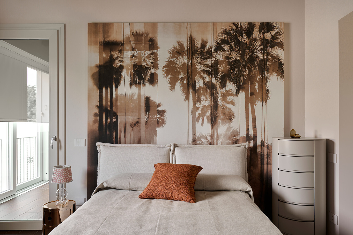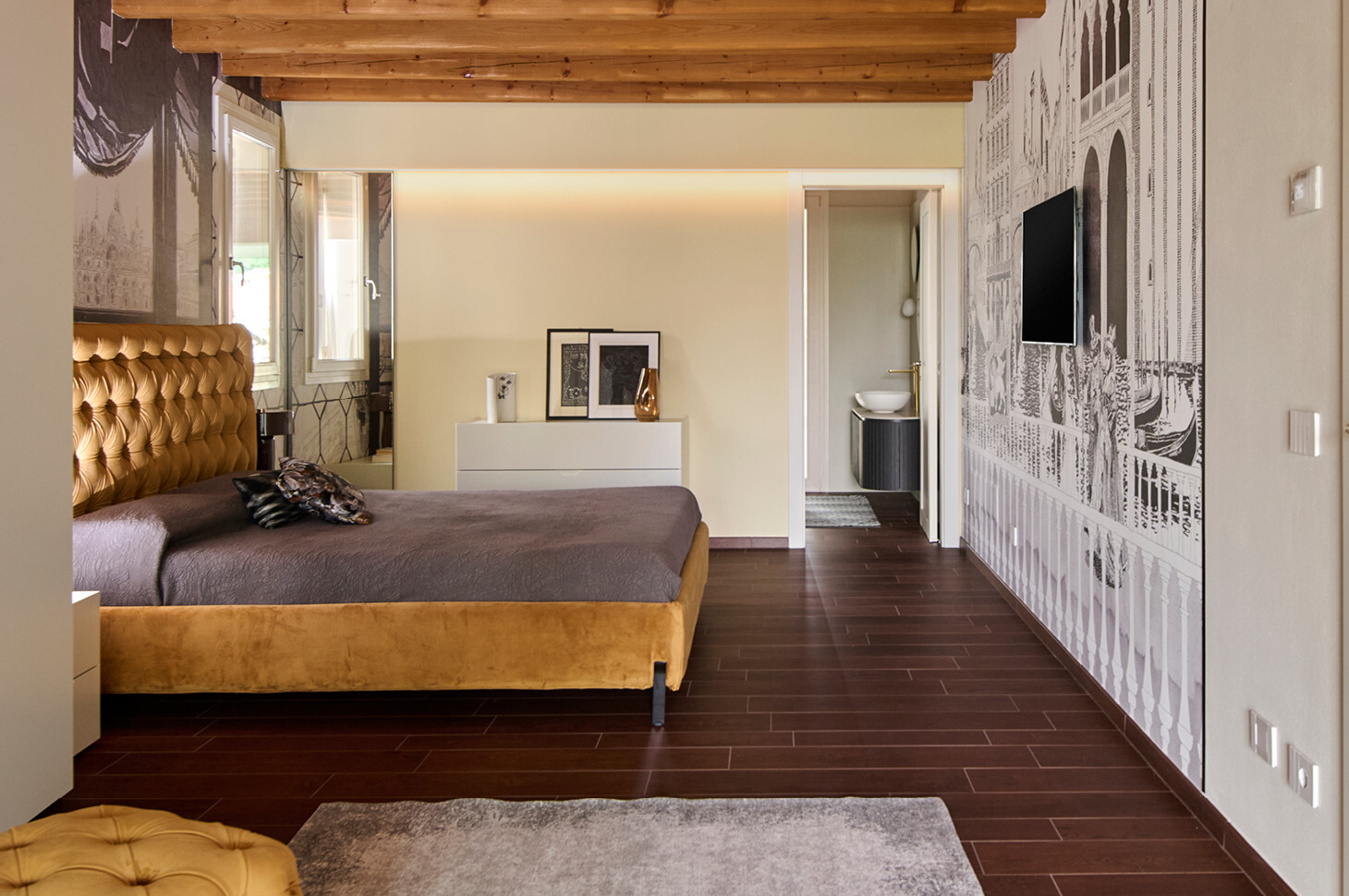Nel bagno padronale il dialogo tra gli elementi scelti crea un equilibrio misurato tra tattilità e ordine.