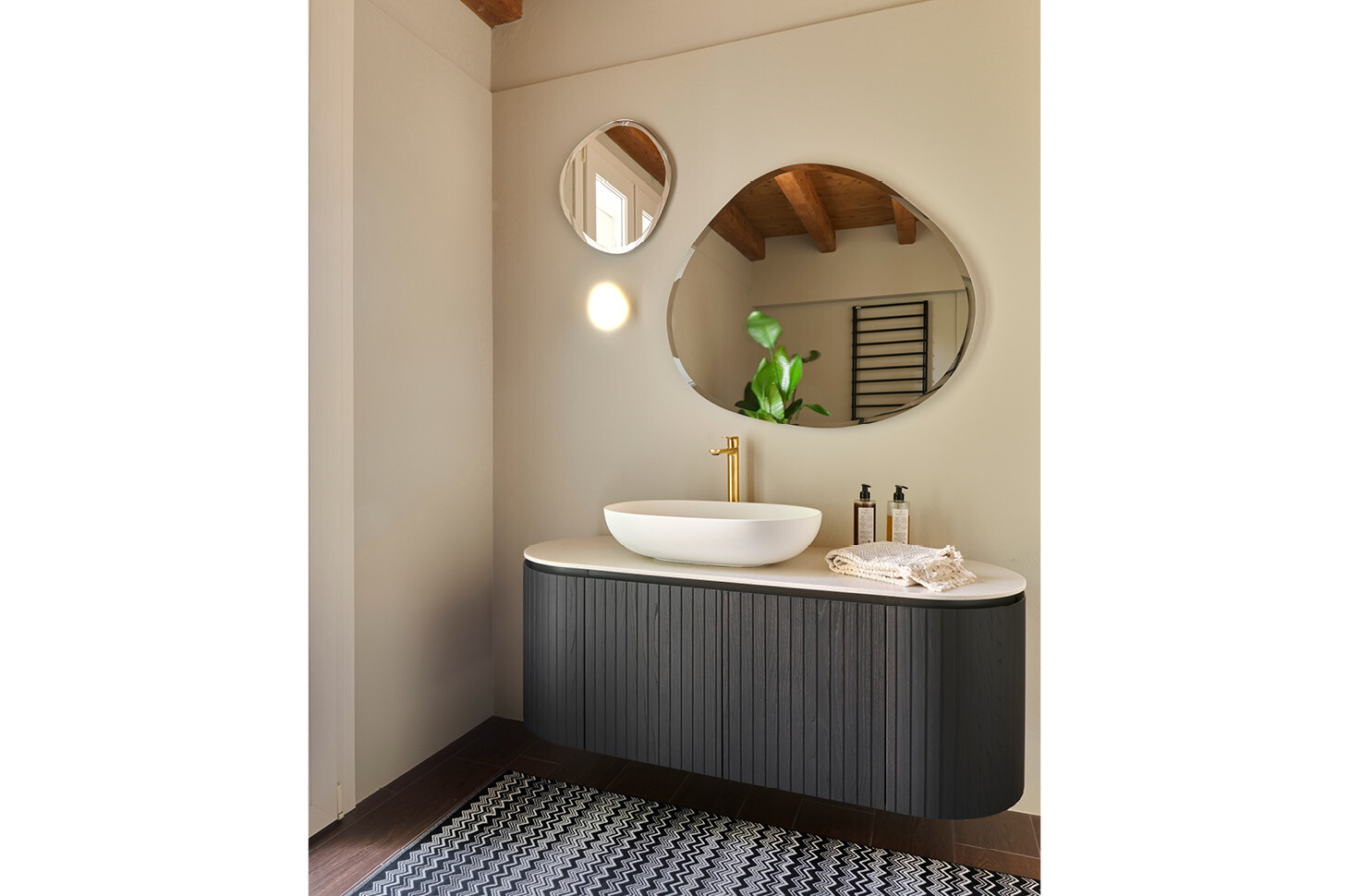 Mobile CALIPSO circular, finitura Texture Veneziana in essenza Fuliggine, con top in Grit Stone Sabbia, lavabo in appoggio Amoyo stonematt, specchiere irregolari con bisello.
